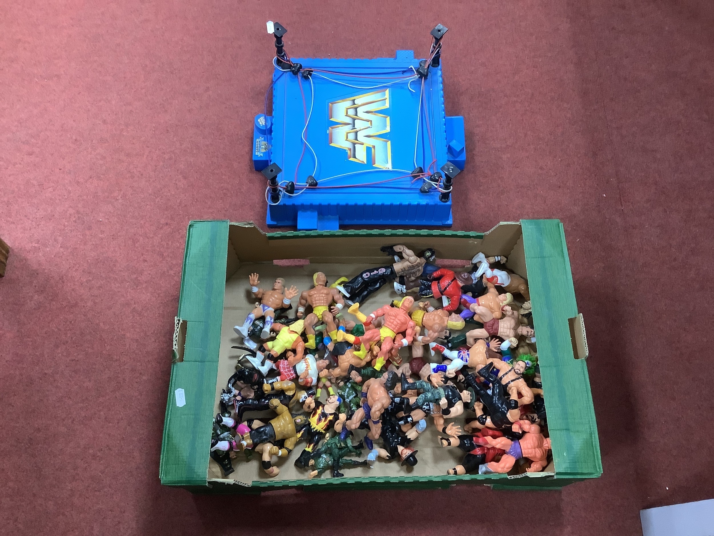 Approximately Thirty Five WWF/WWE Plastic Action Wrestling Figures by Hasbro, Jakks Pacific to include Papa Shango, Hulk Hogan, Lex Luger, Bam Bam Bigelow, Tatanka, Bret Hitman Hart, Iron Sheik, Sgt. Slaughter, Samu Headshrinker. Plus a WWF Wrestling Champion Ring, All playworn.