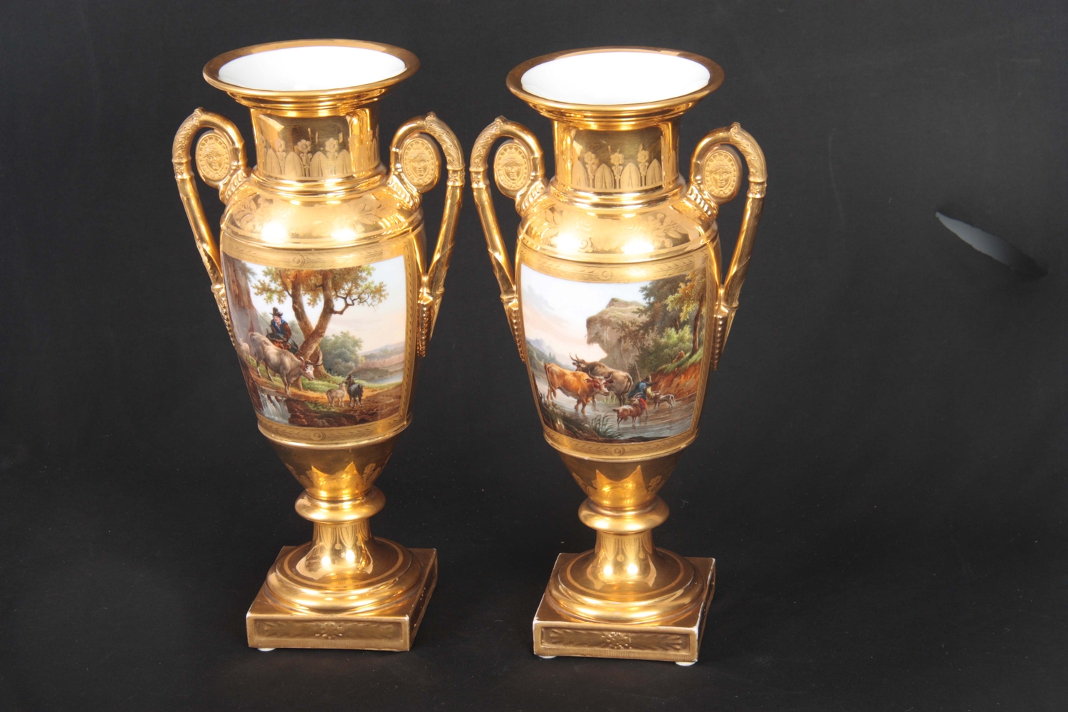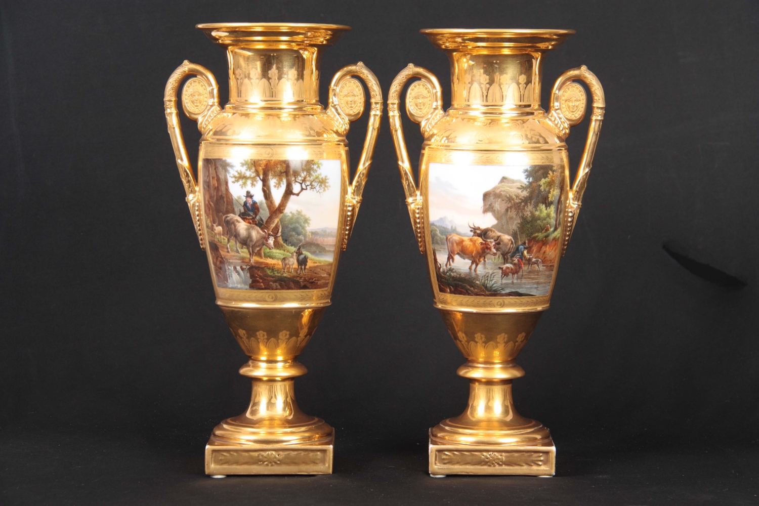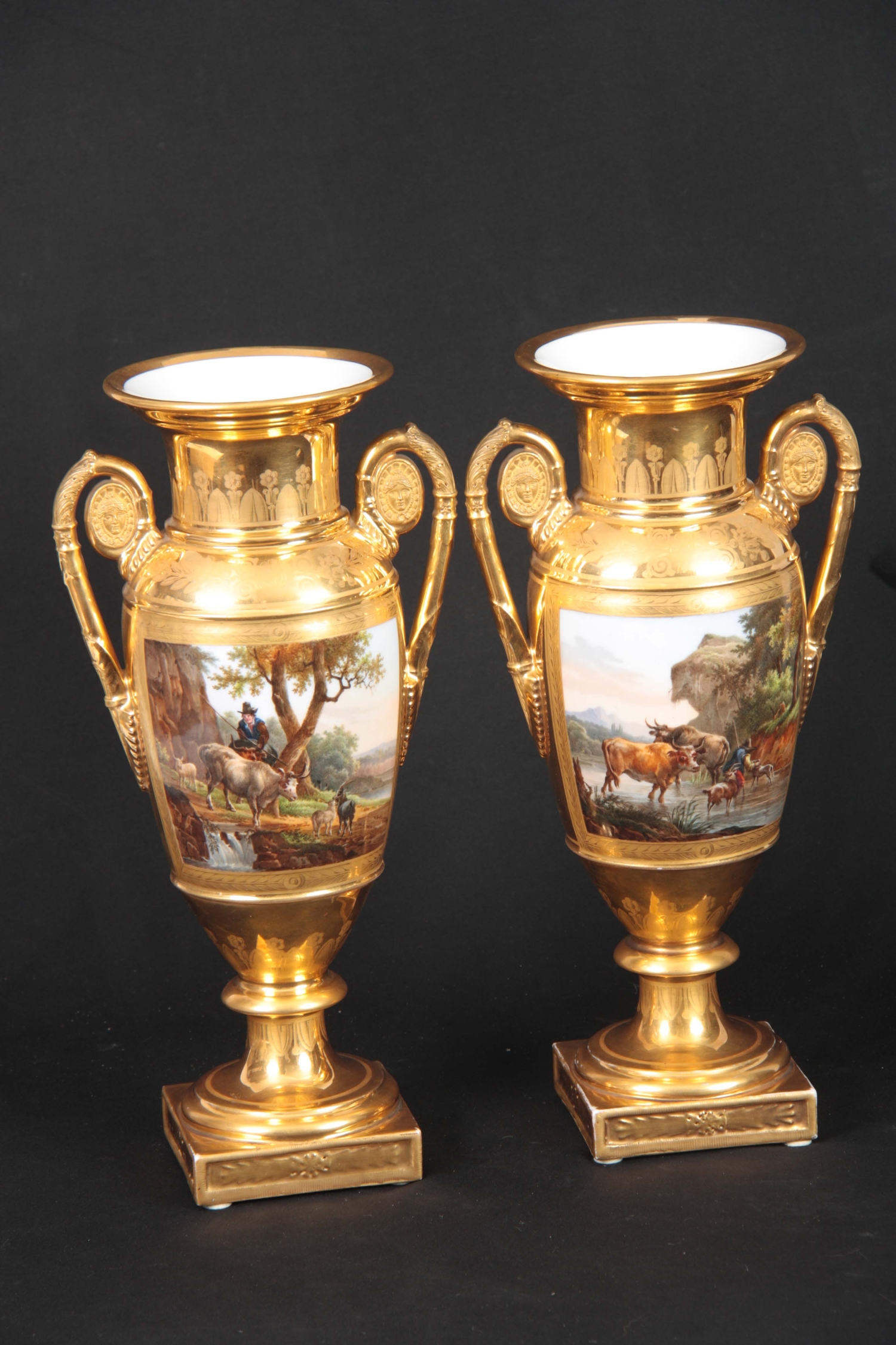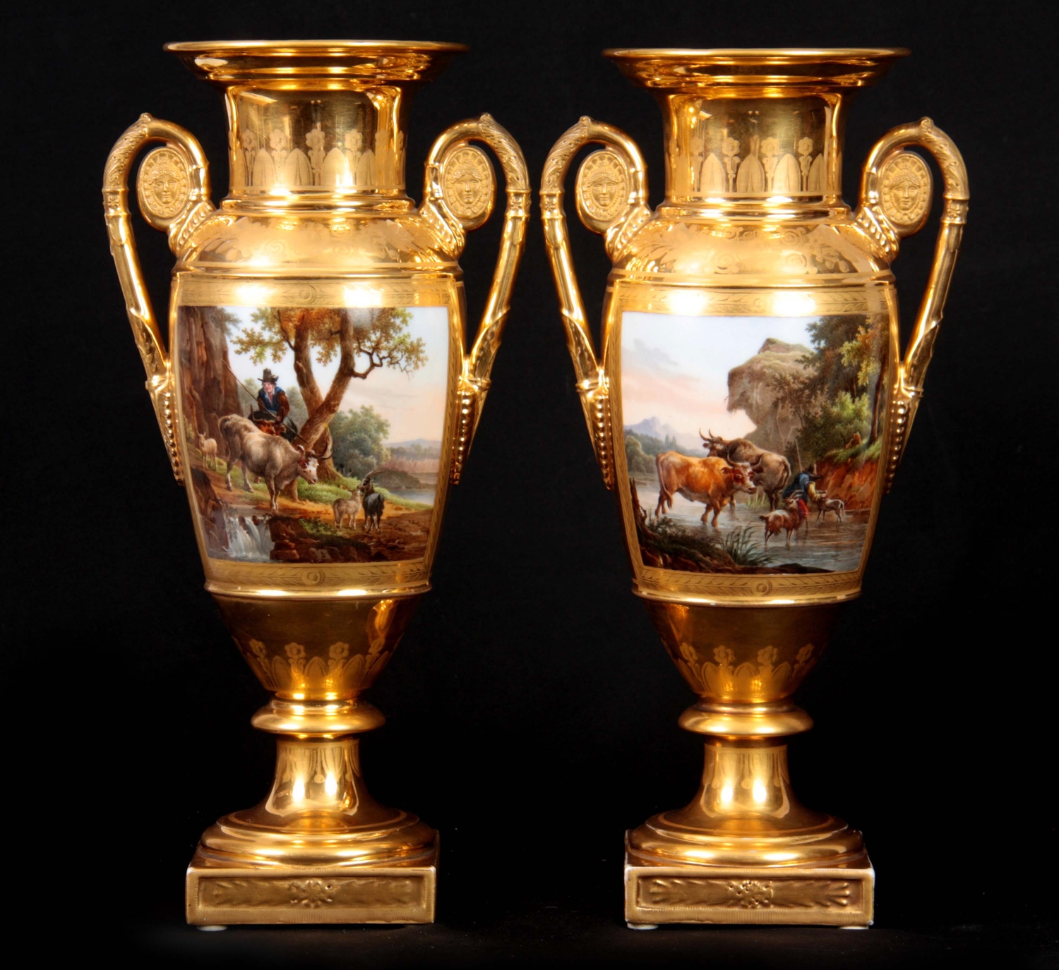 A PAIR OF EARLY 19TH CENTURY FRENCH EMPIRE PORCELAIN VASES of classical urn-shape with medallion-set acanthus leaf side handles enclosing burnished gilt bodies decorated with matt leaf work borders enclosing painted land and riverscape panels with figures, cattle and goats 37cm high