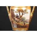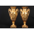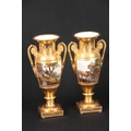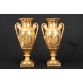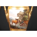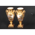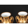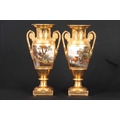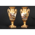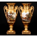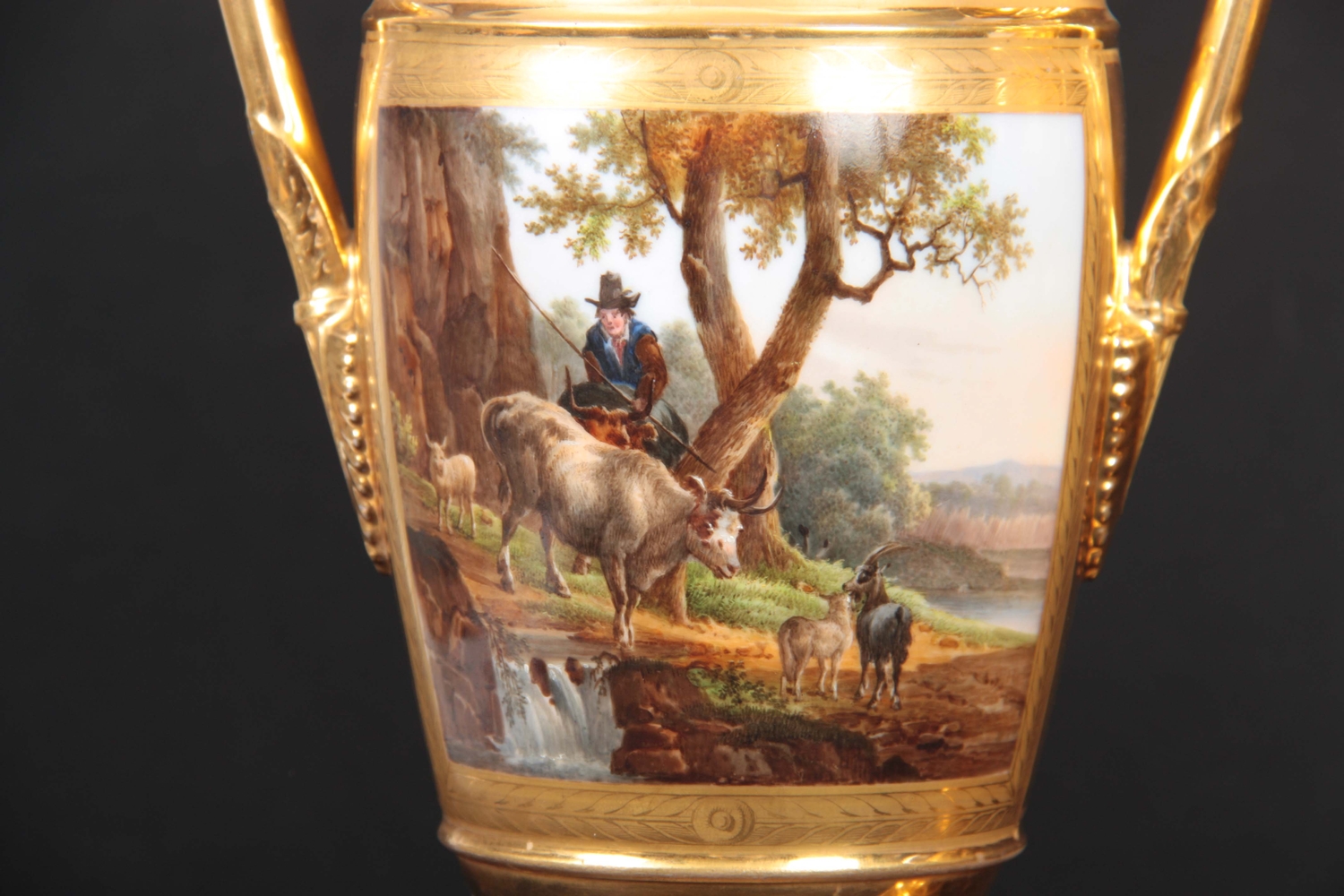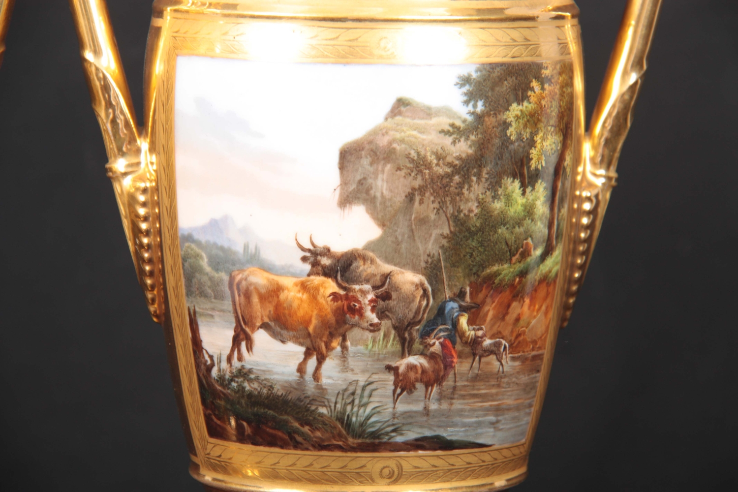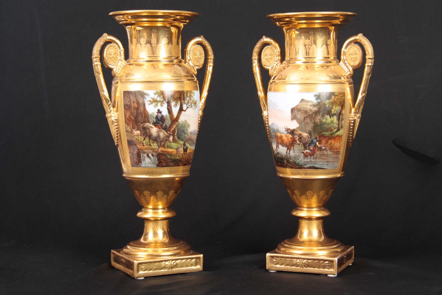 A PAIR OF EARLY 19TH CENTURY FRENCH EMPIRE PORCELAIN VASES of classical urn-shape with medallion-set acanthus leaf side handles enclosing burnished gilt bodies decorated with matt leaf work borders enclosing painted land and riverscape panels with figures, cattle and goats 37cm high