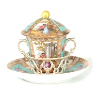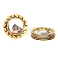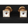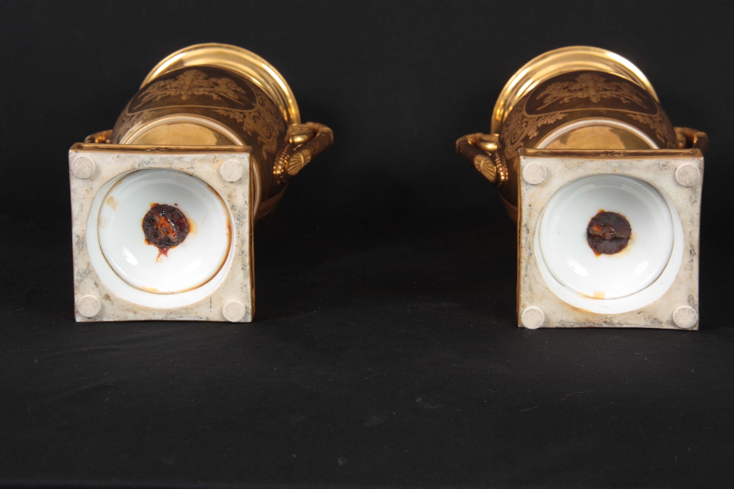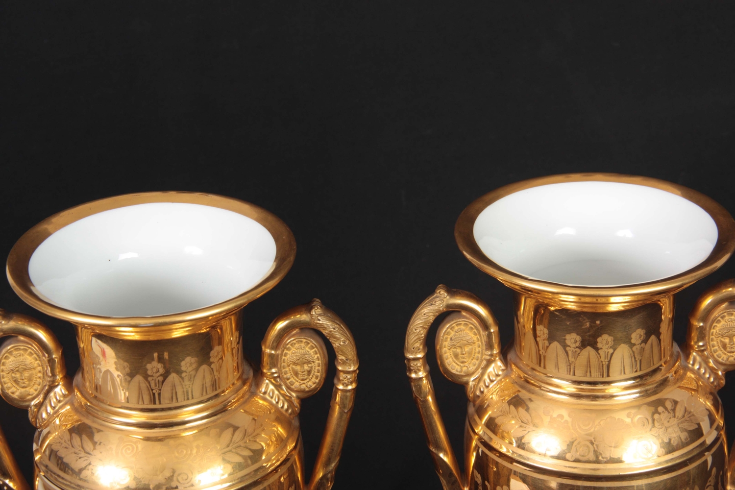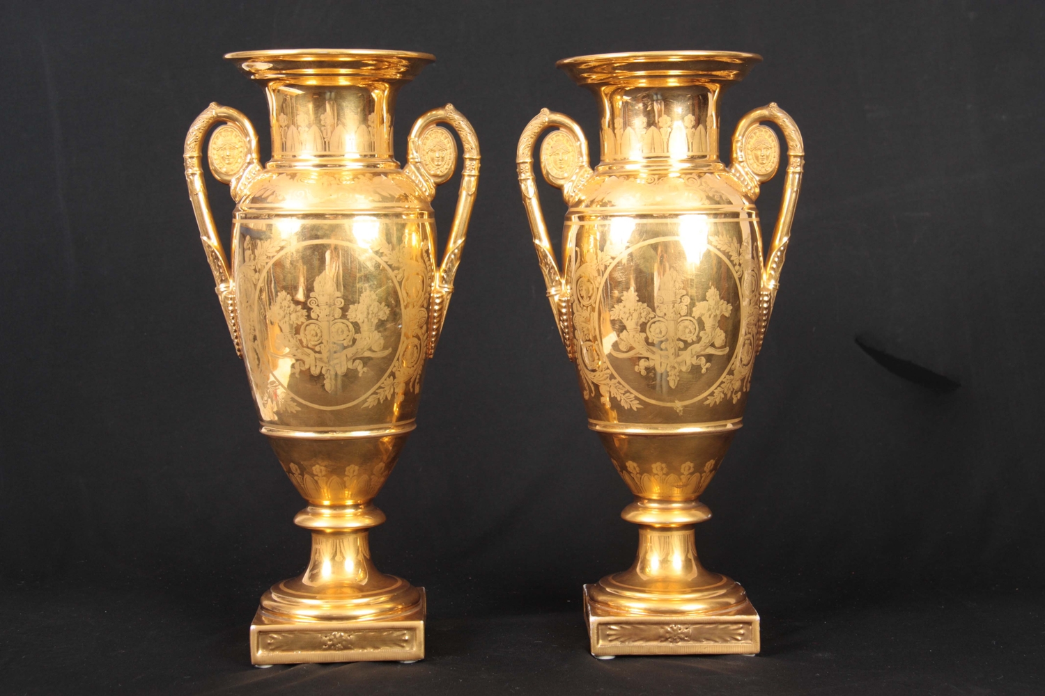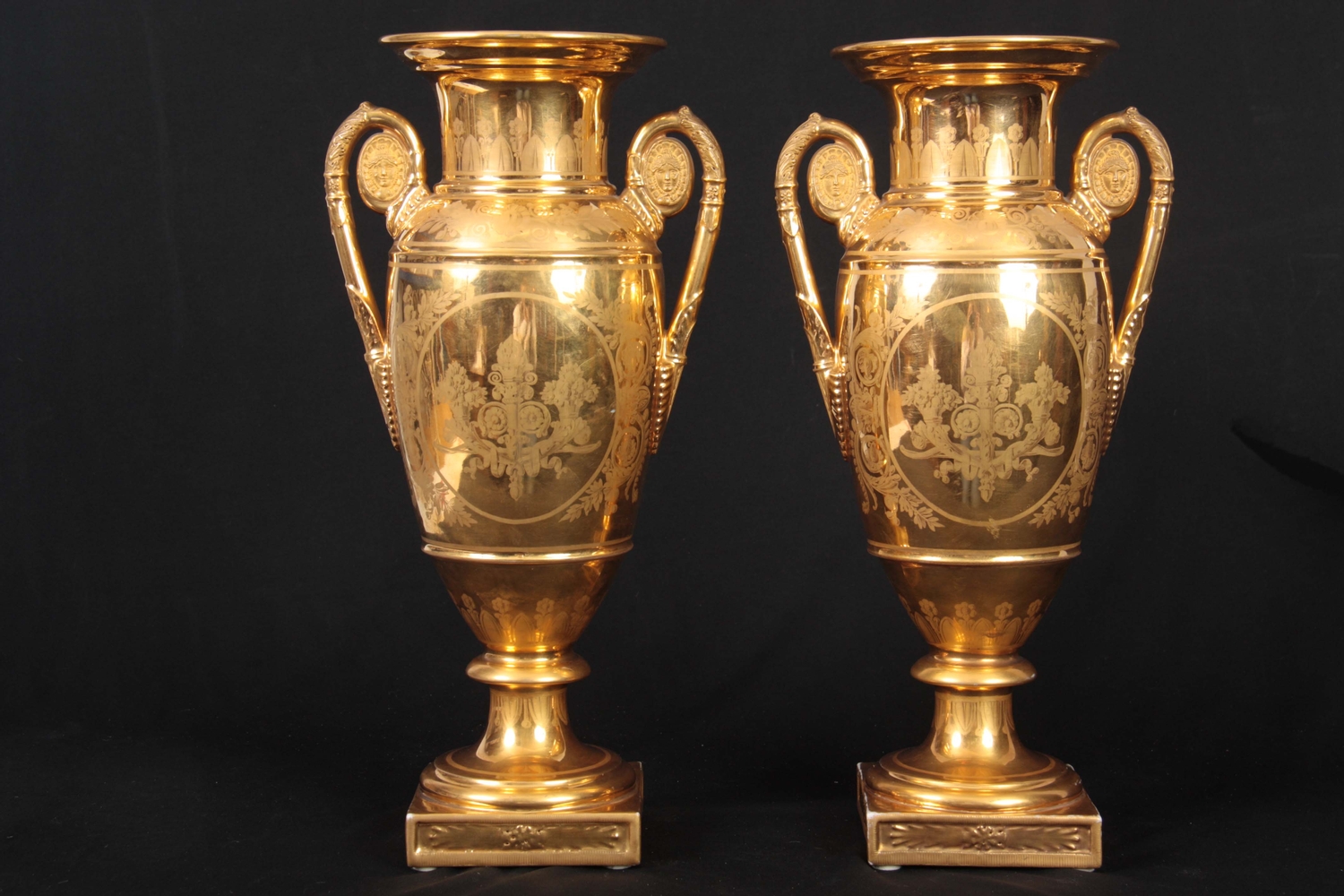 A PAIR OF EARLY 19TH CENTURY FRENCH EMPIRE PORCELAIN VASES of classical urn-shape with medallion-set acanthus leaf side handles enclosing burnished gilt bodies decorated with matt leaf work borders enclosing painted land and riverscape panels with figures, cattle and goats 37cm high