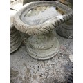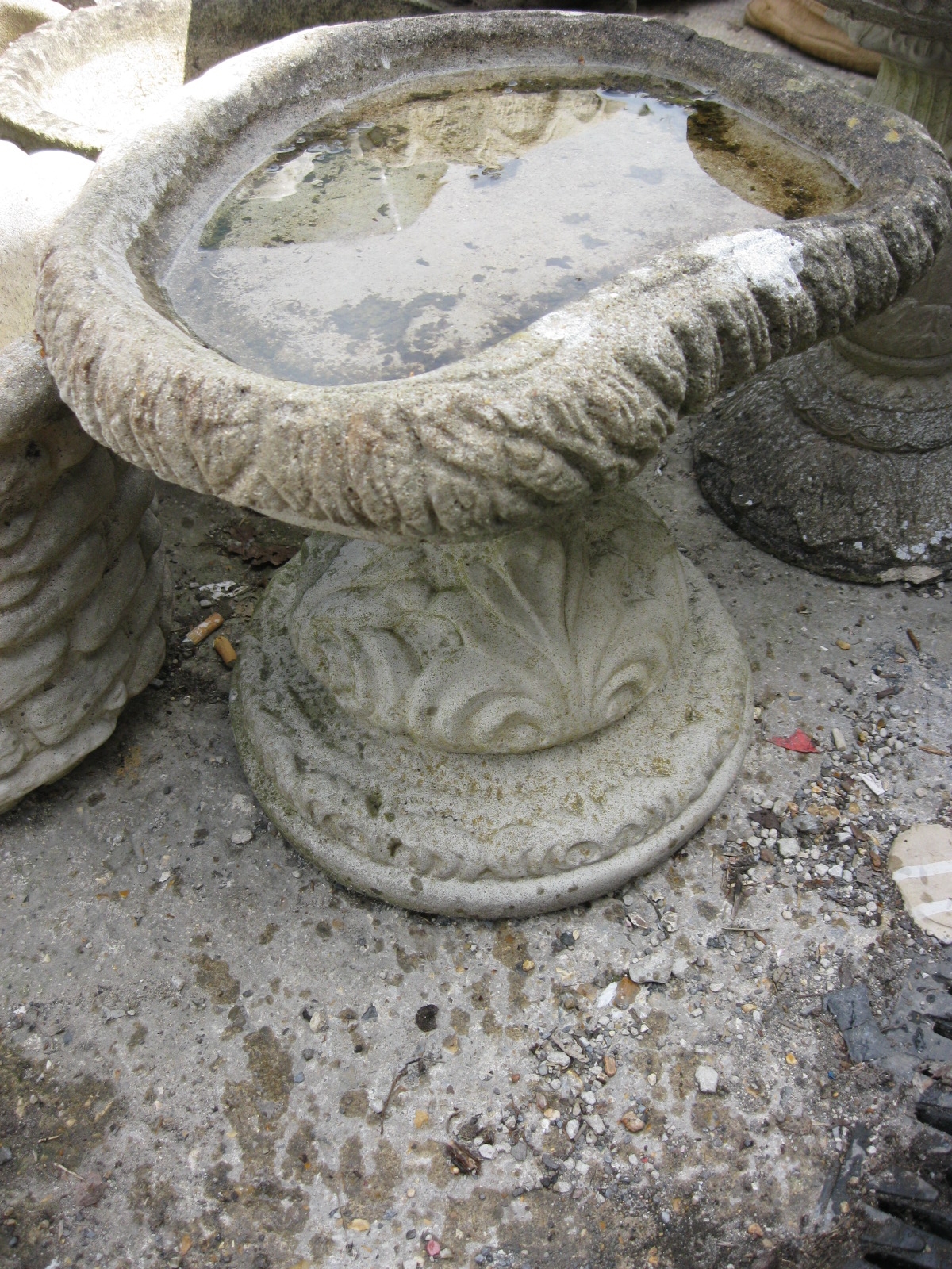 A small stonecrete garden bird bath on pedestal, weathered, in good order
