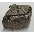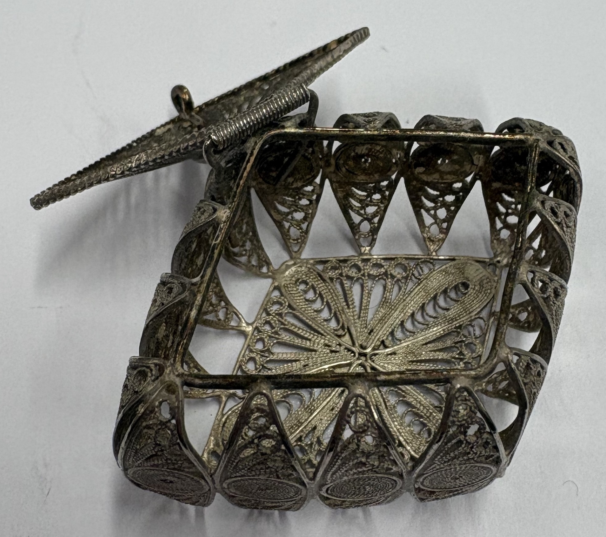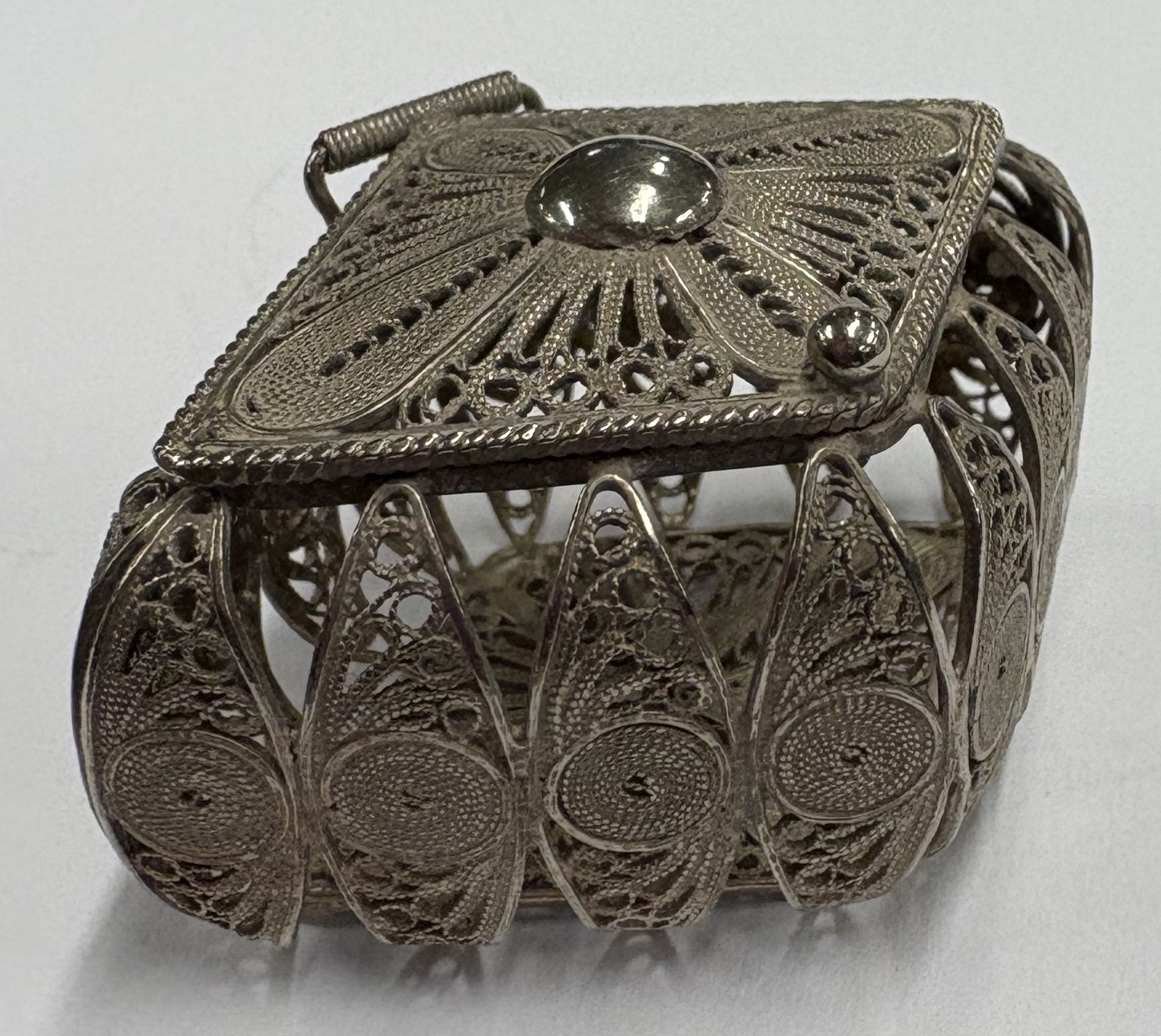 An Antique filigree silver pill box, marked to base. Approx. 12 grams. Est. £40 - £60.