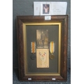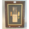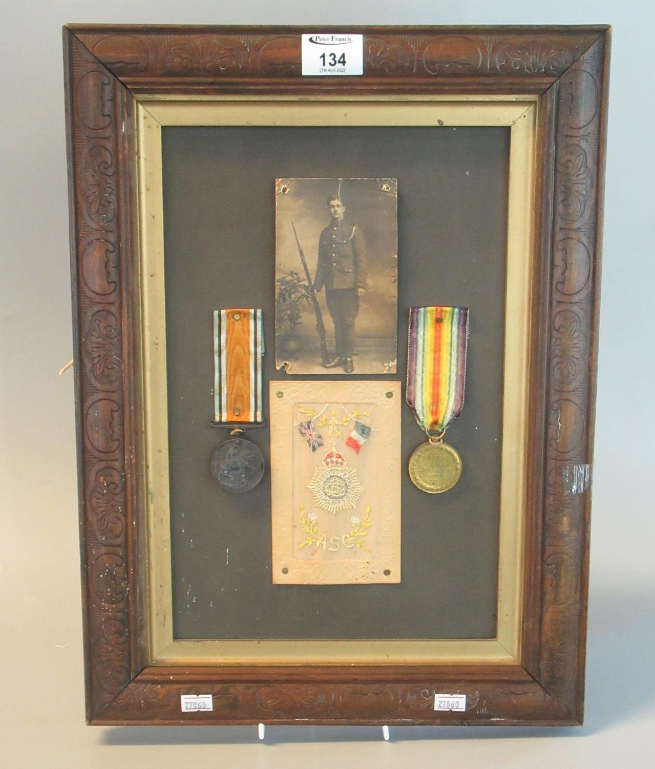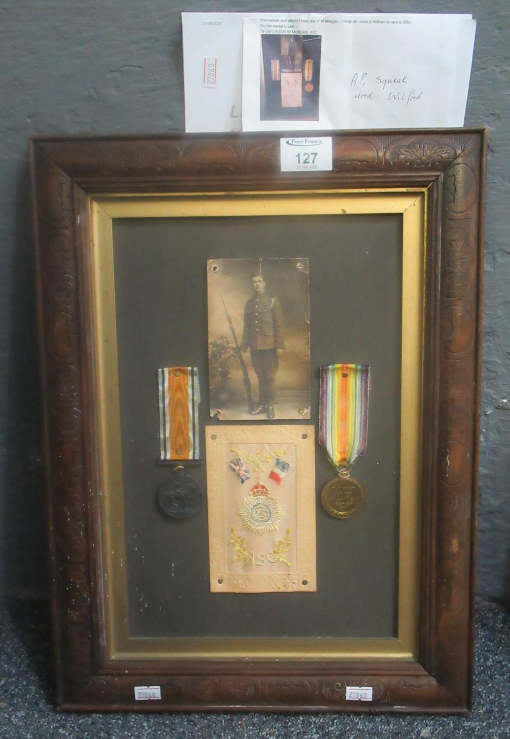 WWI Medal Duo awarded to 12-247728 Driver A Morgan Army Service Corps, War Medal and Victory Medal together with Photograph and Army Service Corp embroidered Silk Postcard, framed. Overall, including frame, 46cm x 35cm approx.