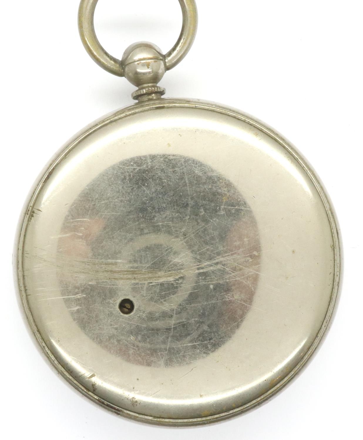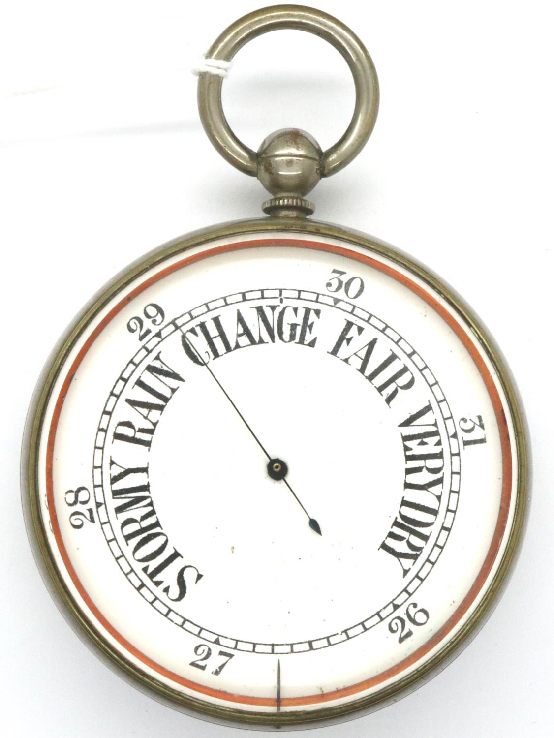 White metal pocket barometer, Goliath size. P&P Group 1 (£14+VAT for the first lot and £1+VAT for subsequent lots)