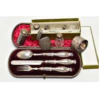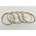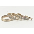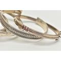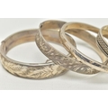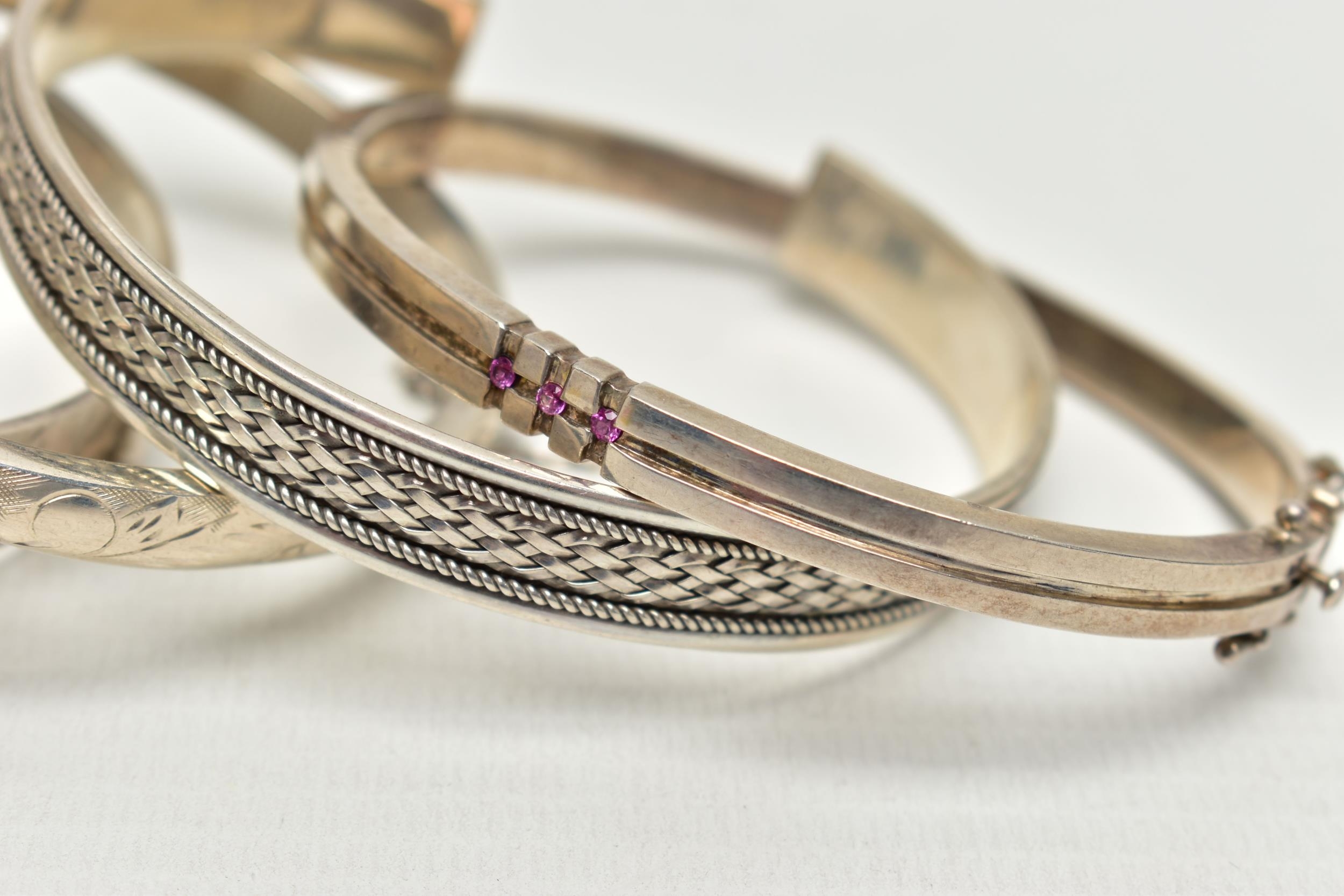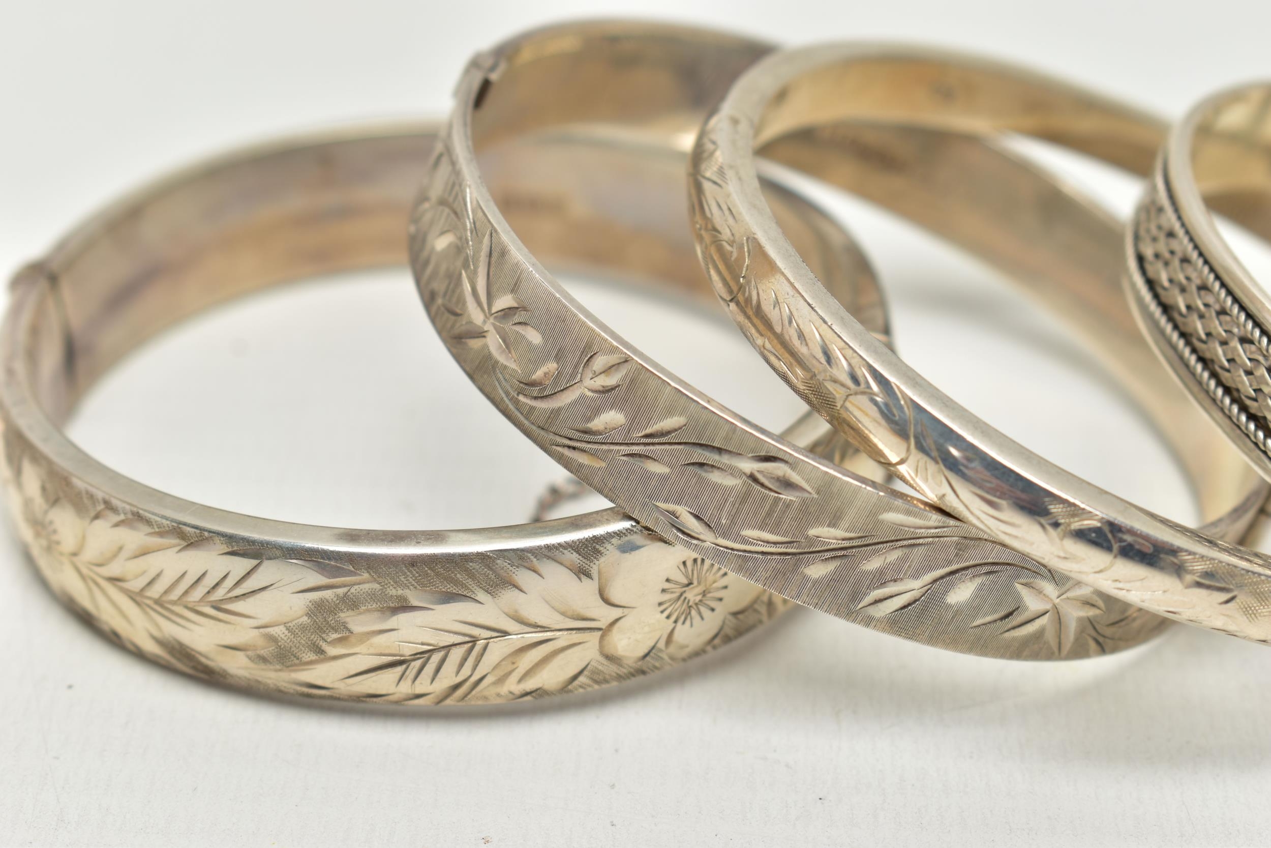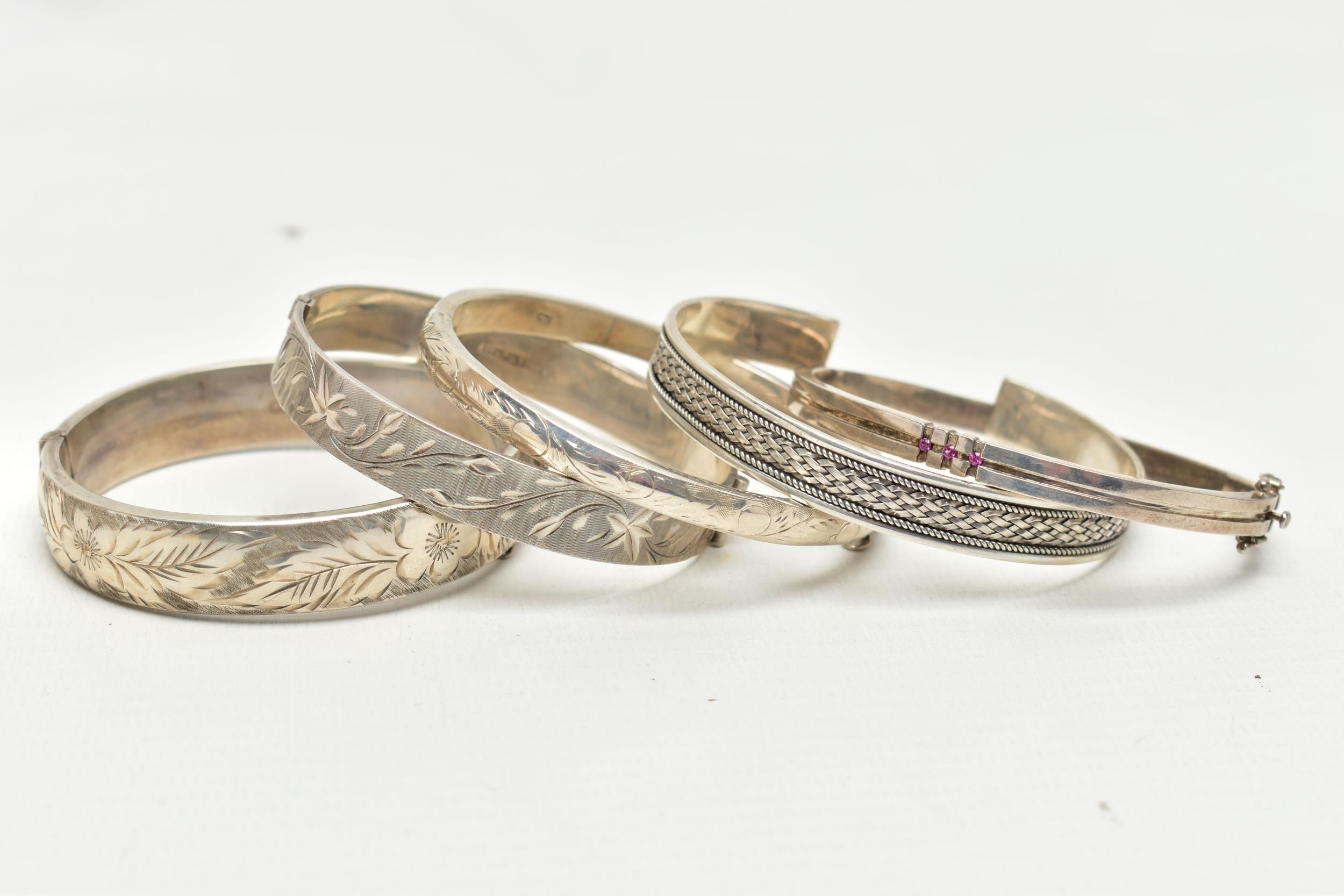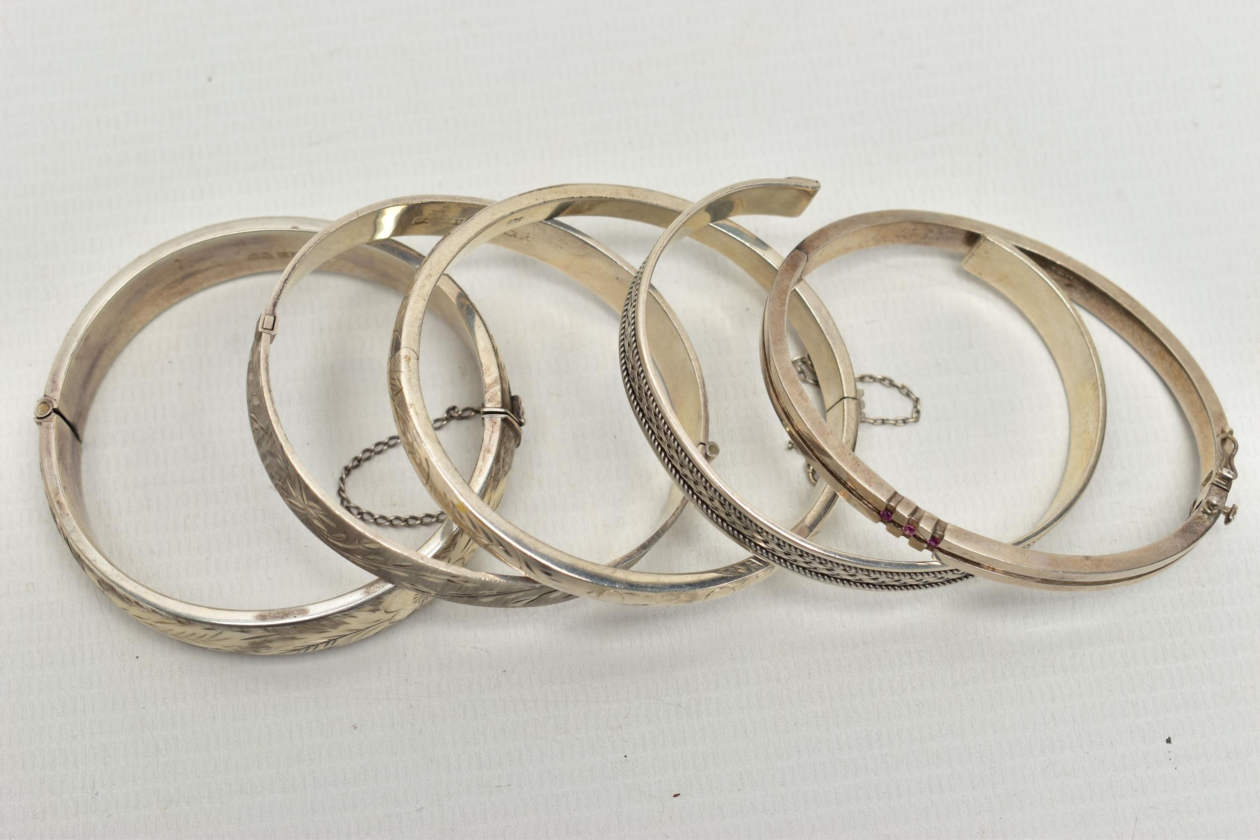 AN ASSORTMENT OF SILVER AND WHITE METAL BANGLES, to include a hinged bangle with floral engraving and outer hallmark detail, hallmarked silver Birmingham, a hinged bangle with floral engraved detail, hallmarked silver Birmingham, a hinged gem set bangle, hallmarked silver Birmingham, approximate gross weight 68.1 grams, together with a white metal hinged bangle and a white metal cuff bangle, stamped 925, approximate gross weight 29.8 grams (condition report: general moderate wear, some rubbing to hallmarks, cuff bangle slightly distorted)