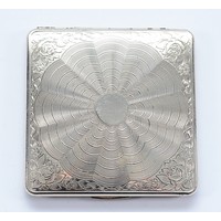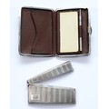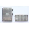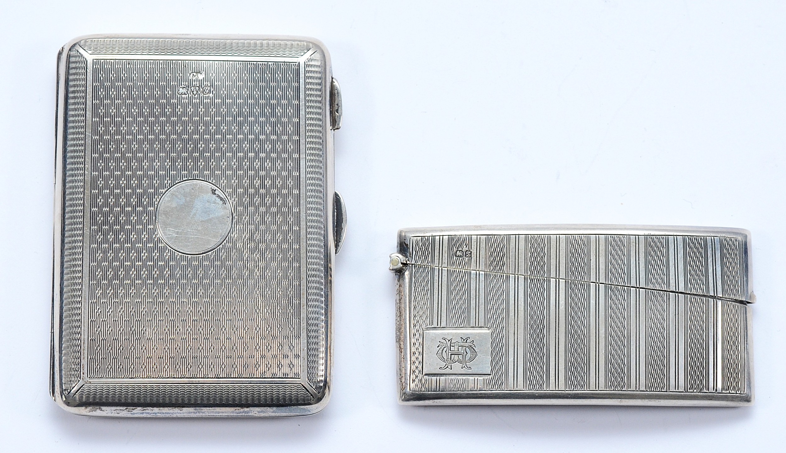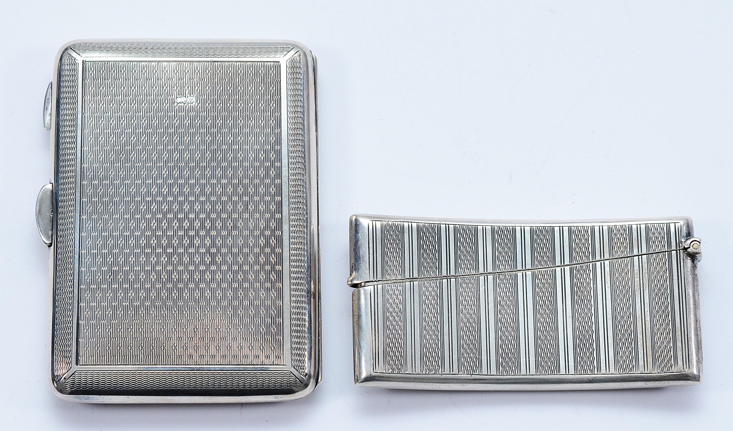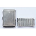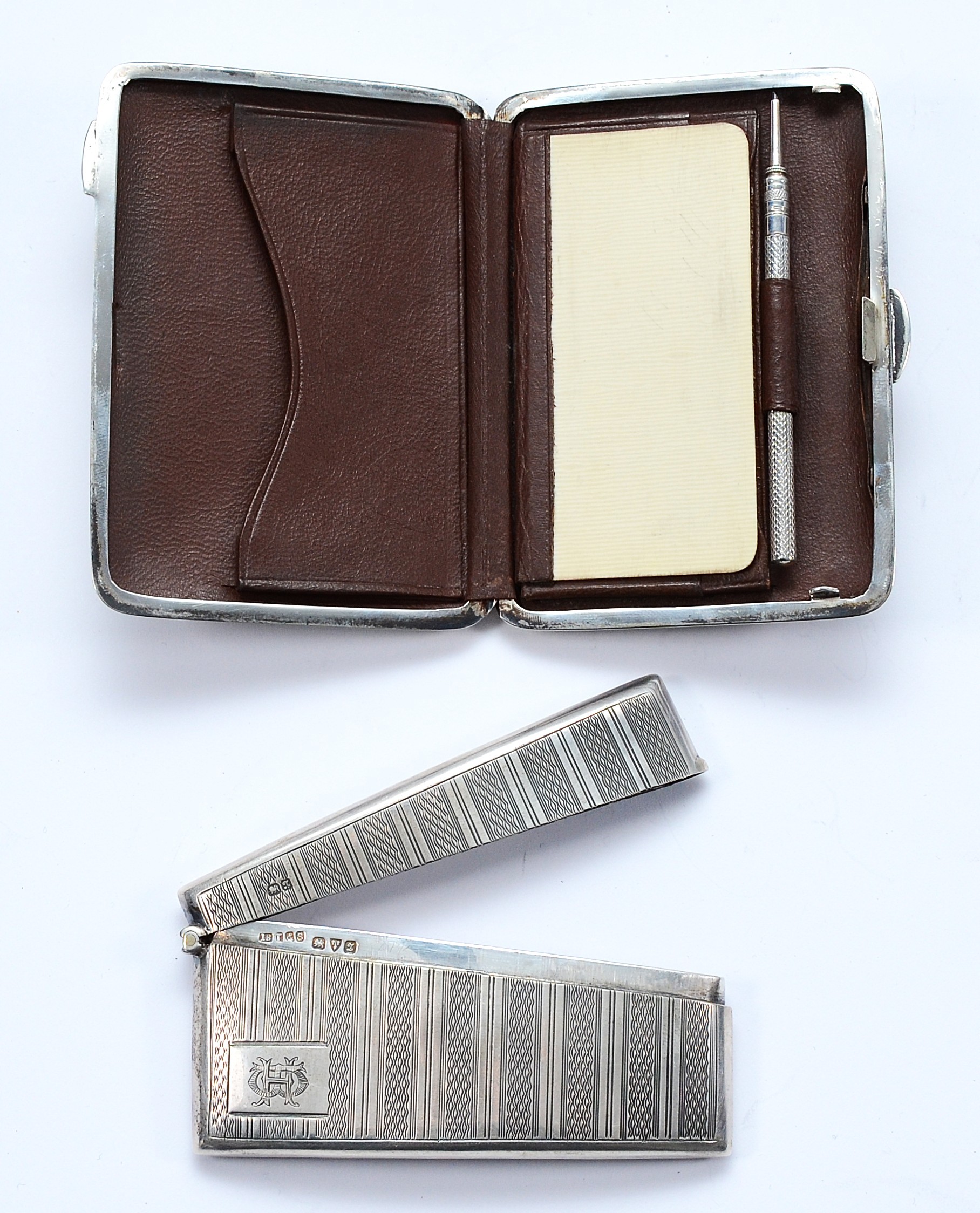 A silver arched card case, Chester 1911, by E J Trevitt & Sons, with engraved monogram to the front, 9x4cm, together with a leather lined card case, having pencil inside, Chester 1924, 9x6.5, 128gm.