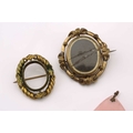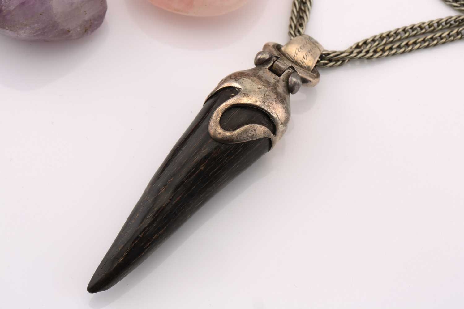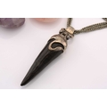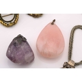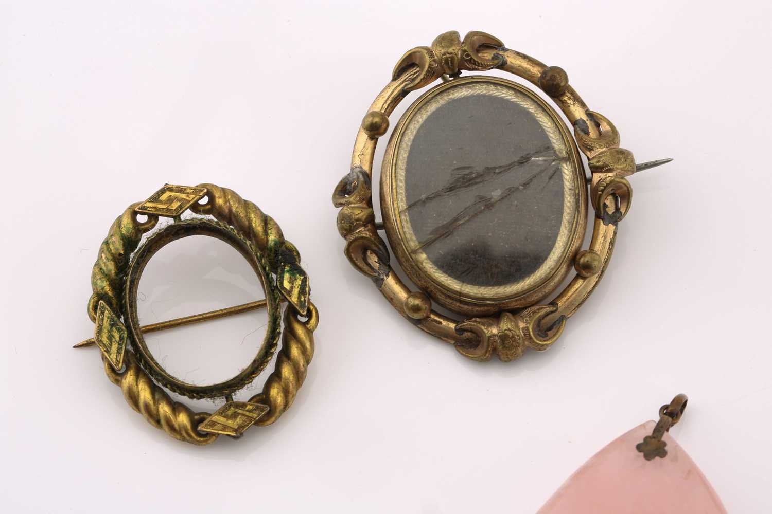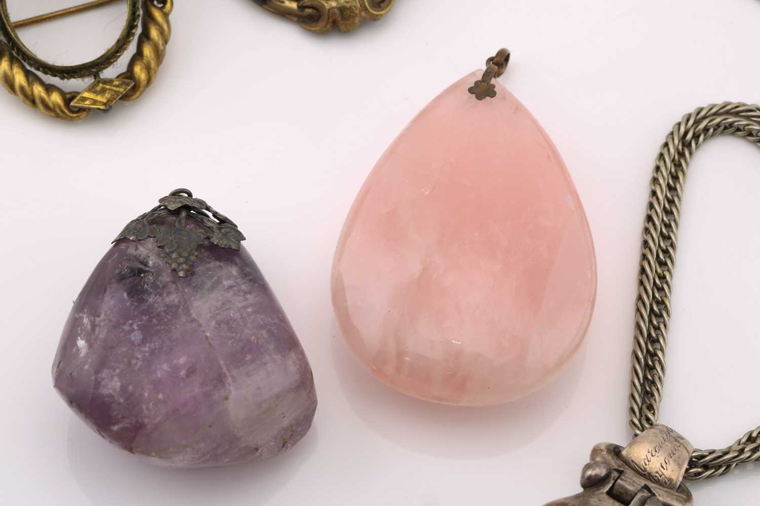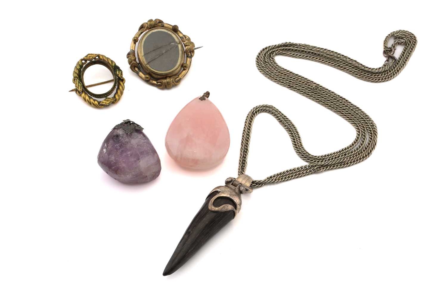 A mixed lot of pendants and brooches, to include a horn pendant on a white metal mount, to a double curb link chain, marked 'sterling', pendant overall length 9.0 cm, chain 70.0 cm long; A tumbled amethyst rough on a white metal surmount with vine motifs, overall measures 4.9 x 4.0 cm; A pear-shaped rose quartz on flower surmount on bail, marked '9ct', overall measures 5.7 x 4.0 cm; A Victorian double-sided swivel brooch in pinchbeck, with lock of hair in one side of the spinnable locket compartment, hinged pin stem and C-catch, measures 4.9 x 4.2 cm; A smaller Victorian swivel brooch in pinchbeck, missing lenses for locket compartment, hinged pin stem and C-catch, measures 3.8 x 3.5 cm. Total weight of items 188.7 grams (5).