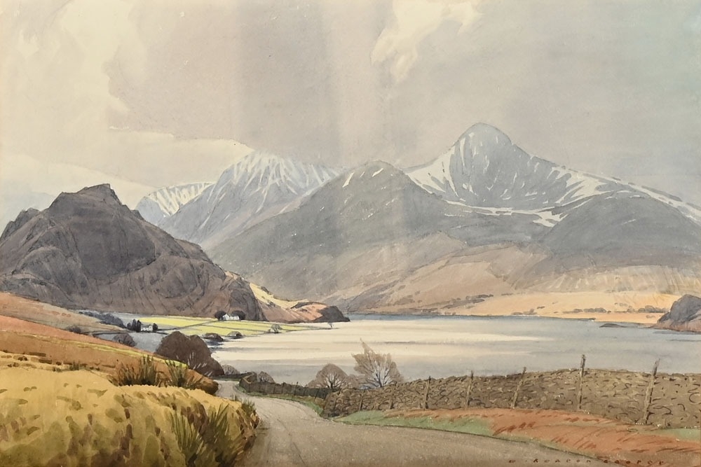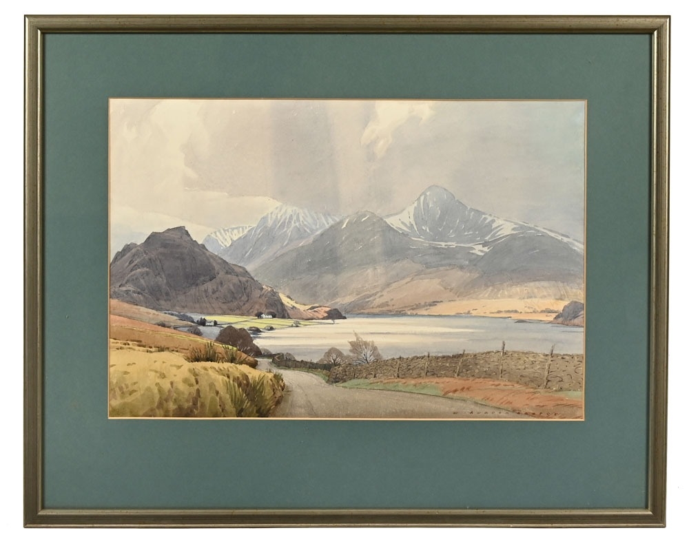 William Heaton Cooper RA (1903-1995), watercolour titled to the rear "Silver Gleams Crummock Water". 37 x 55 cm, framed and mounted (see illustration).