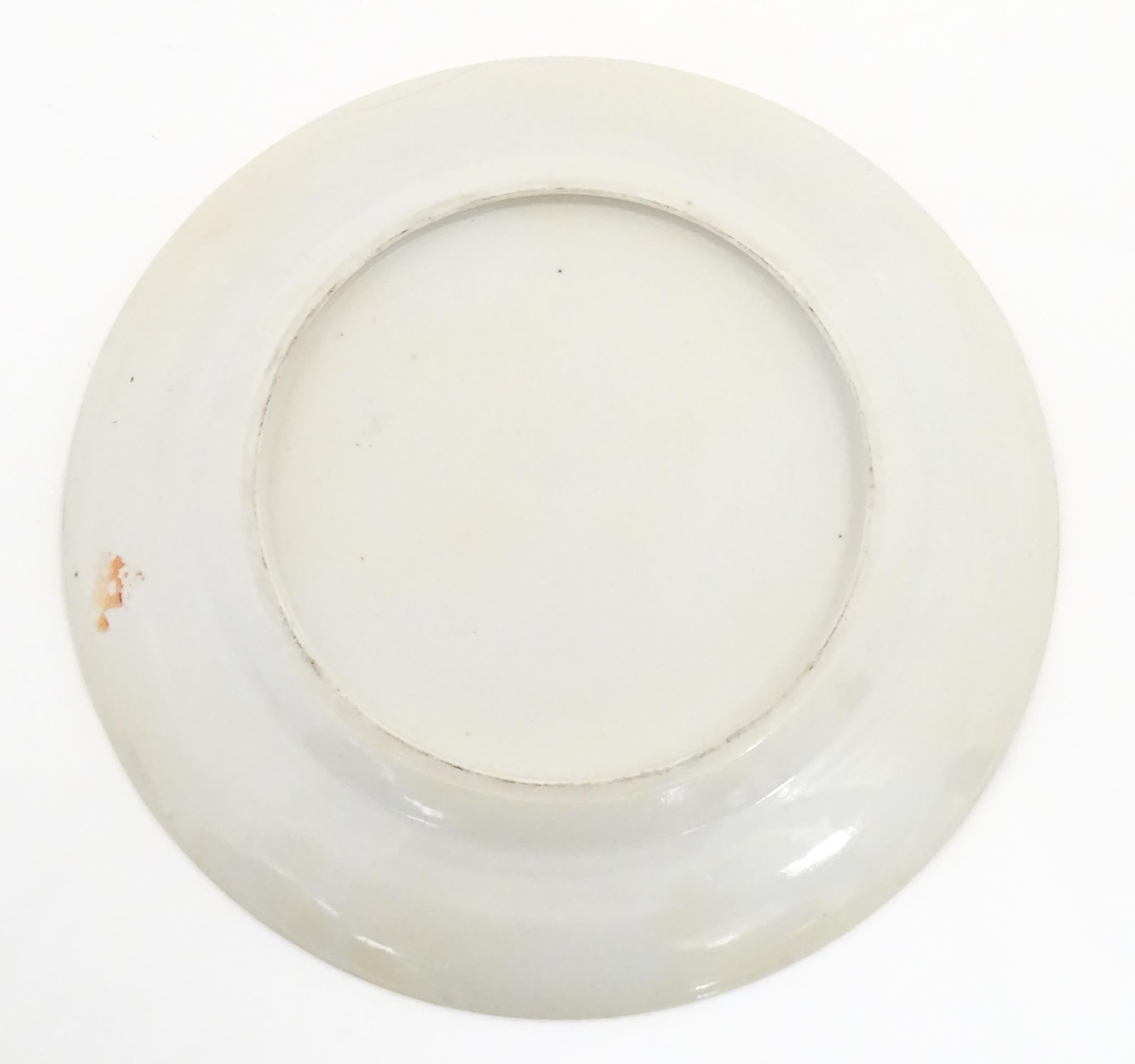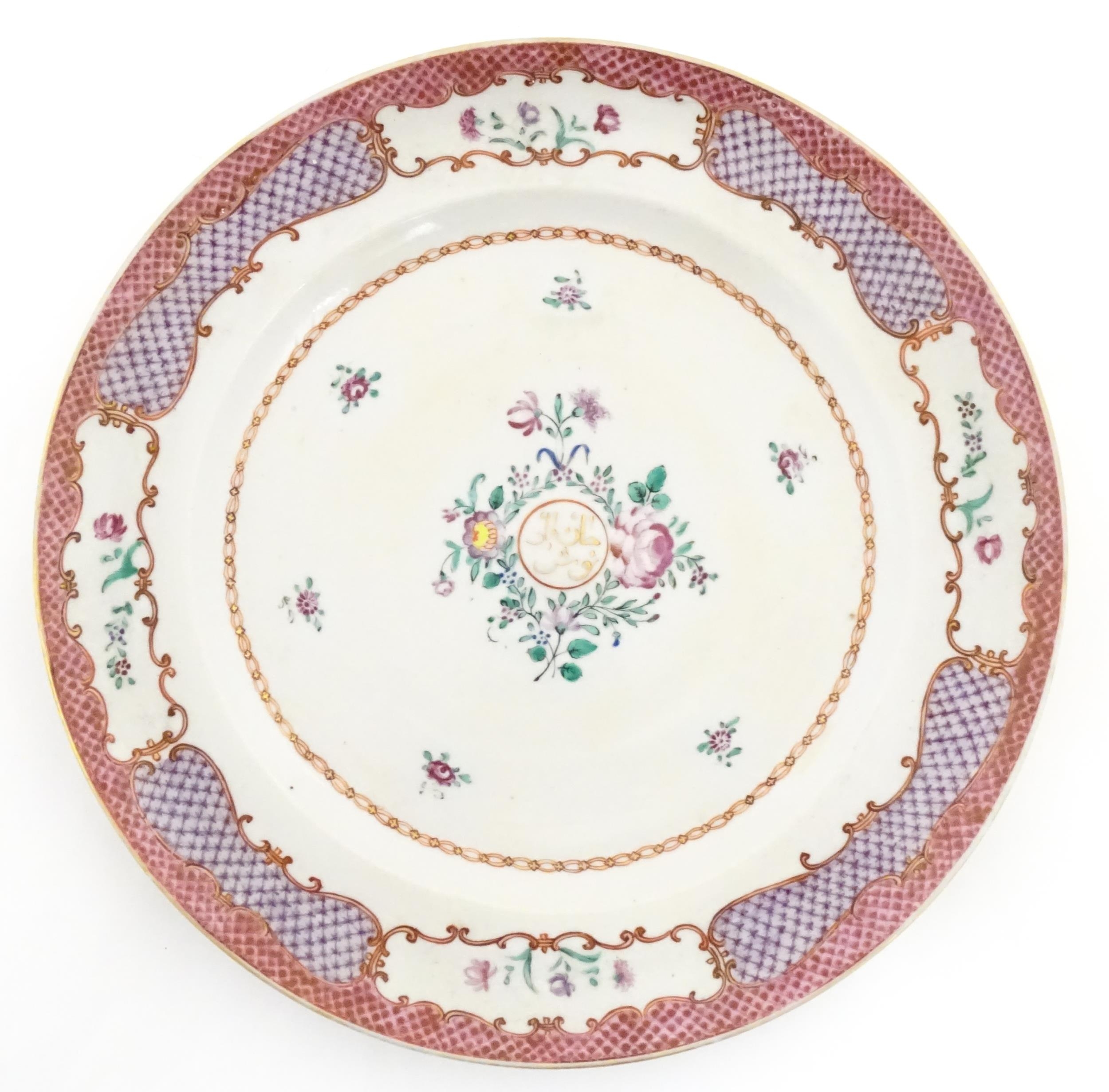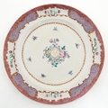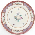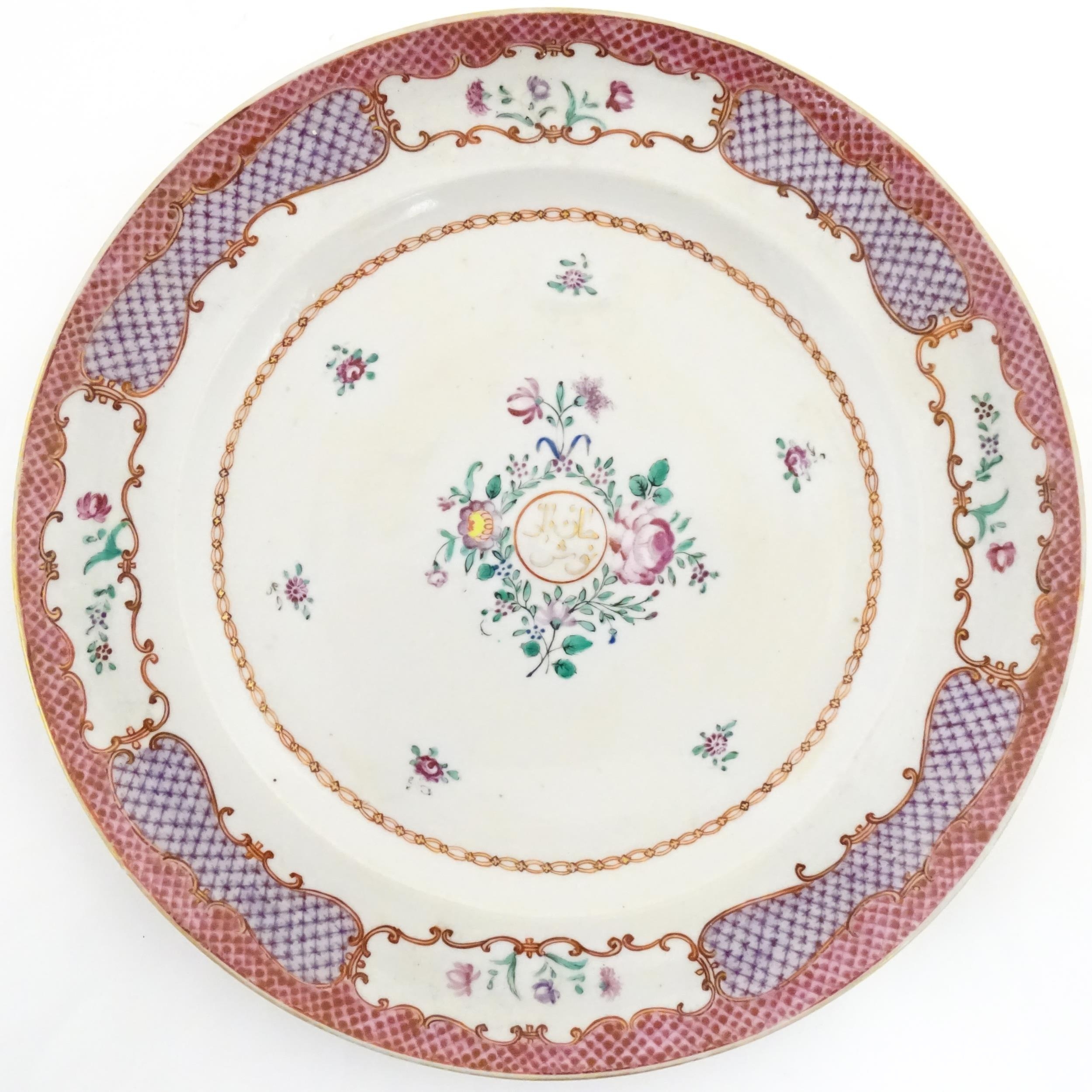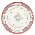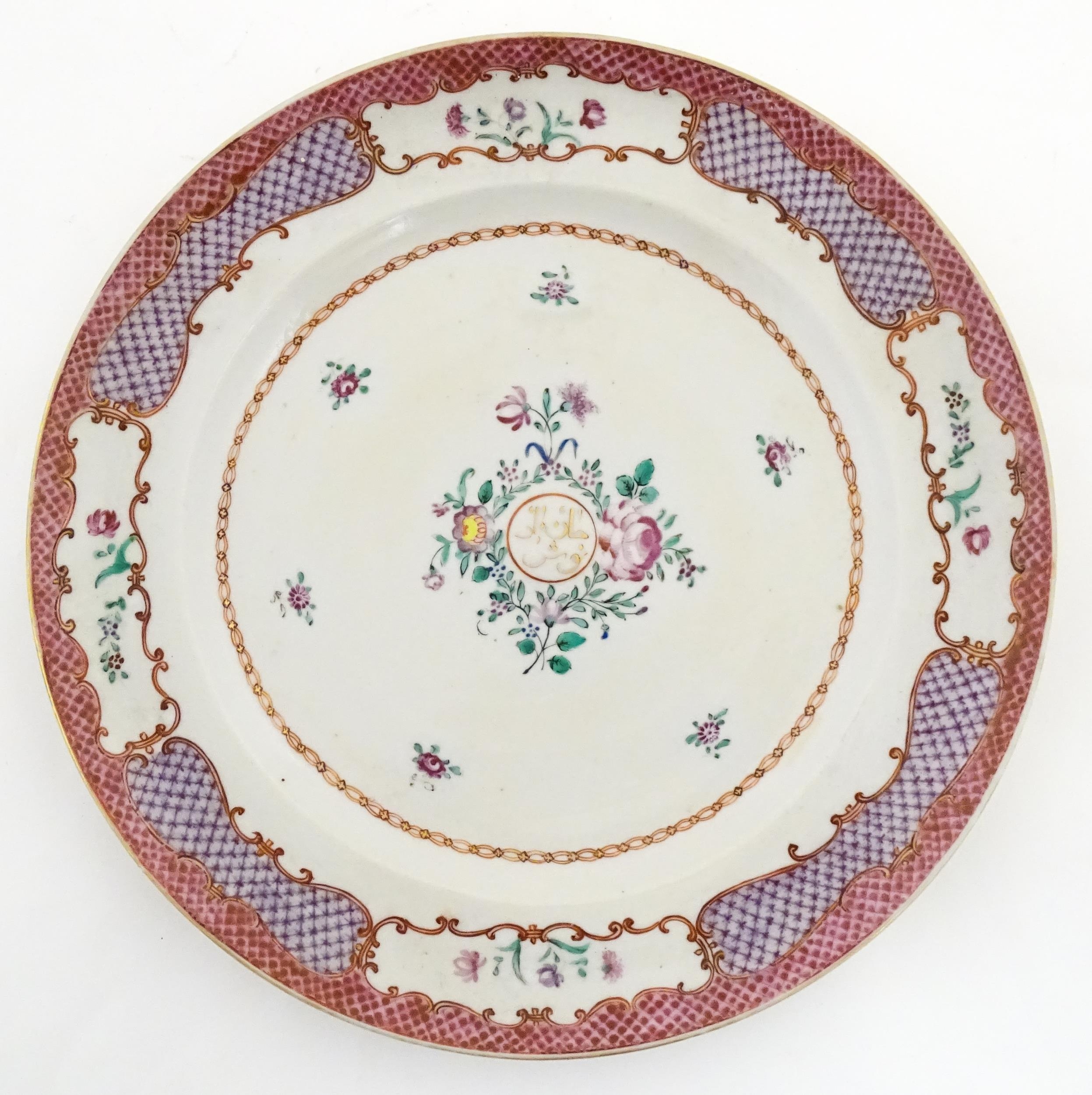 A Chinese famille rose porcelain dish for the Islamic market with central roundel of Persian script with floral spray border. Approx. 10" wide