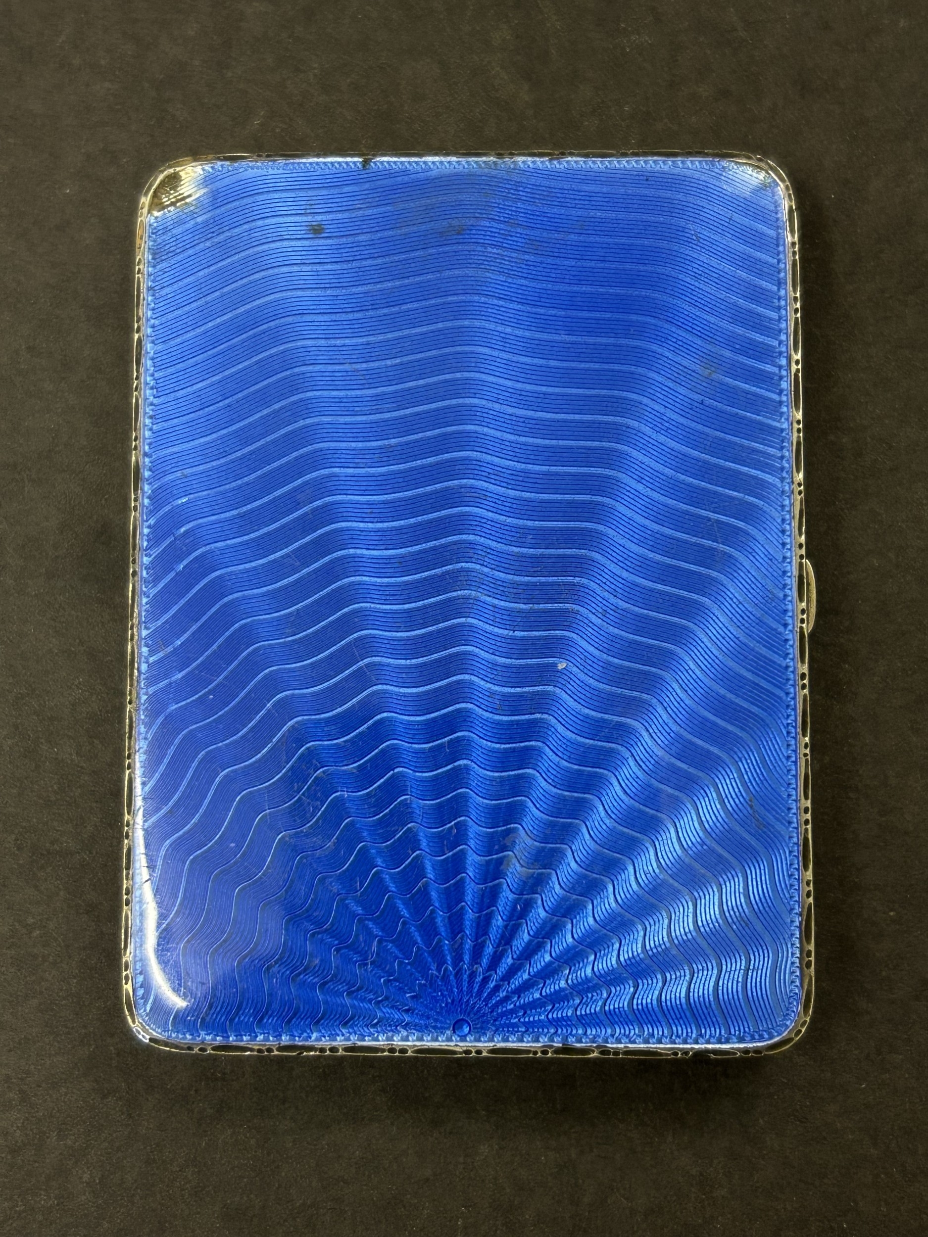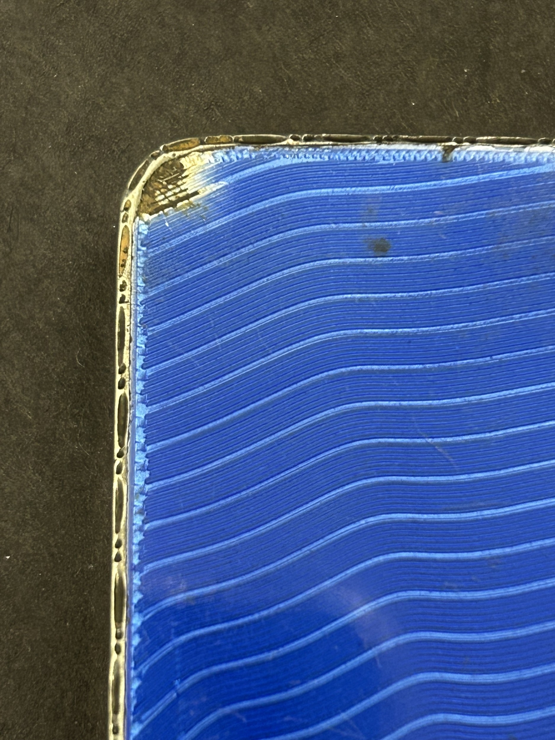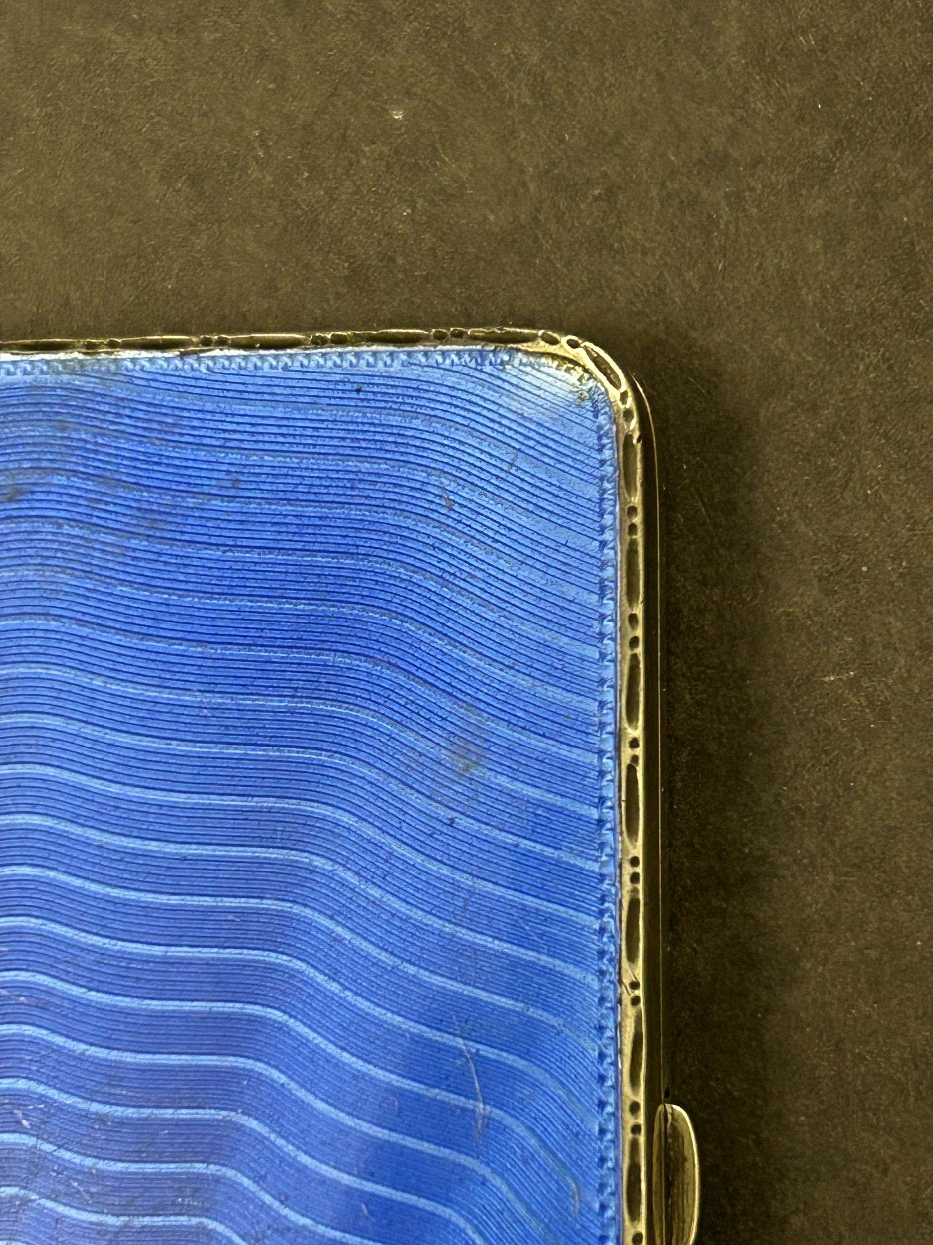 A hallmarked silver and blue enamel cigarette case, just over 3" long, total weight approx. 109g (loss to enamel on one corner and chip on another corner)