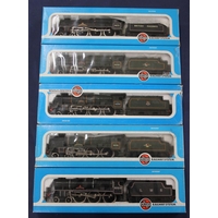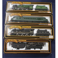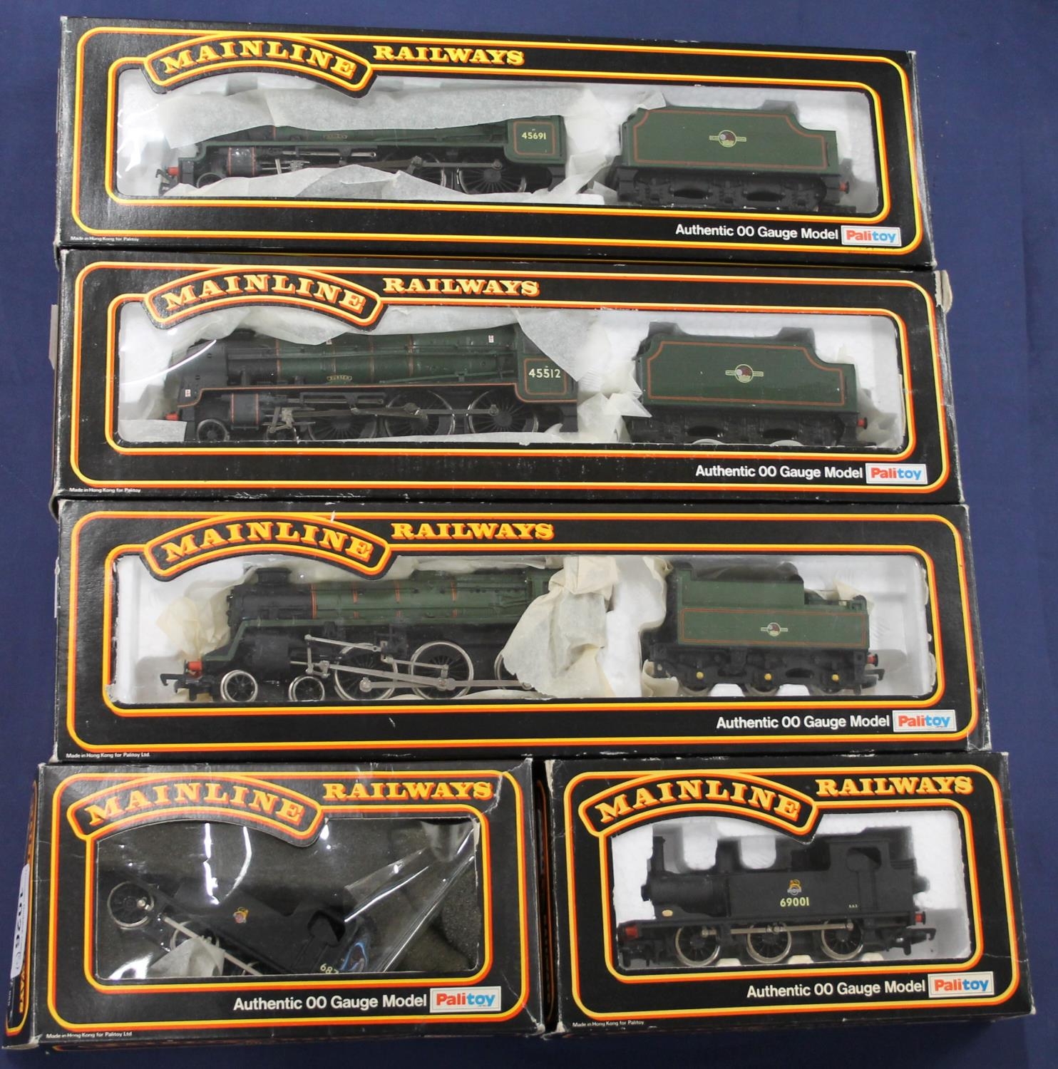 Mainline OO gauge model railway locomotives to include 37062 4-6-0 Orion tender locomotive 45691 BR green, 4-6-0 Bunsen tender locomotive (Bachmann chassis) 45512 BR green, 4-6-0 tender locomotive (Bachmann chassis) 75026 BR green, 0-6-0 tank locomotive 69001 BR black and 0-6-0 tank locomotive 68719 BR black, each in Mainline box. (5)