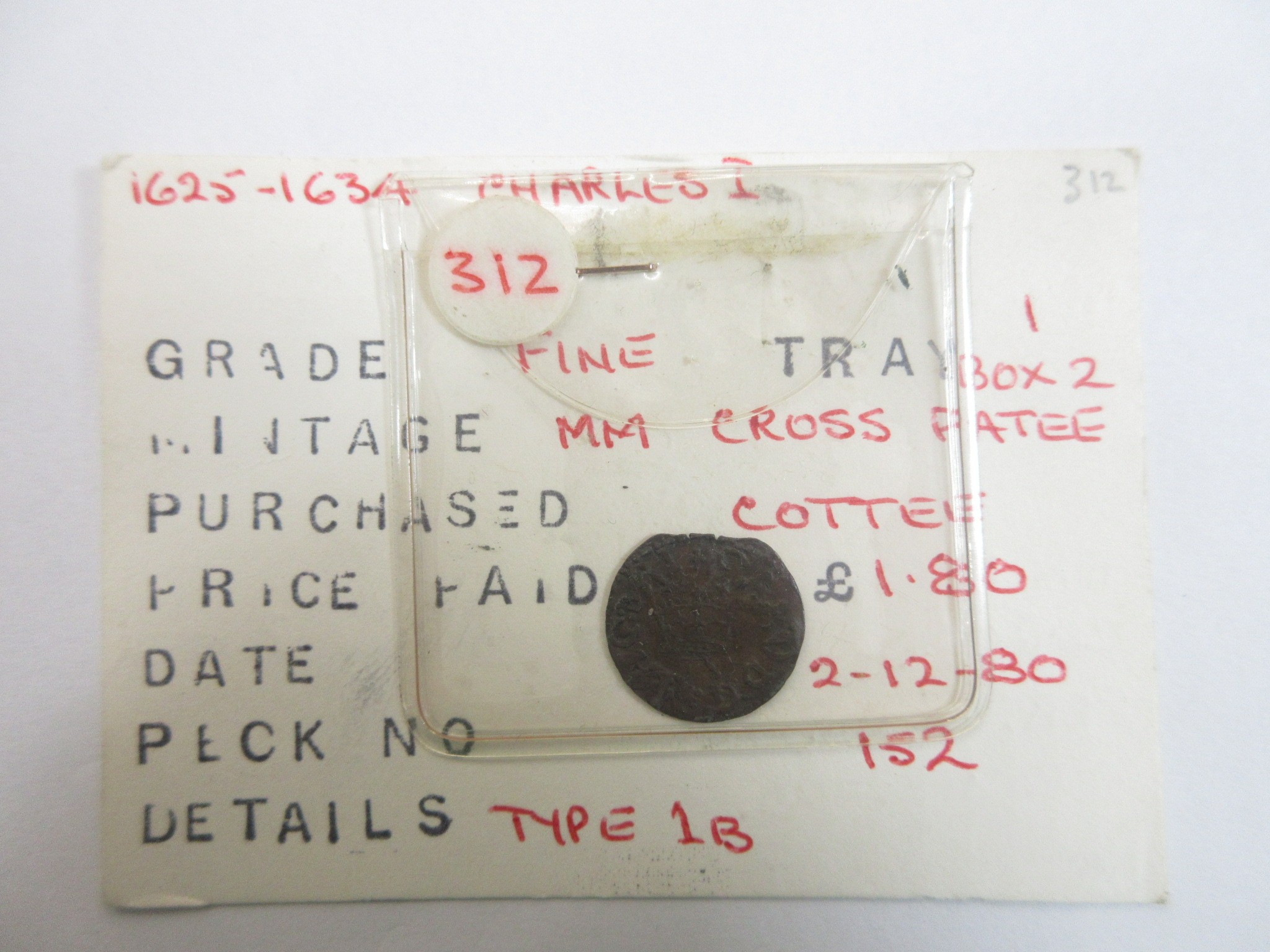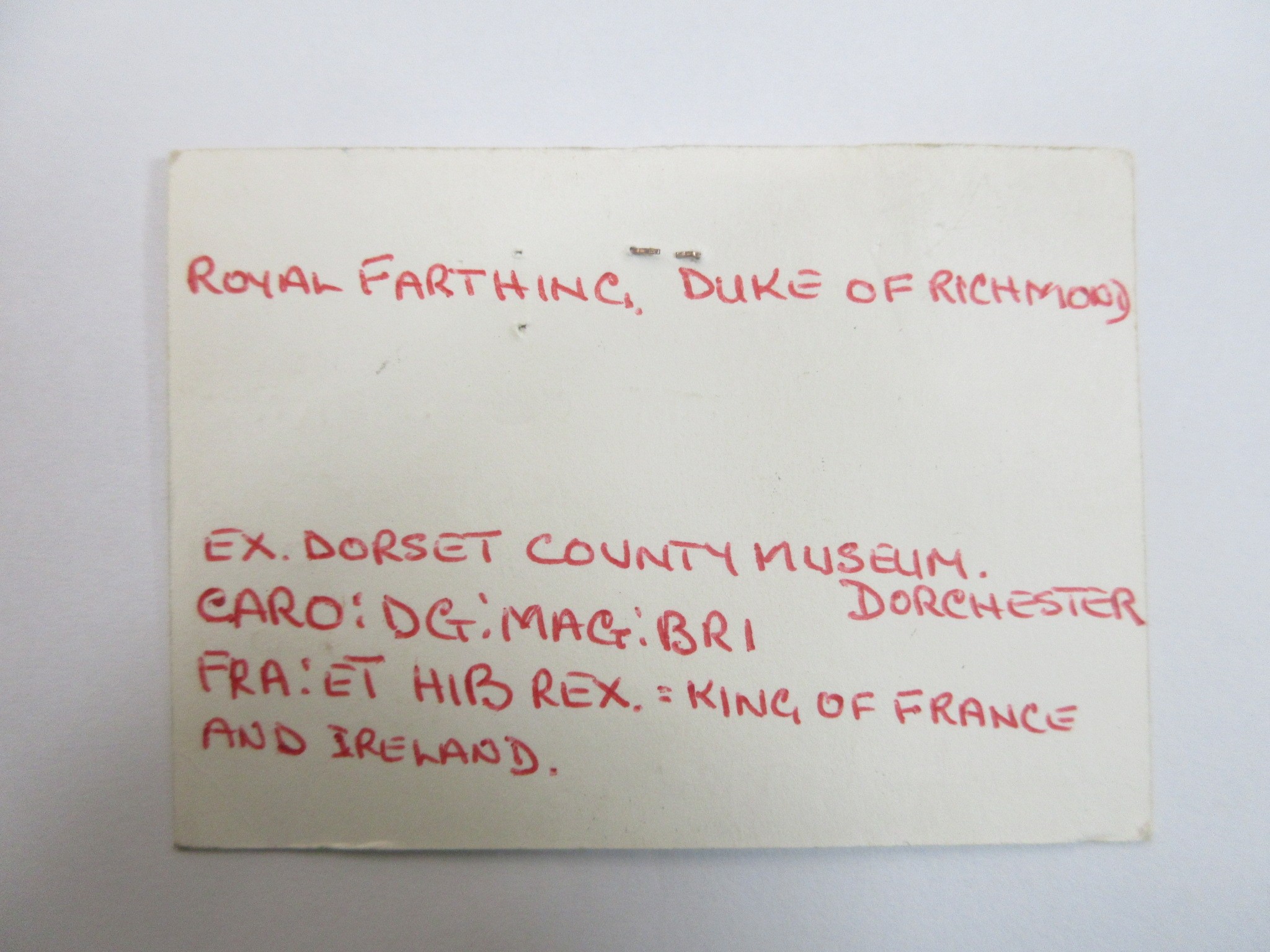 1625-1634 Charles I Duke of Richmond farthing grade fine ex.Dorset County Museum (Information taken from attached cards which also show date/place of purchase)