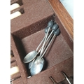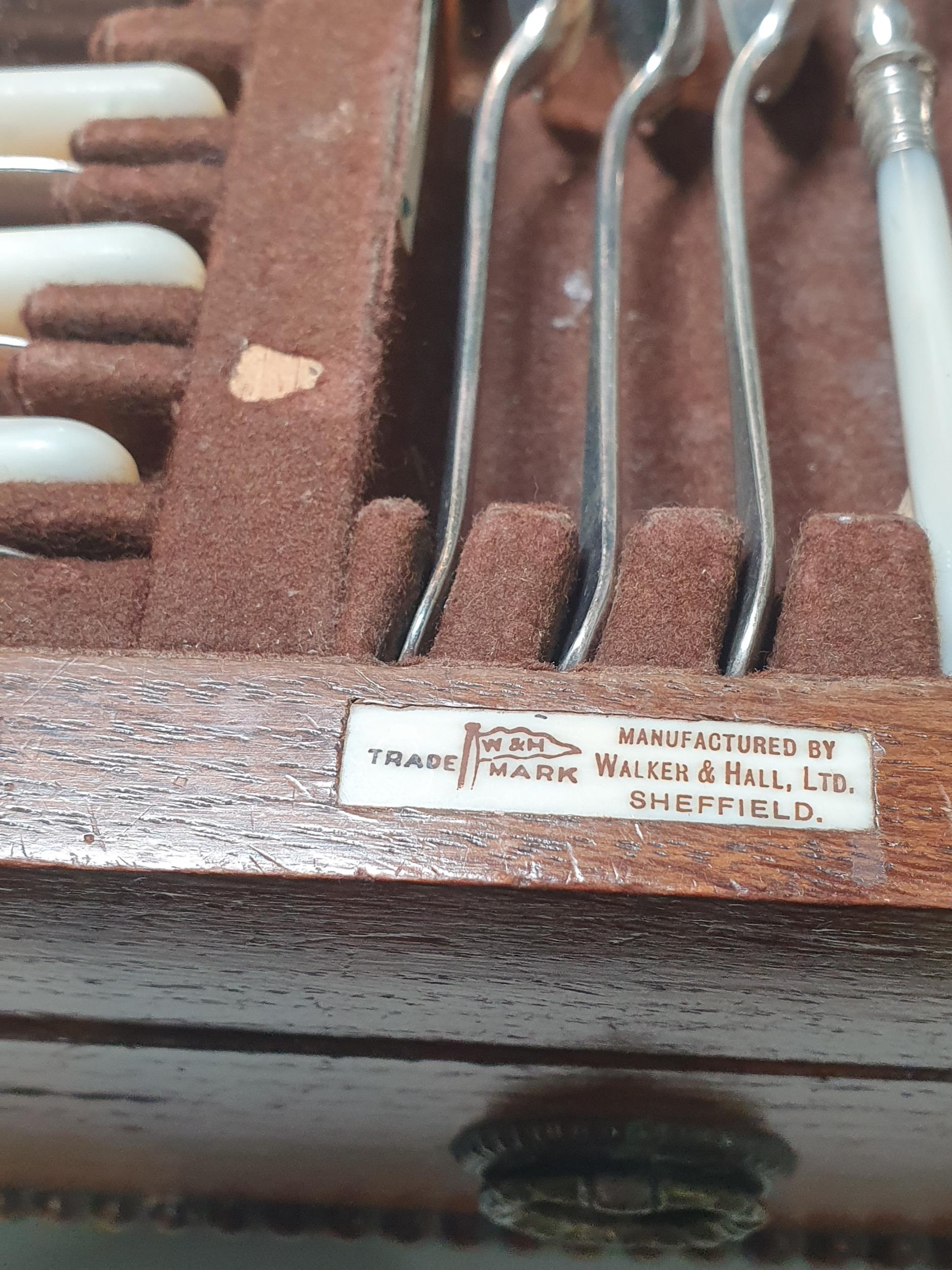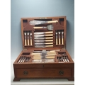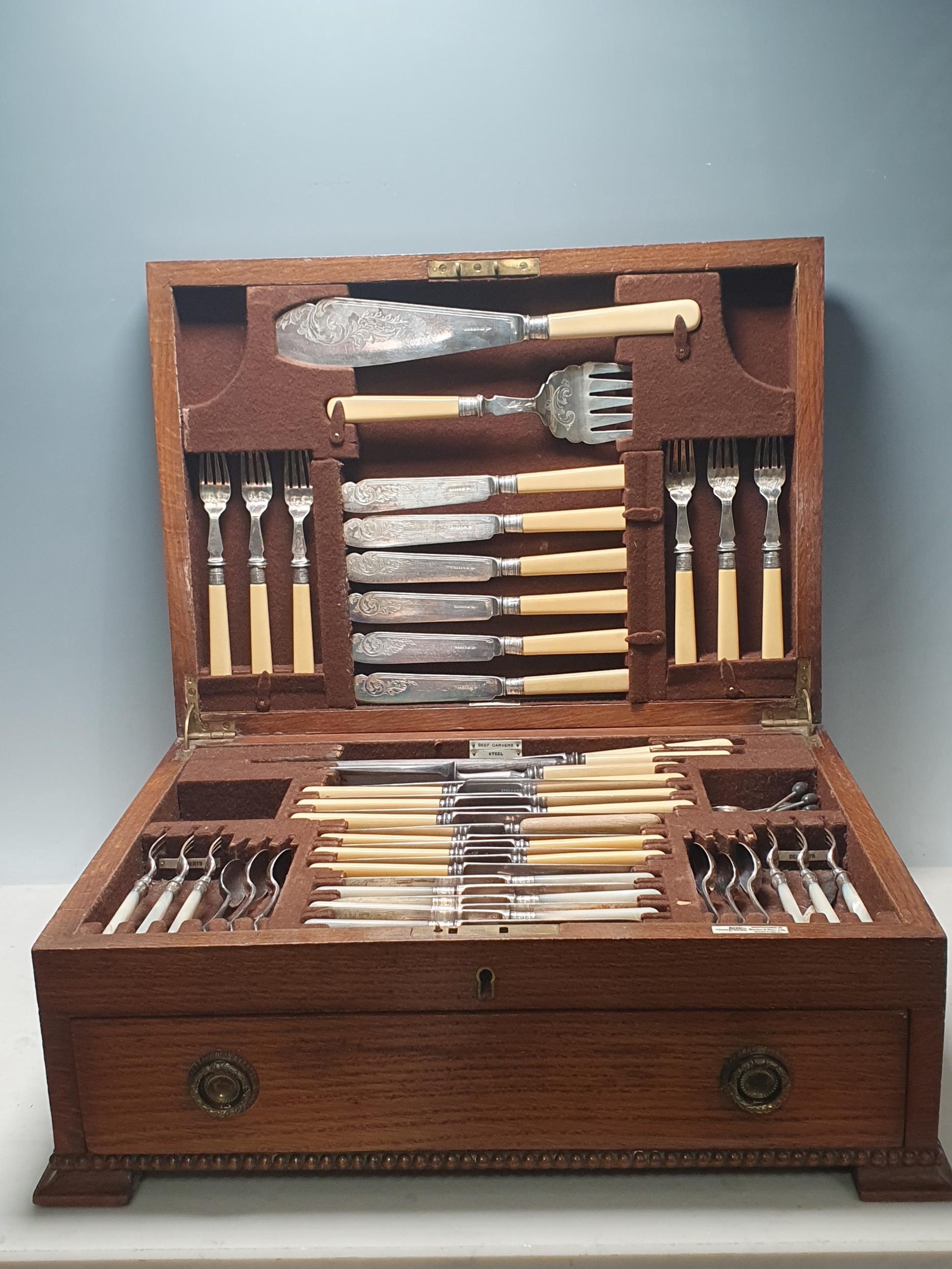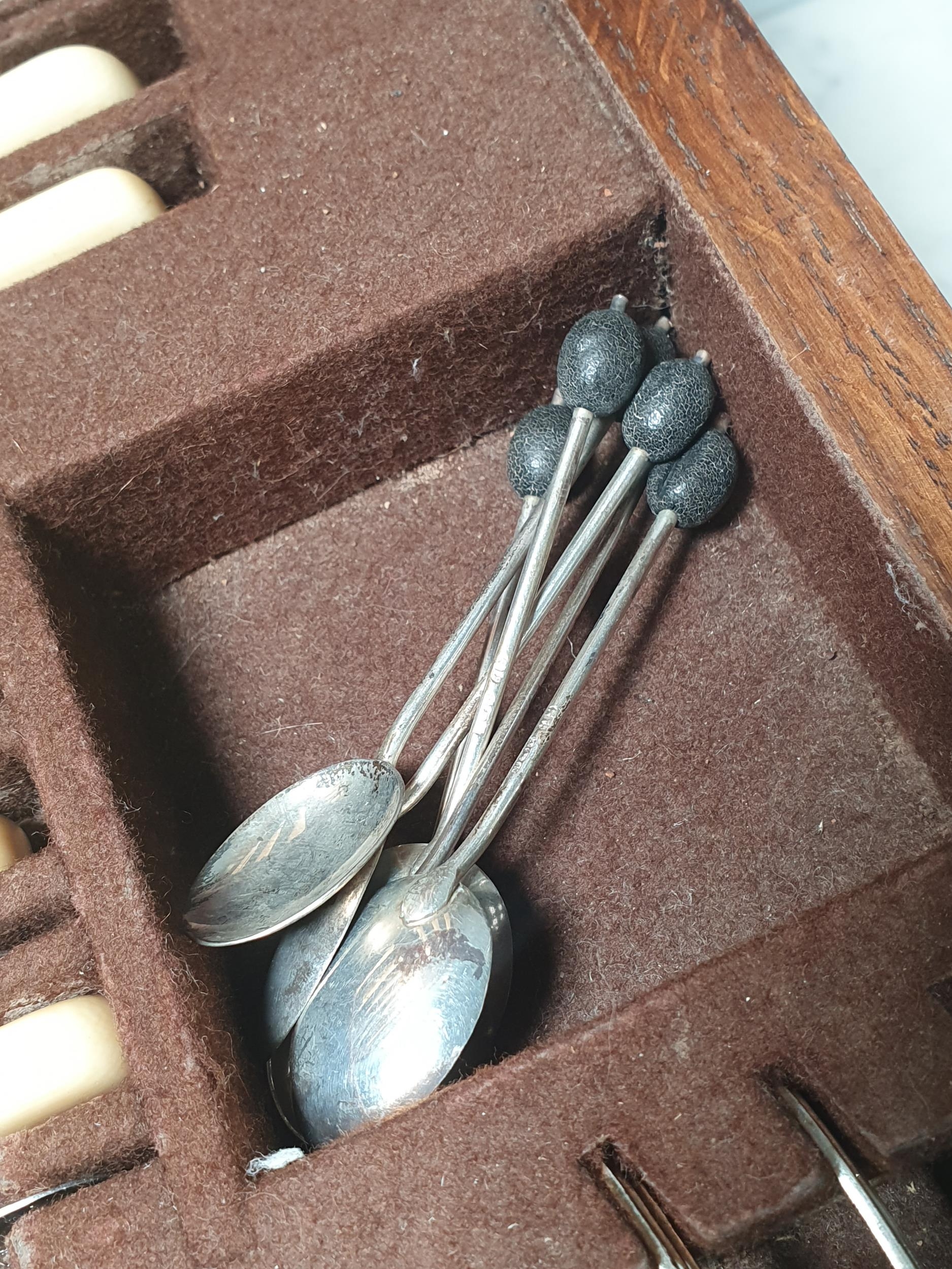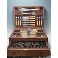 An oak Canteen by Walker & Hall containing plated Cutlery and a set of six silver bean-handled Coffee Spoons, (R4)
