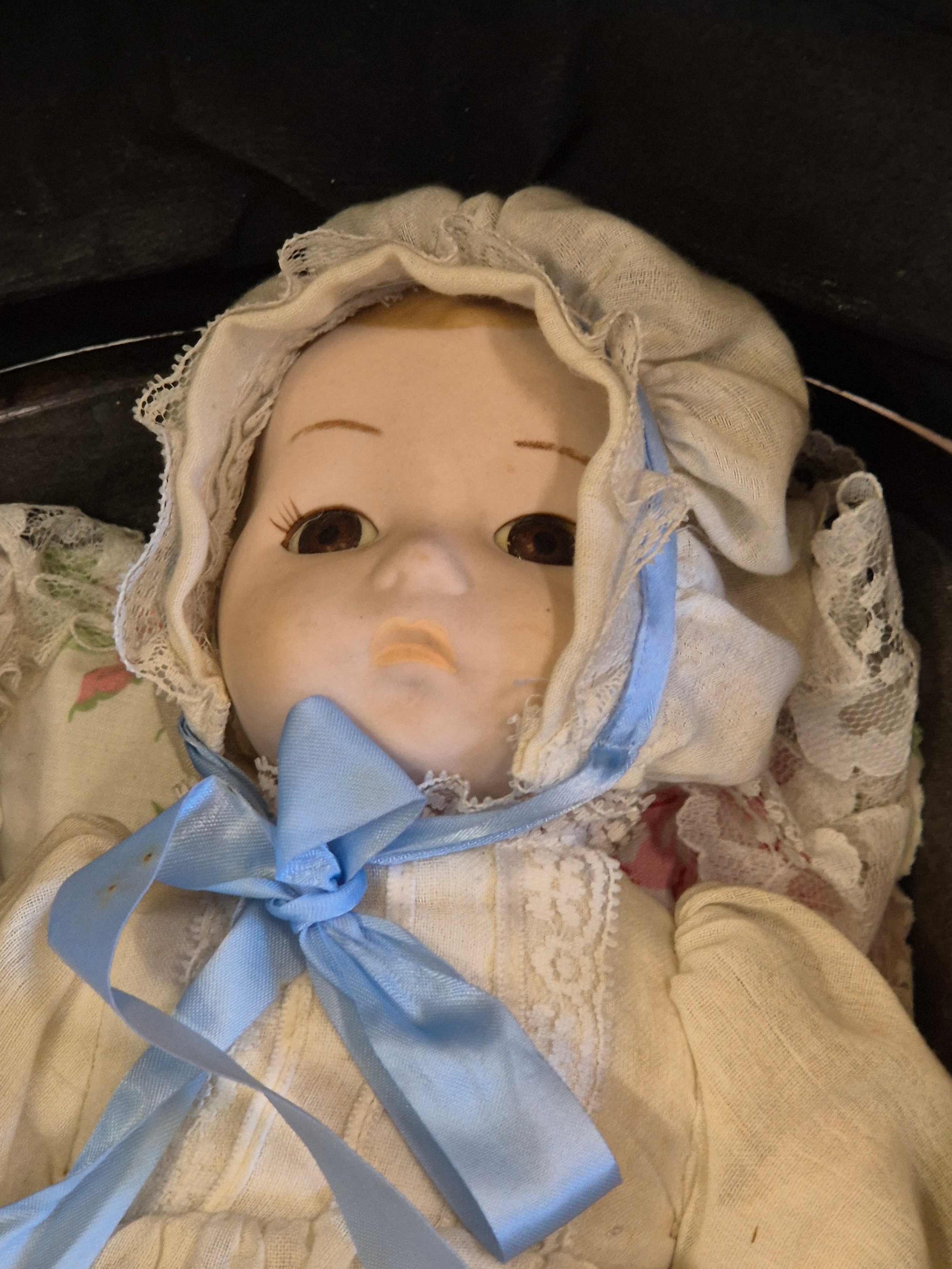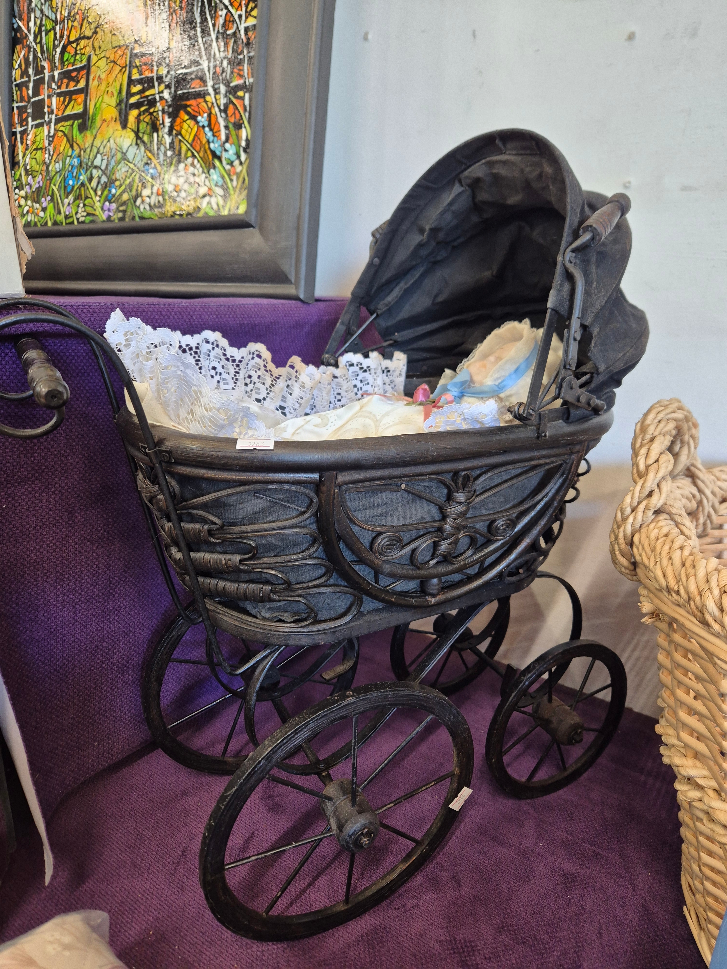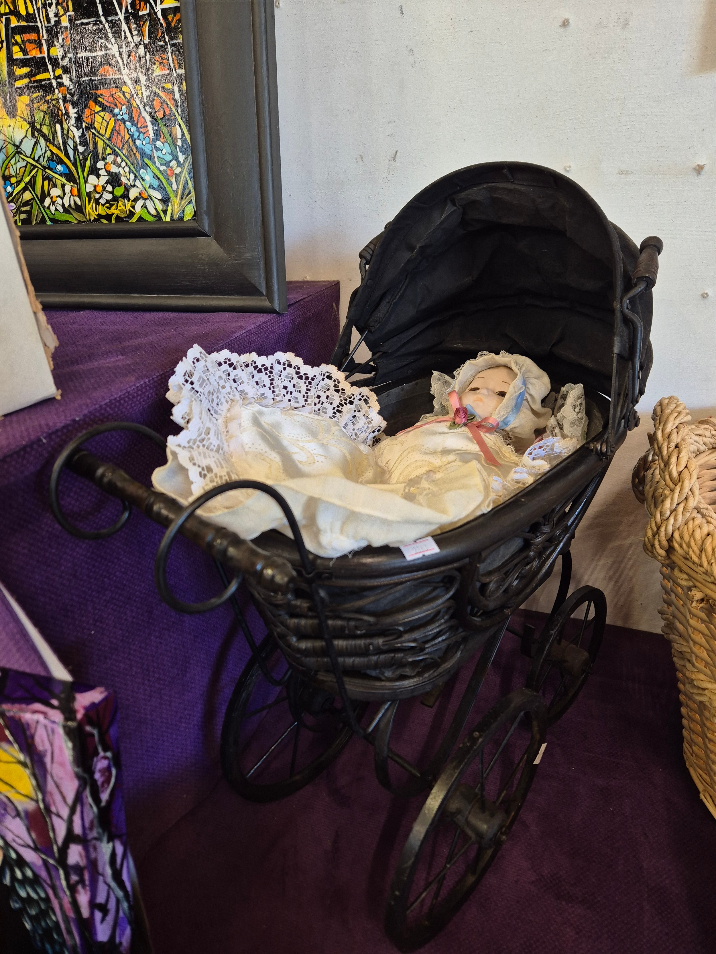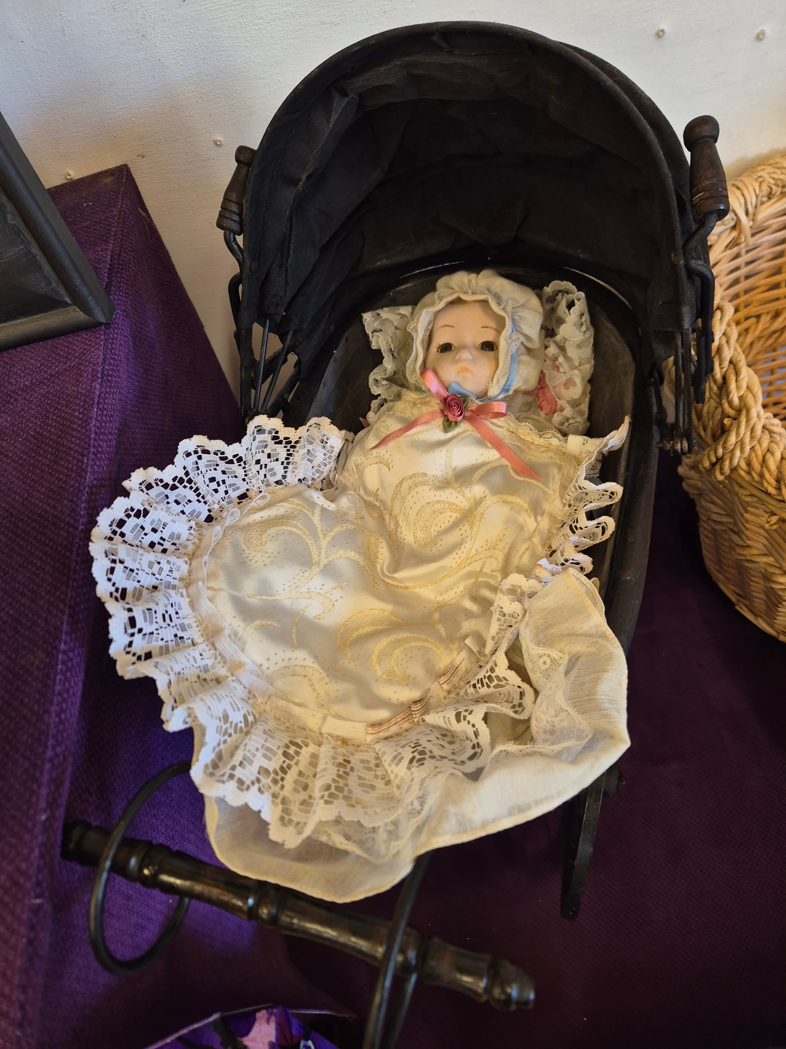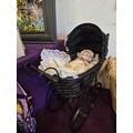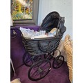 Victorian style dolls pram with porcelain baby doll