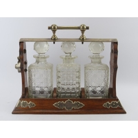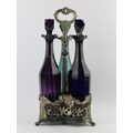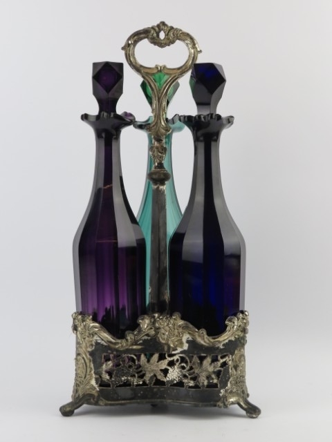 A set of three Victorian coloured glass decanters set on a plated metal trefoil stand. 41 cm total height.