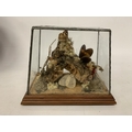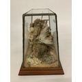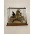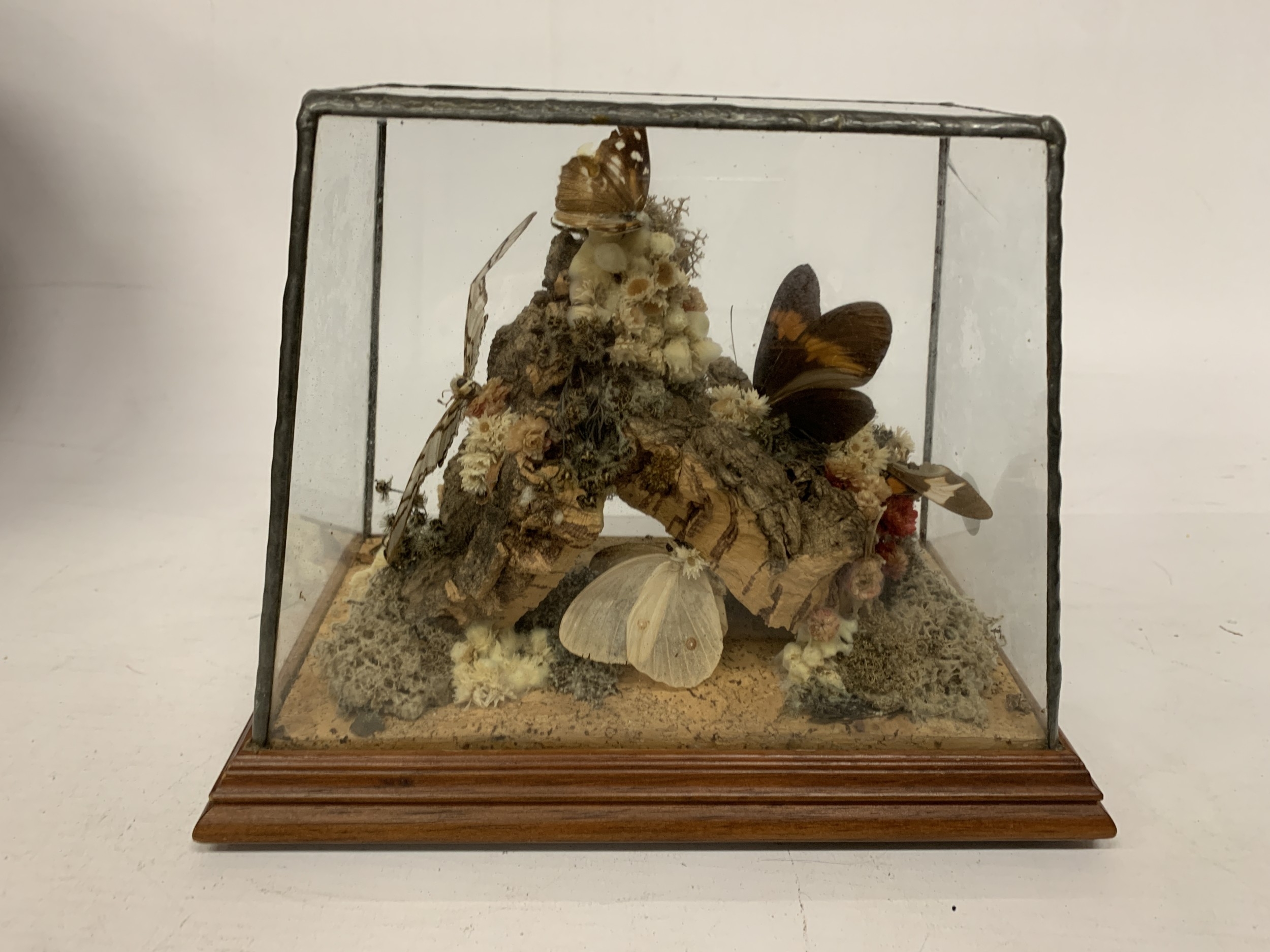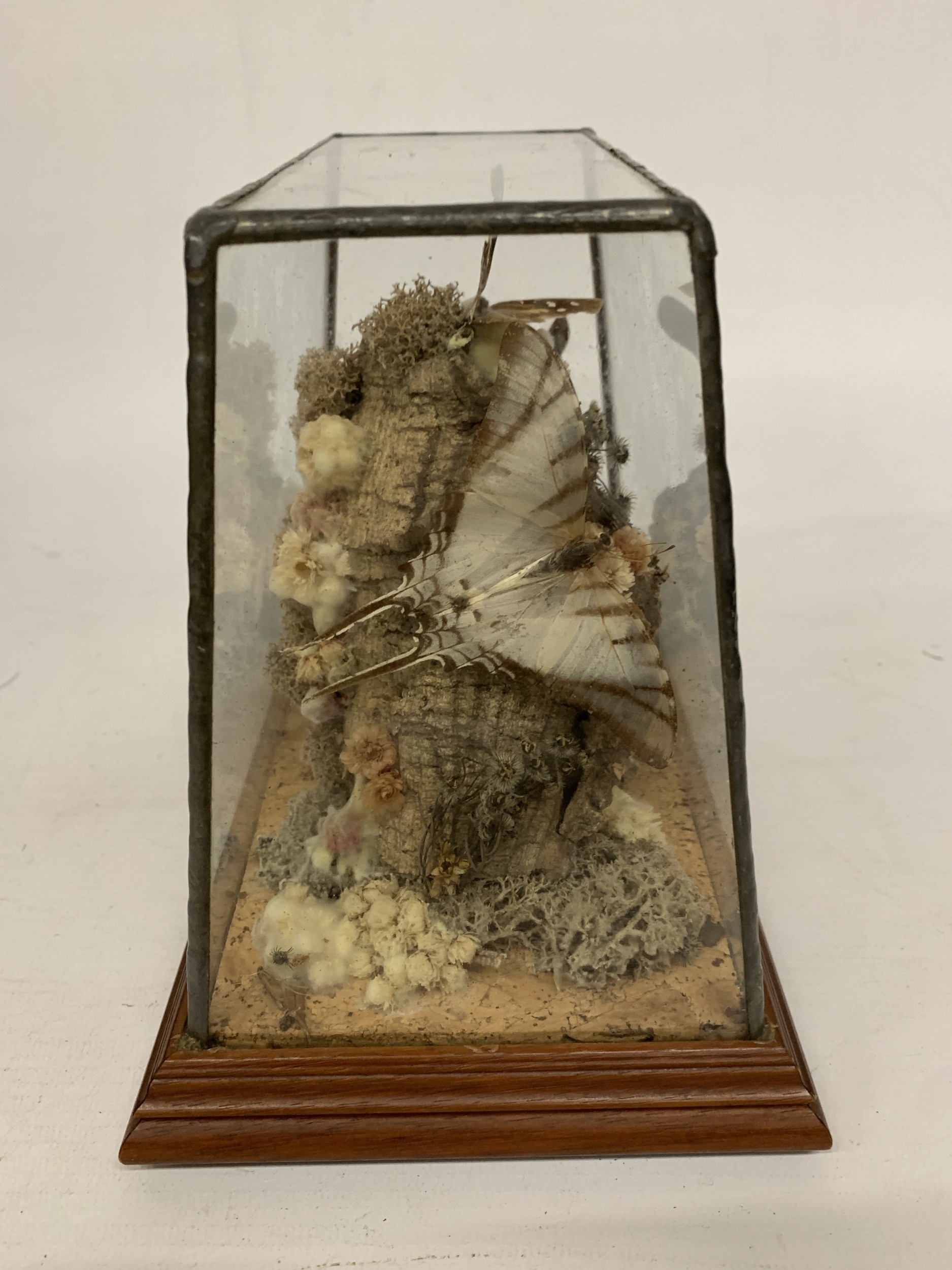 A TAXIDERMY STUDY OF BUTTERFLIES ON A NATURAL WOOD AND MOSS BASE IN A GLASS CASE