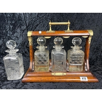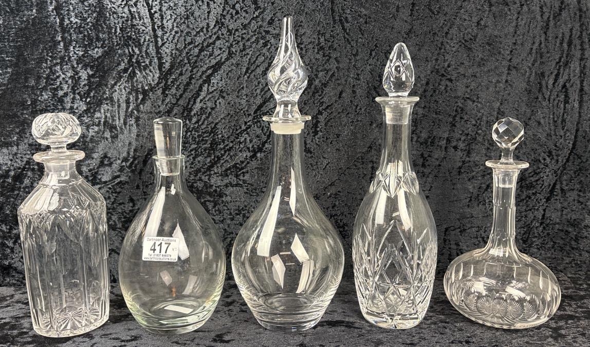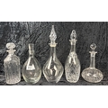 Five modern and vintage, plain and faceted, decanters.