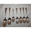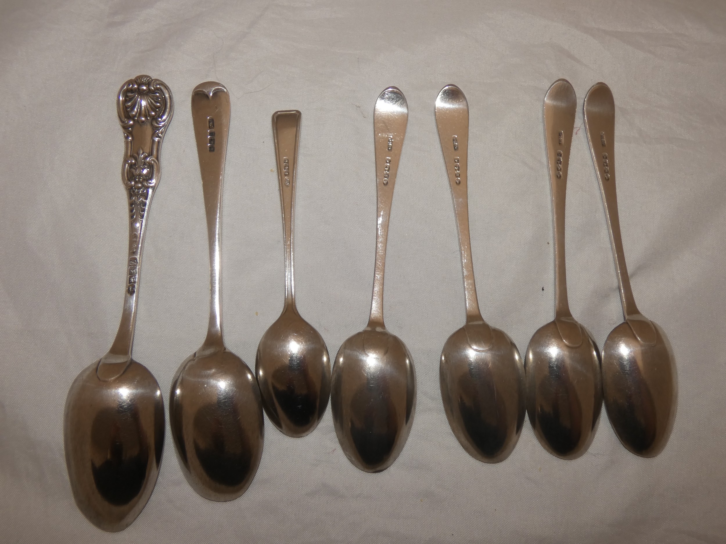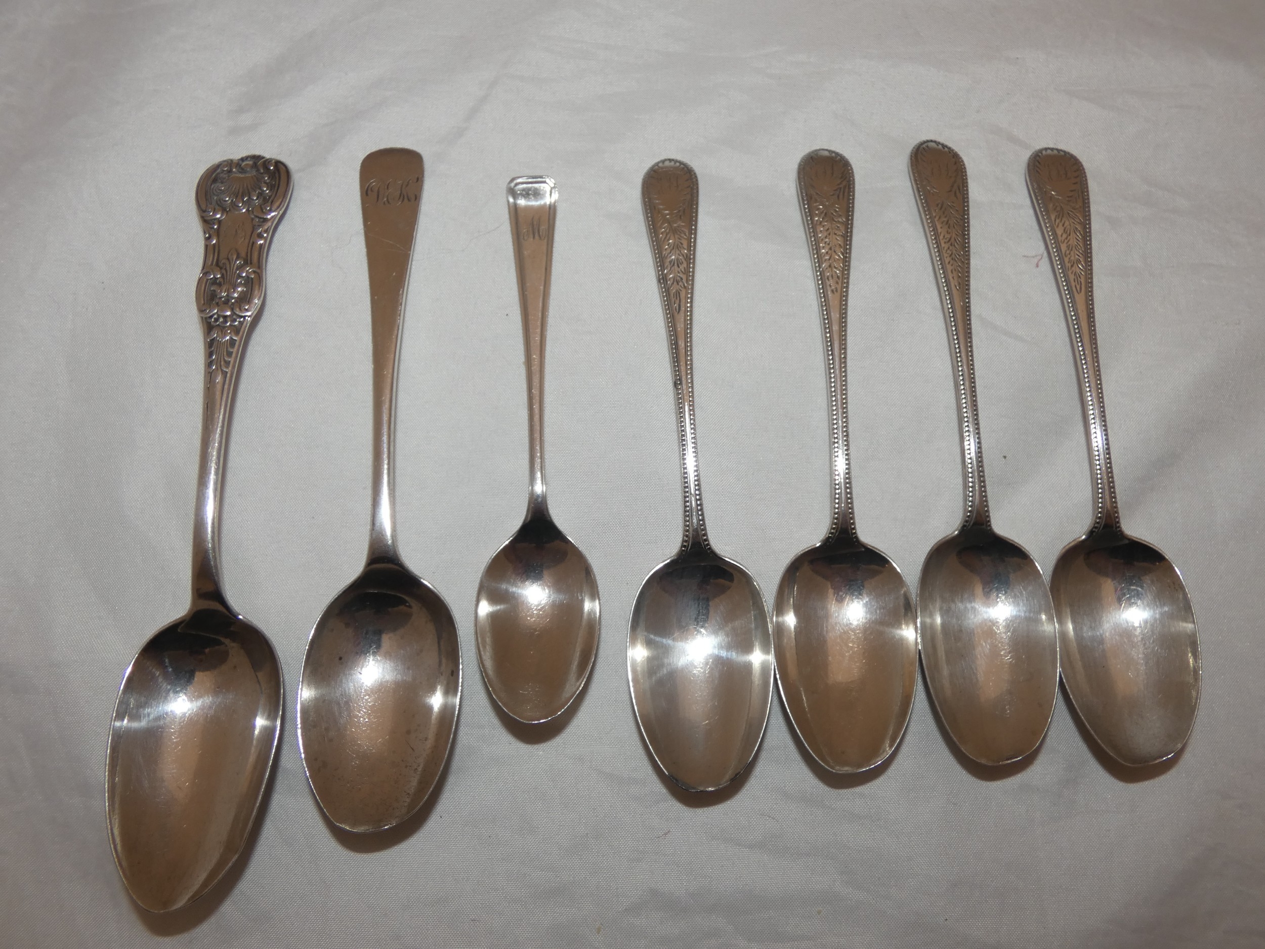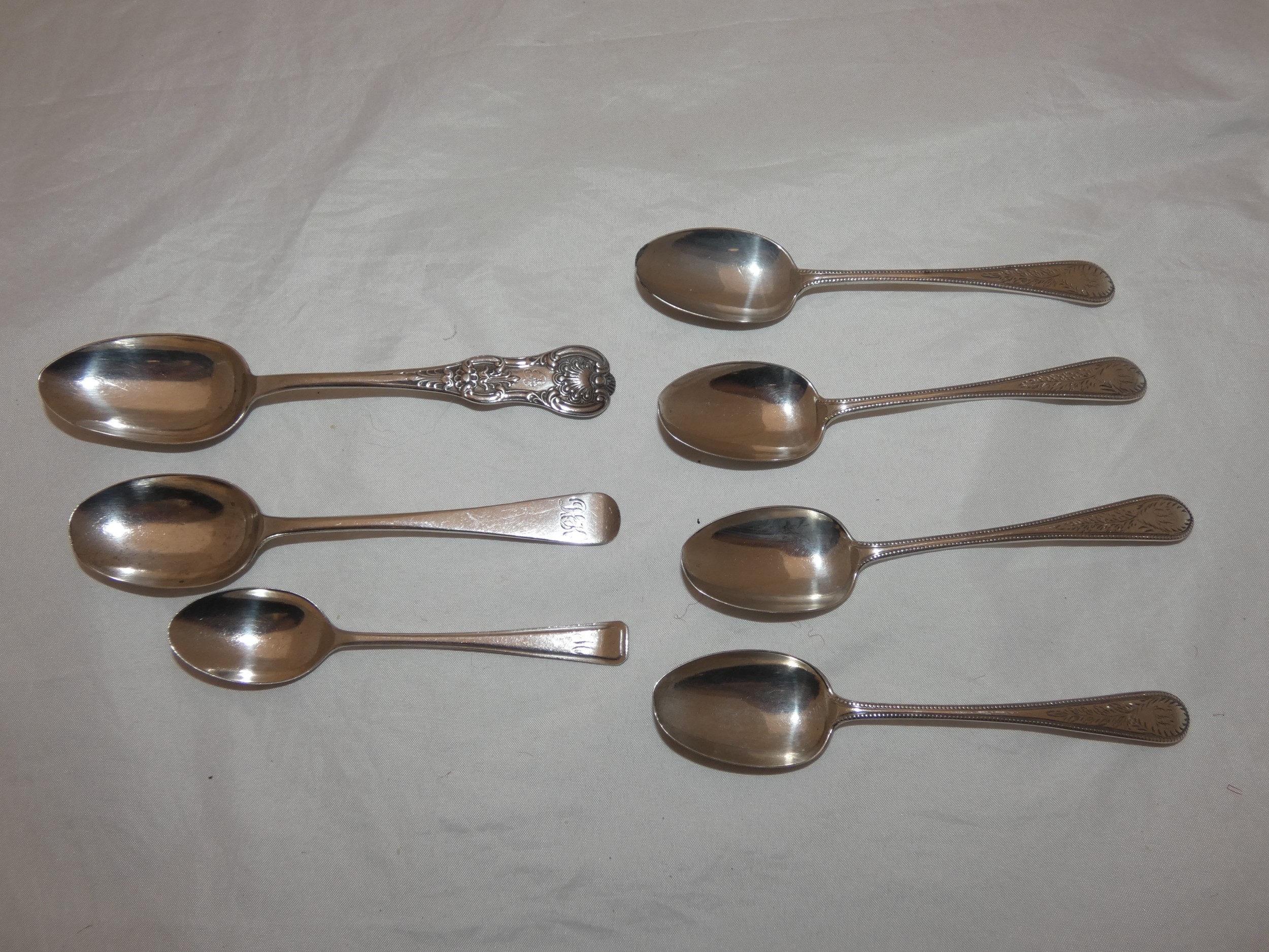 19th century Scottish silver spoon, Glasgow marks, two other silver spoons marked for Birmingham and Sheffield, and a set of four matching Victorian silver teaspoons, London marks, 129g gross. (7)