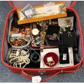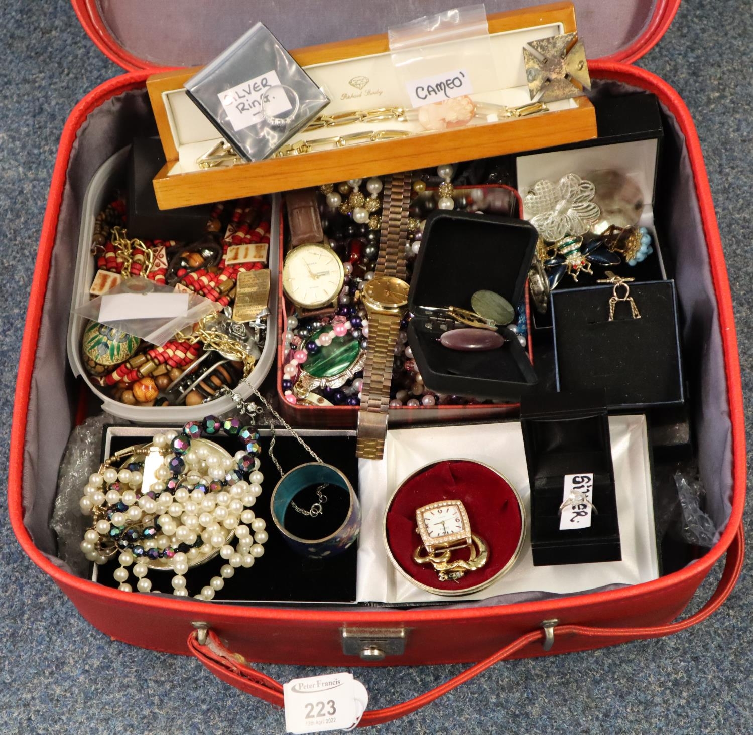 Suitcase comprising assorted vintage and other jewellery, silver cameo pendant, watches, chains, etc.