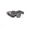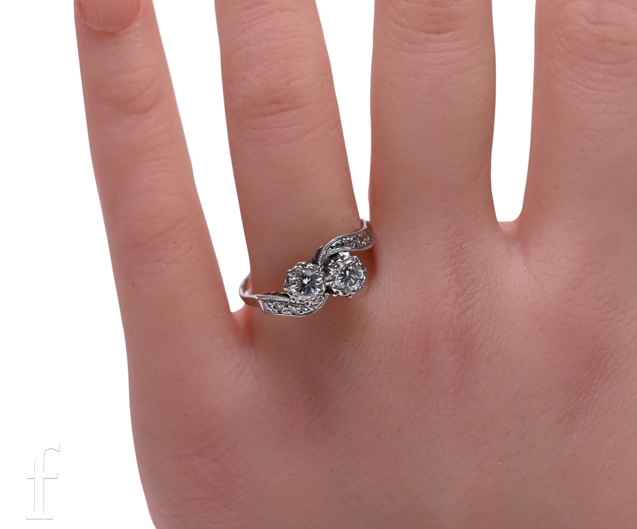 A two stone diamond ring, circa 1951, the brilliant-cut diamonds in fluted collet mounts, above diamond set cross over shoulders, marked '18CT PLAT', total weight 3.3g, ring size S.