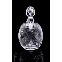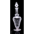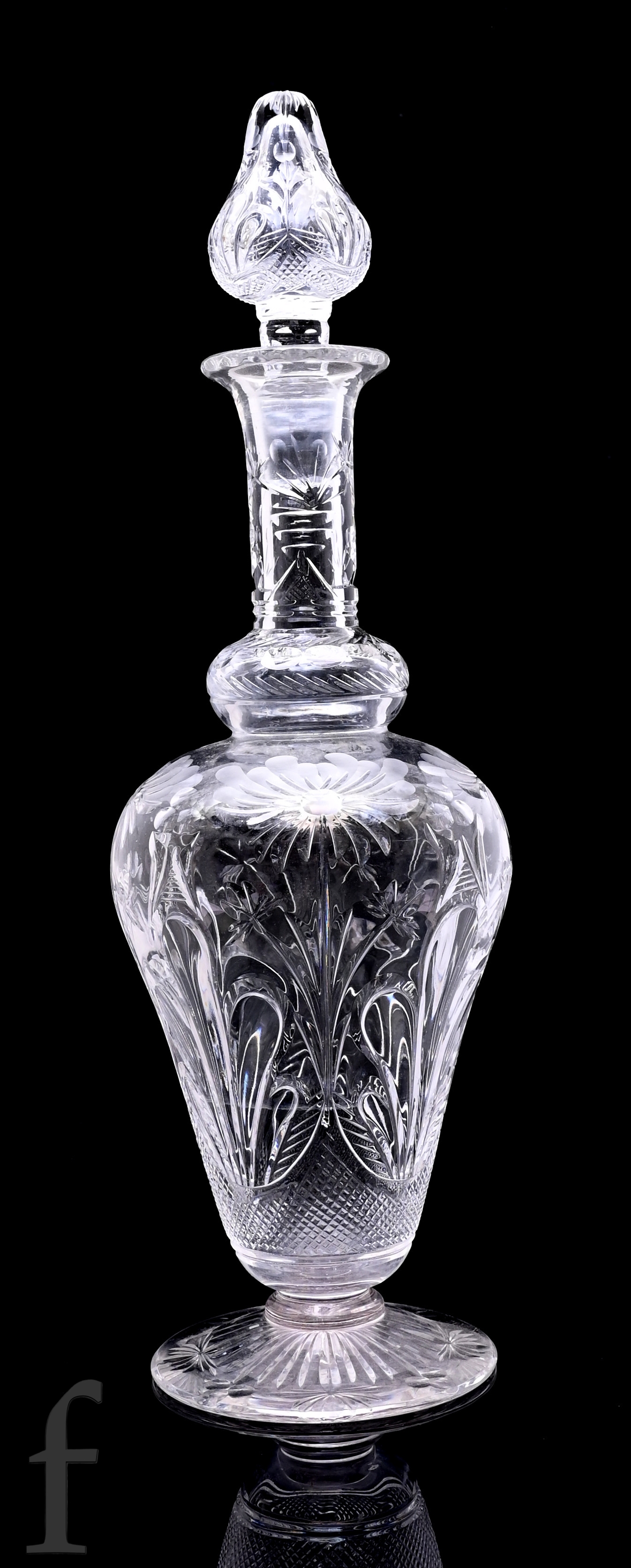 An early 20th Century Stevens & Williams clear crystal glass decanter of footed shouldered ovoid form with shoulder knop and collar neck with matched hollow blown stopper, polished intaglio and engraved with stylised flowers and foliage, height 35cm.