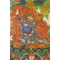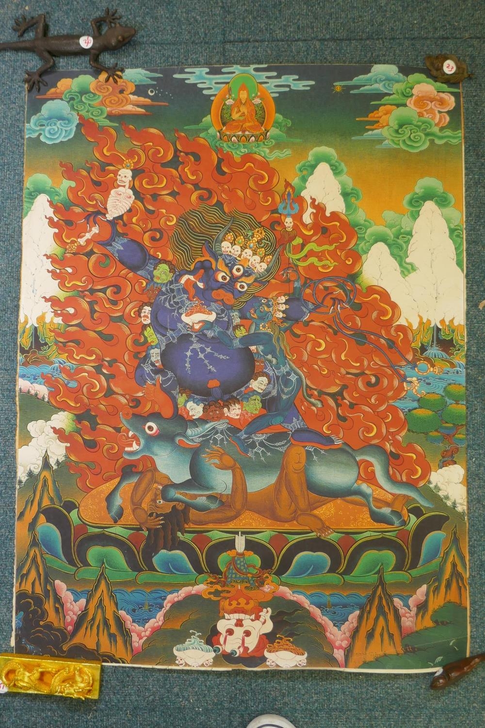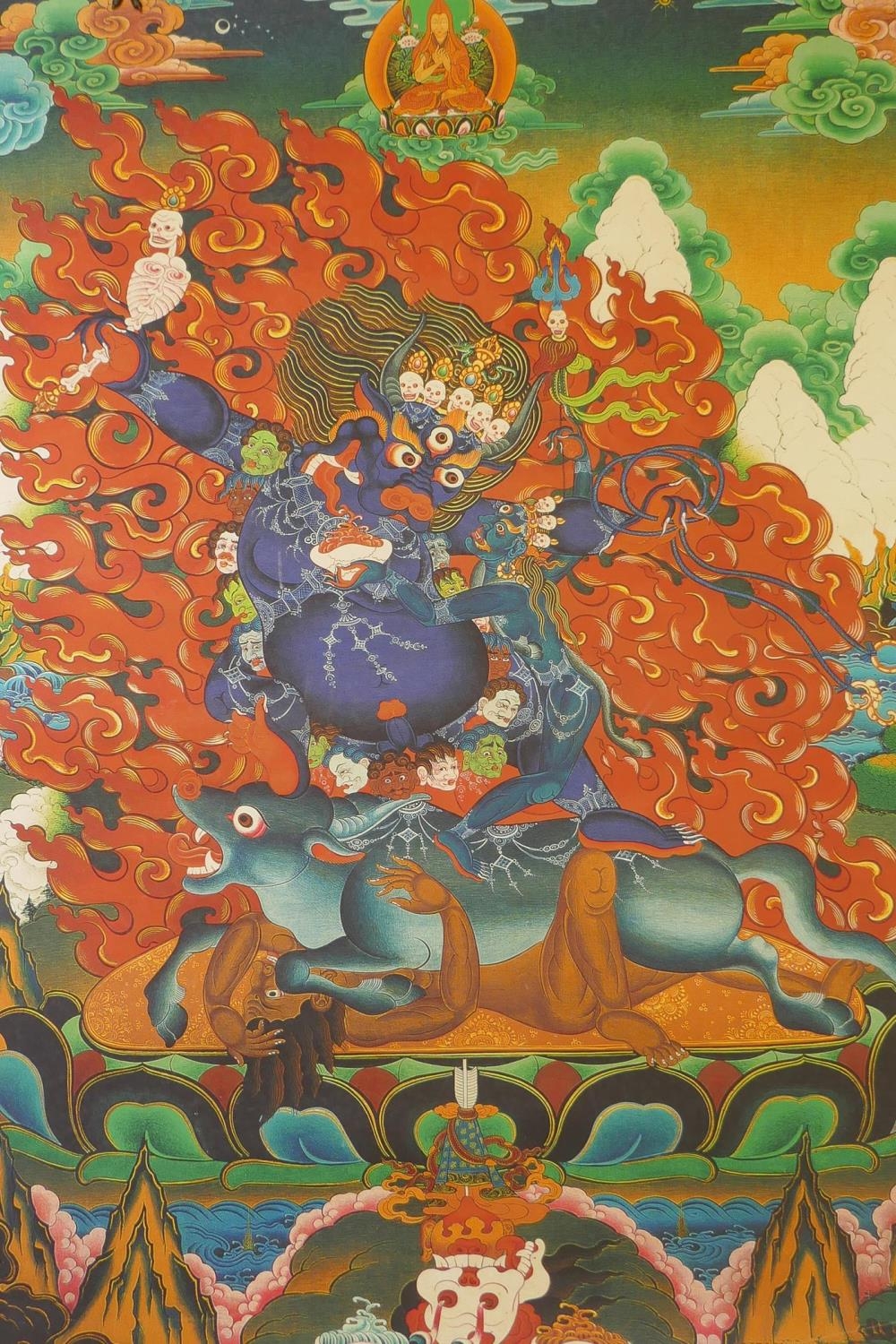 A Tibetan printed thangka depicting Yamaraja Dharmapala, 67 x 89cm