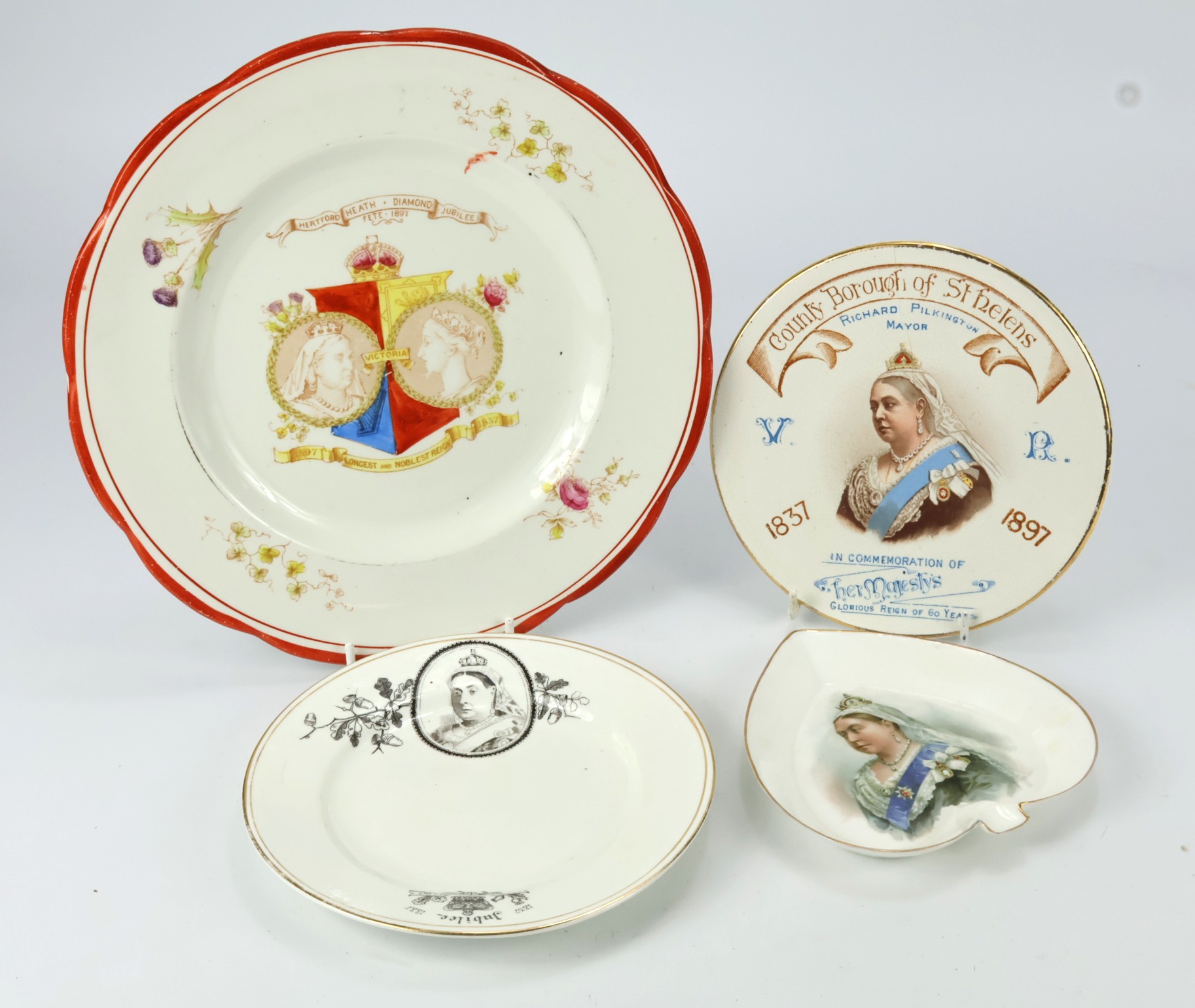 Queen Victoria Interest: a Golden Jubilee plate (1837-1887), along with three Diamond Jubilee plates (1837-1897), one Doulton and in the shape of a heart, one relates to St Helens and has a hairline crack, and the other relates to a fete in 1897 at Hertford Heath
