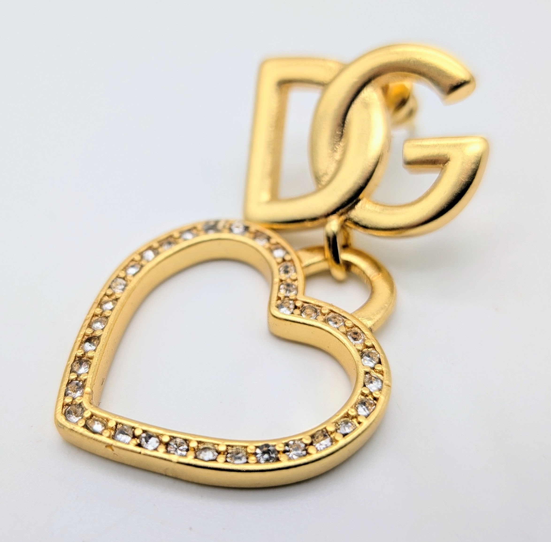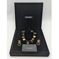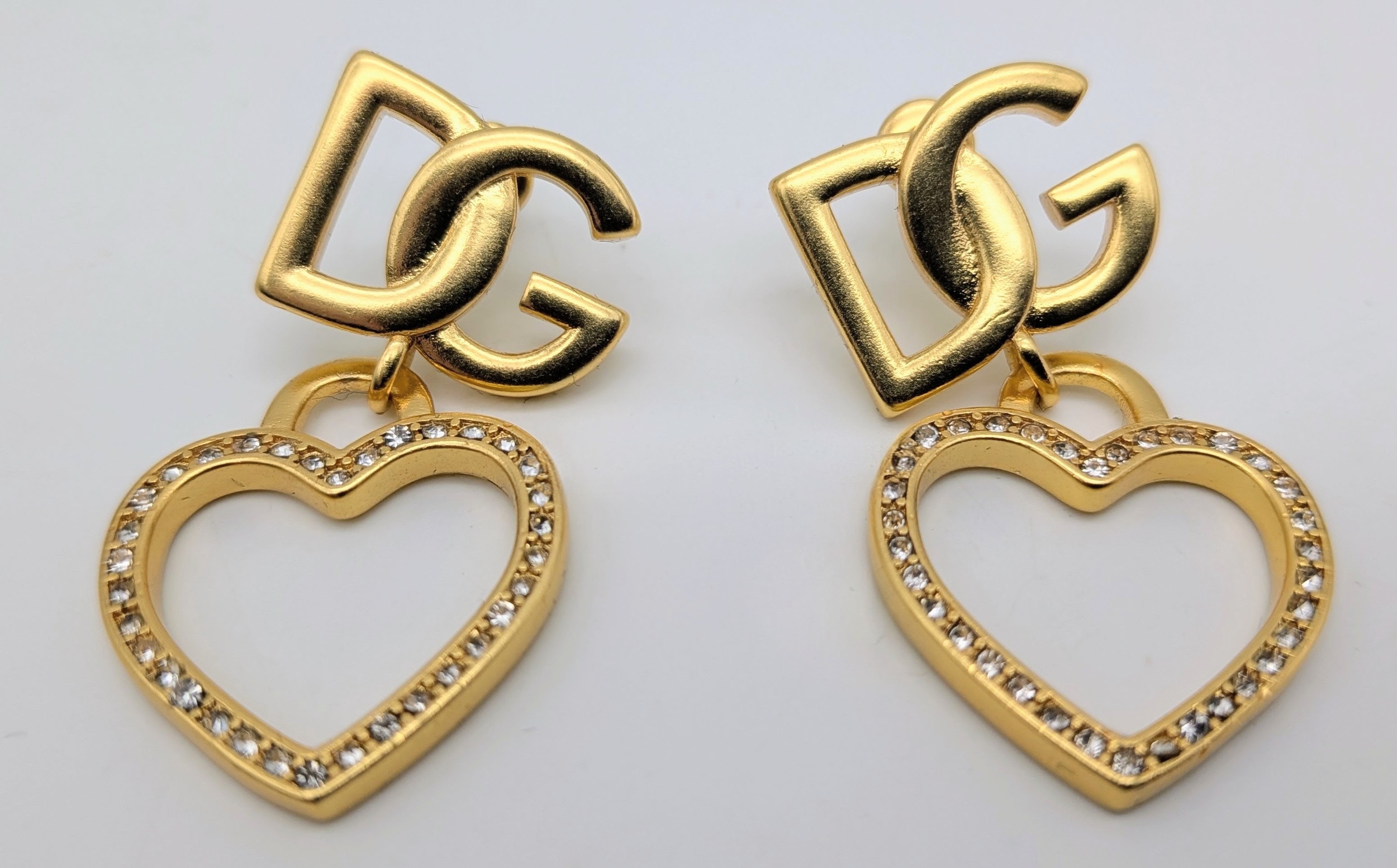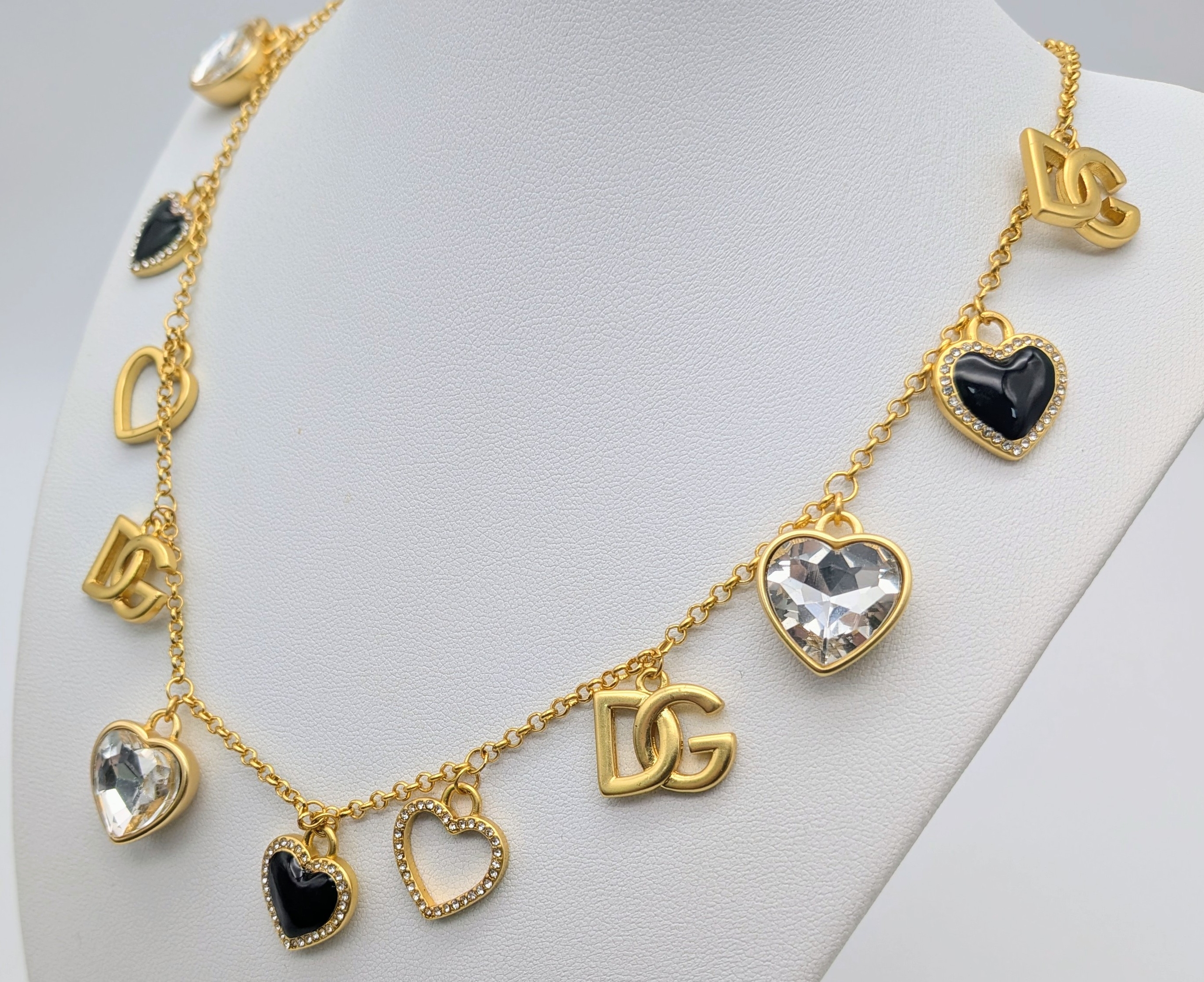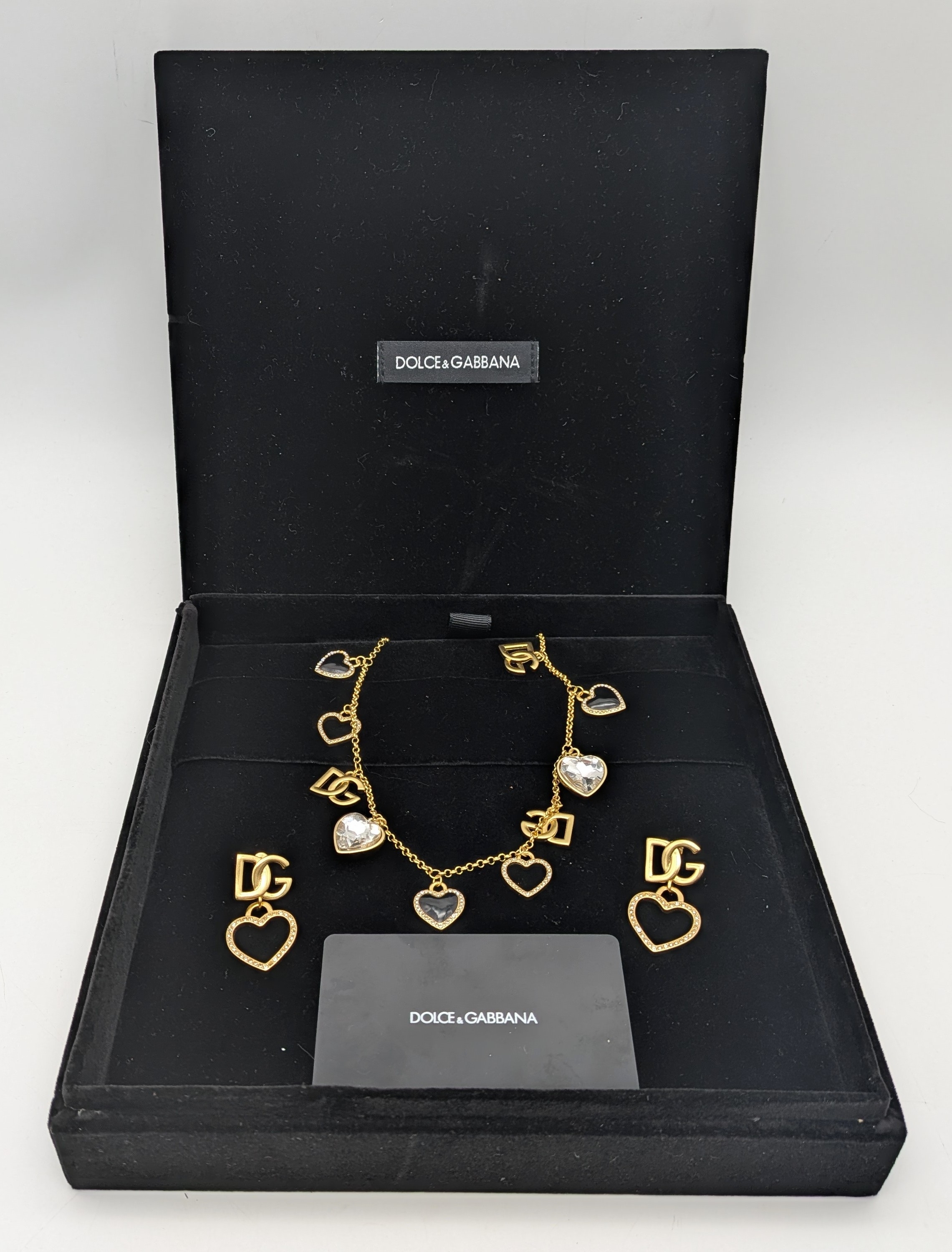 A Dolce & Gabbana Logo and Hearts Necklace and Earrings Set. From the Italian Tailoring Collection. Gold-toned with D&G logos, and white and black stones (one small white stone missing on the necklace). 47cm necklace length, 4cm drop earrings. Comes with presentation case and authenticity card.