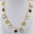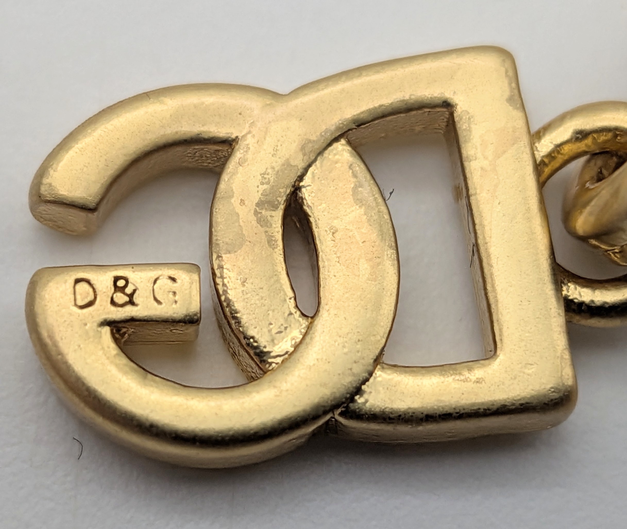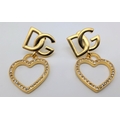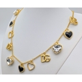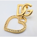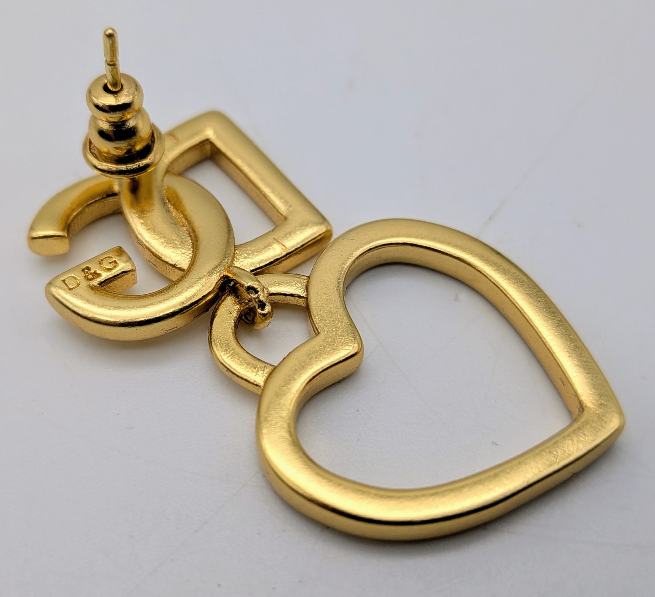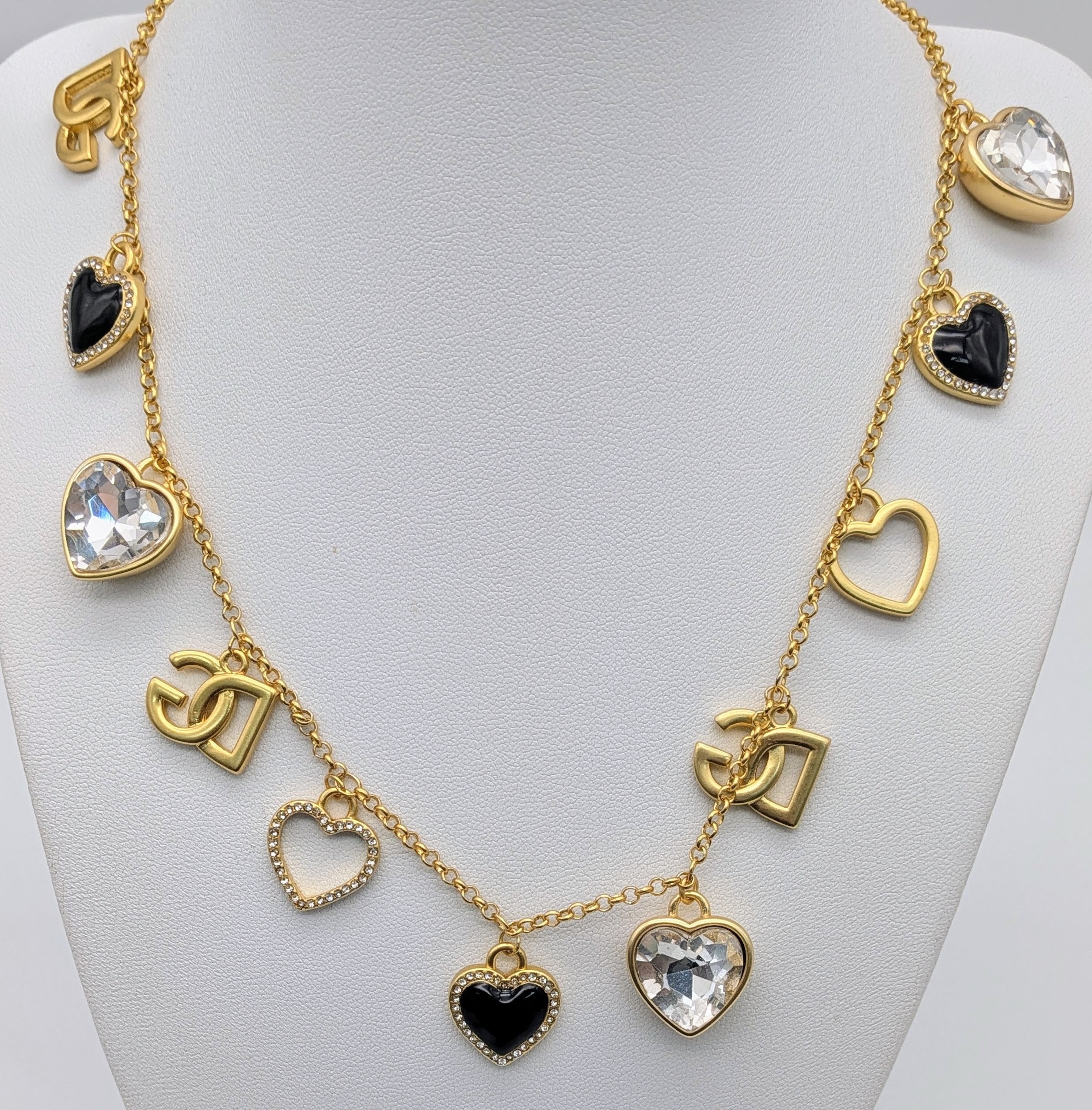 A Dolce & Gabbana Logo and Hearts Necklace and Earrings Set. From the Italian Tailoring Collection. Gold-toned with D&G logos, and white and black stones (one small white stone missing on the necklace). 47cm necklace length, 4cm drop earrings. Comes with presentation case and authenticity card.