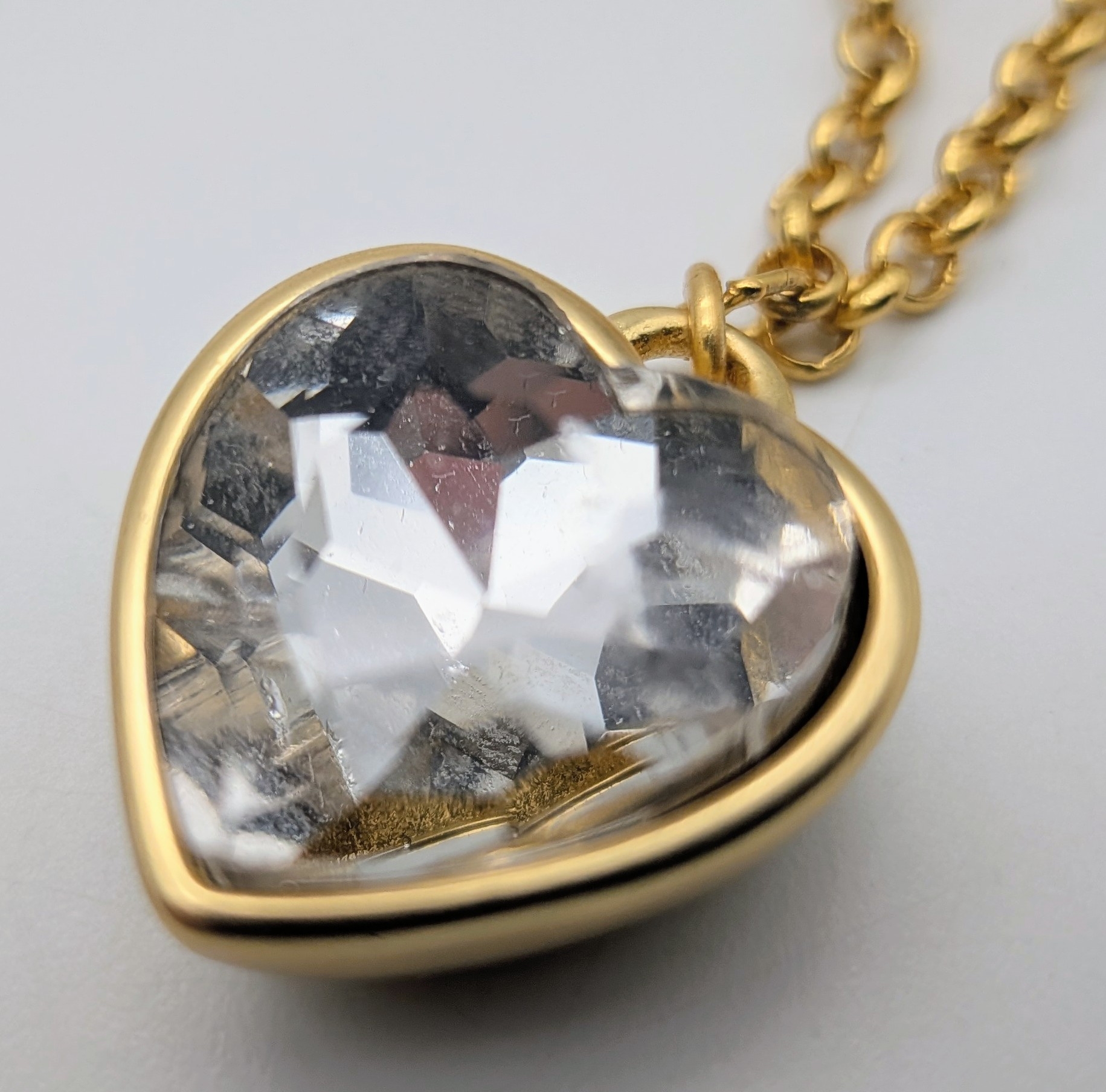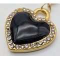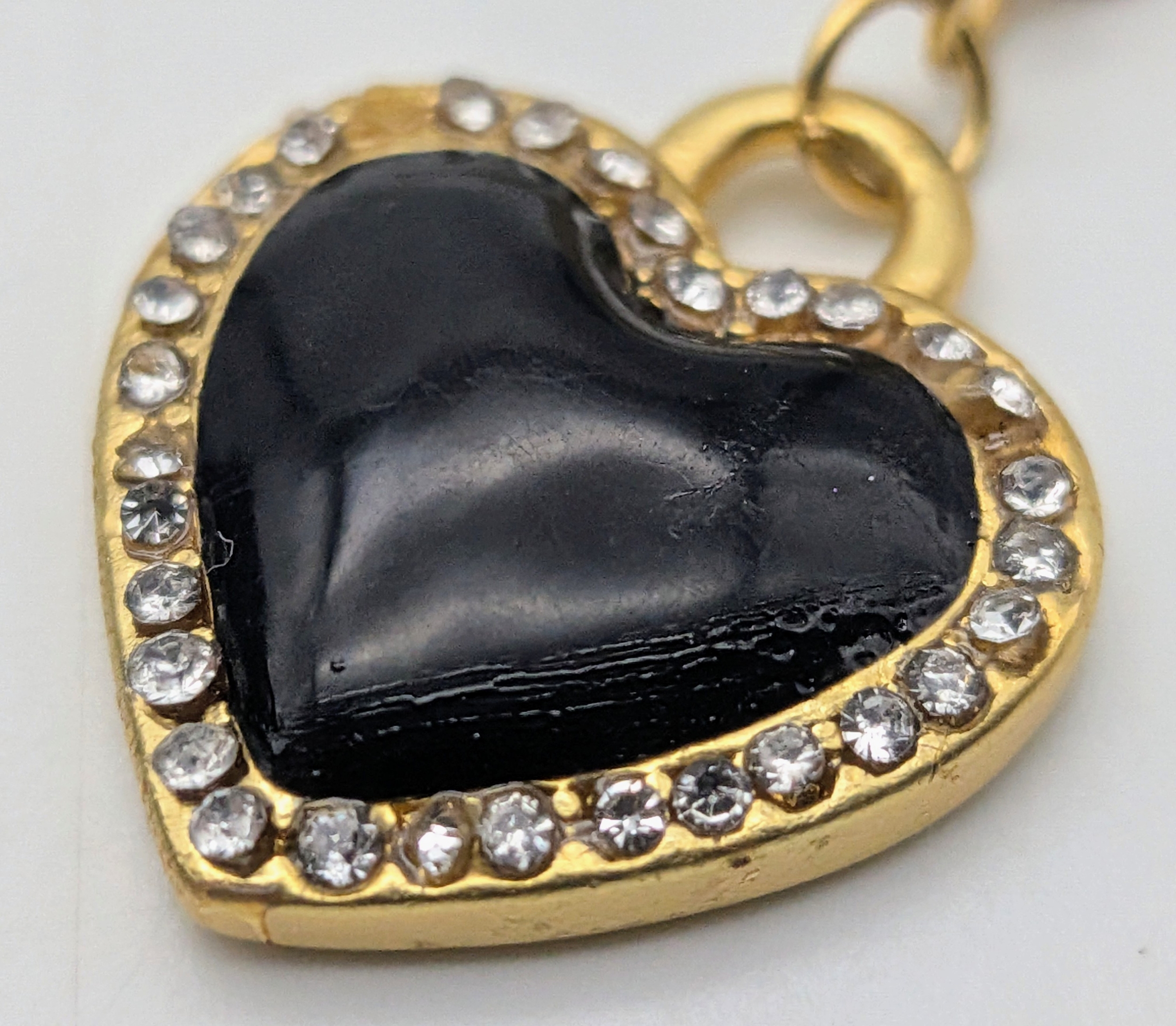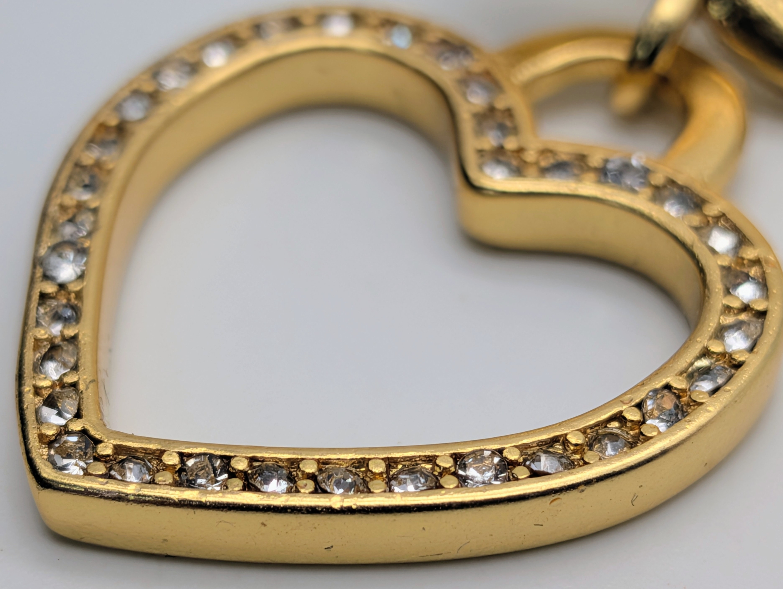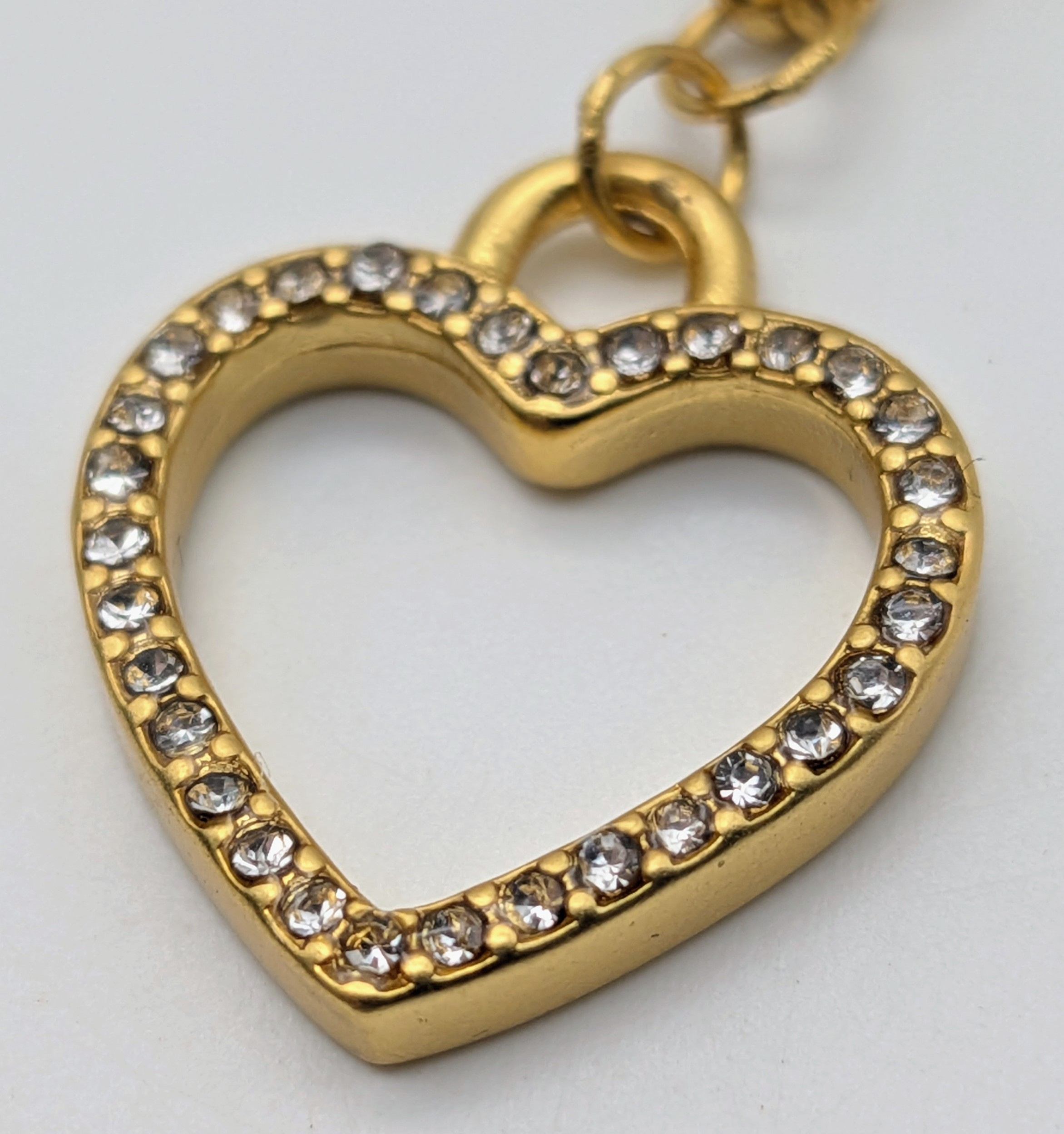 A Dolce & Gabbana Logo and Hearts Necklace and Earrings Set. From the Italian Tailoring Collection. Gold-toned with D&G logos, and white and black stones (one small white stone missing on the necklace). 47cm necklace length, 4cm drop earrings. Comes with presentation case and authenticity card.