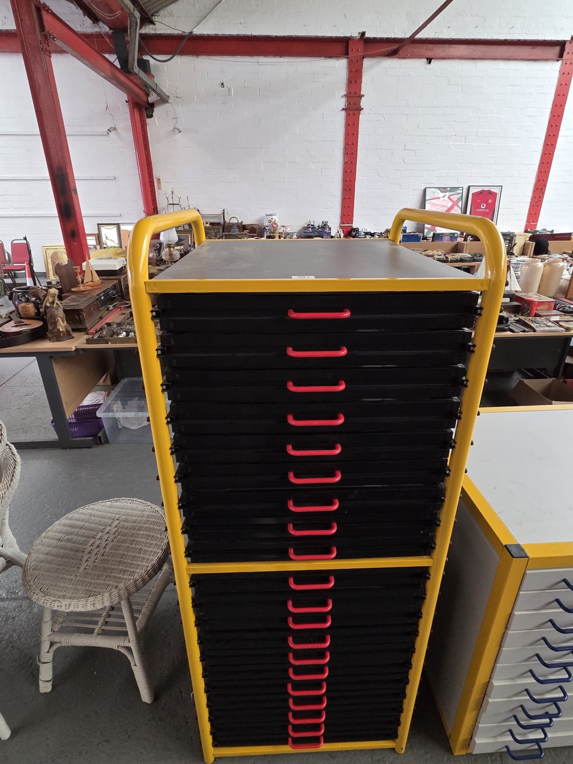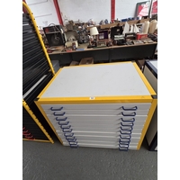 A metal yellow framed multidrawer storage cabinet - 20 drawers
