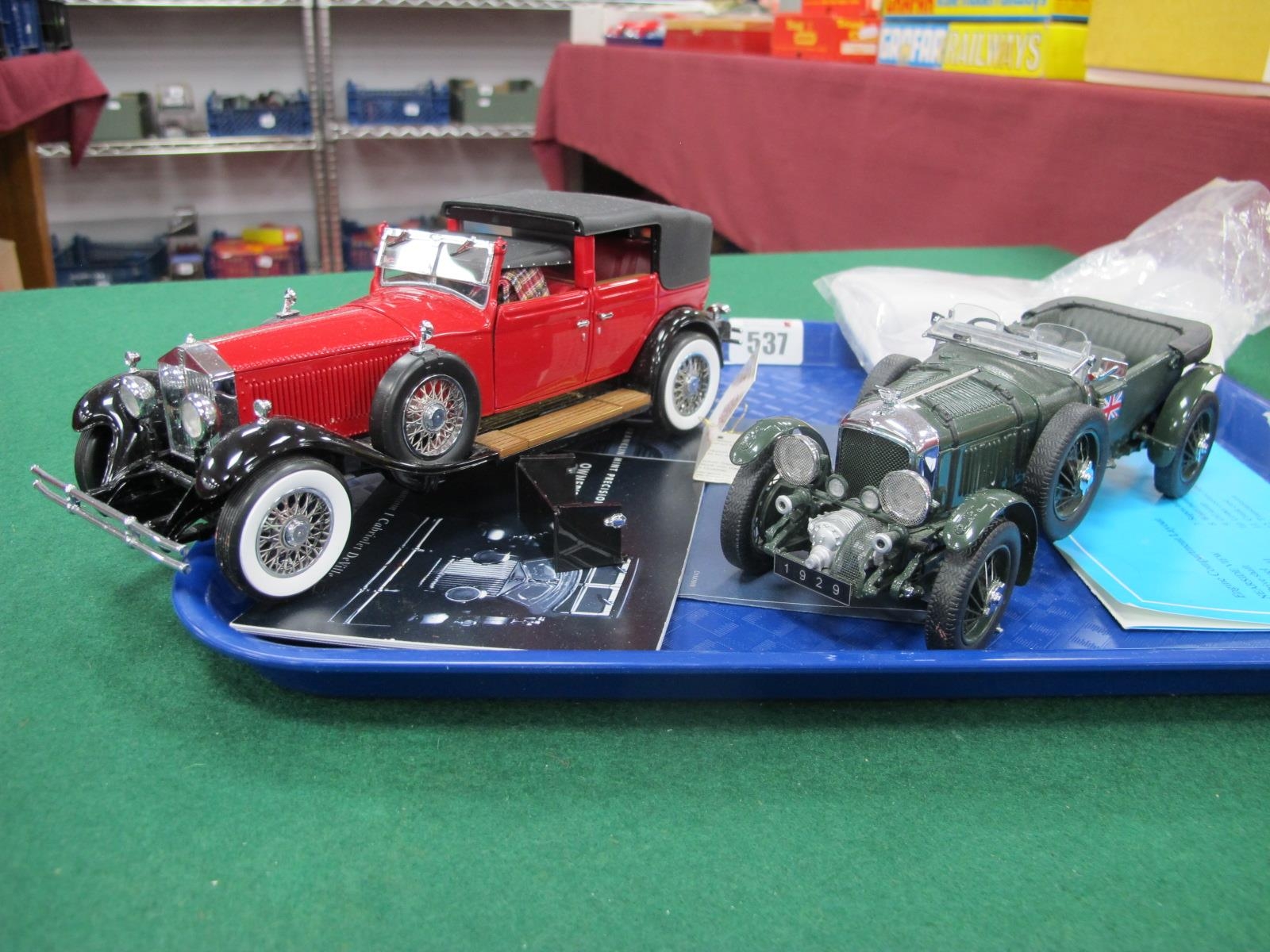 Two 1:24th Scale Franklin Mint Precision Models, comprising of 1929 Rolls Royce Phantom, I Cabriolet Deville, damage to rear luggage box, missing bonnet mascot, rear bumper loose, 1929 Bentley Blower, some literature present, unboxed, small parts may be missing.