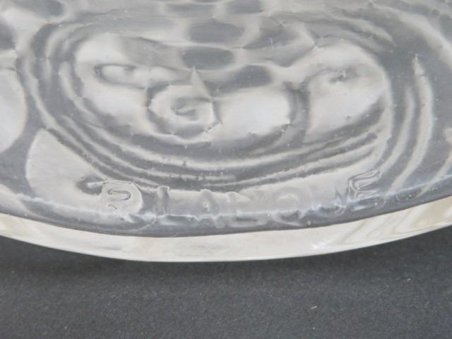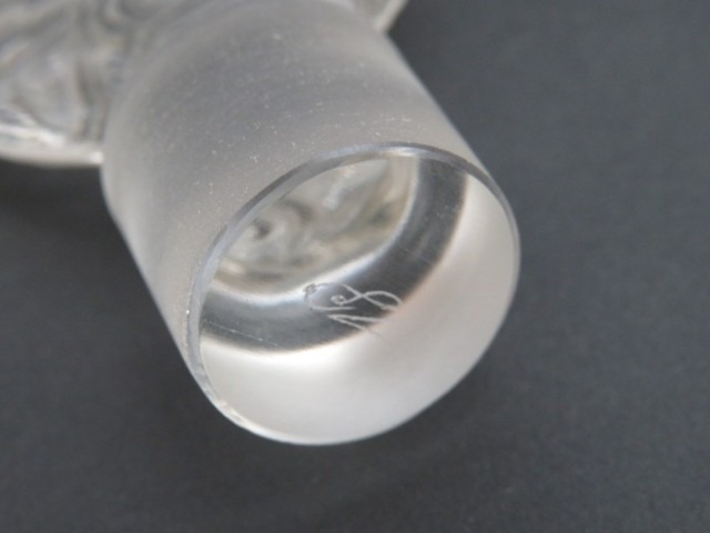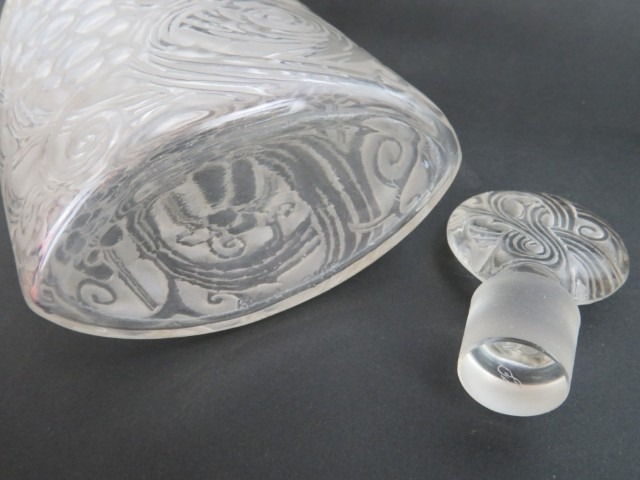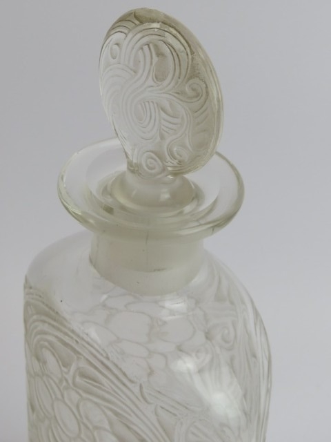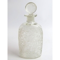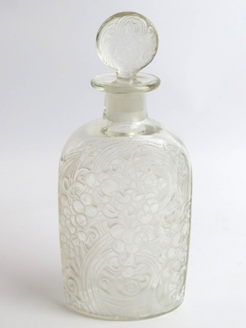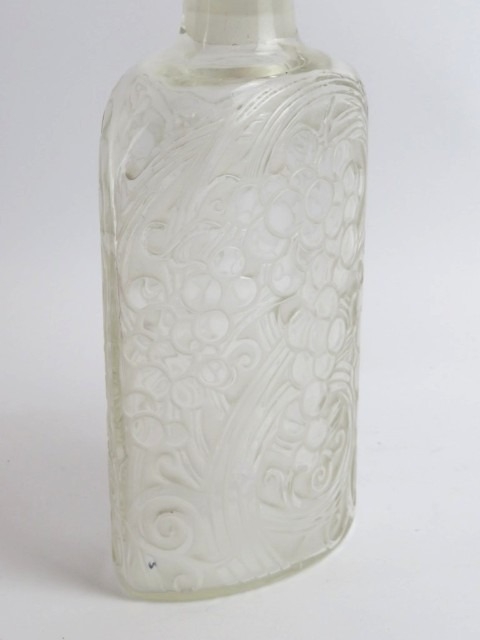 A René Lalique frosted glass ‘Raisins’ decorated carafe with stopper. Moulded R. LALIQUE mark beneath. 27 cm height.