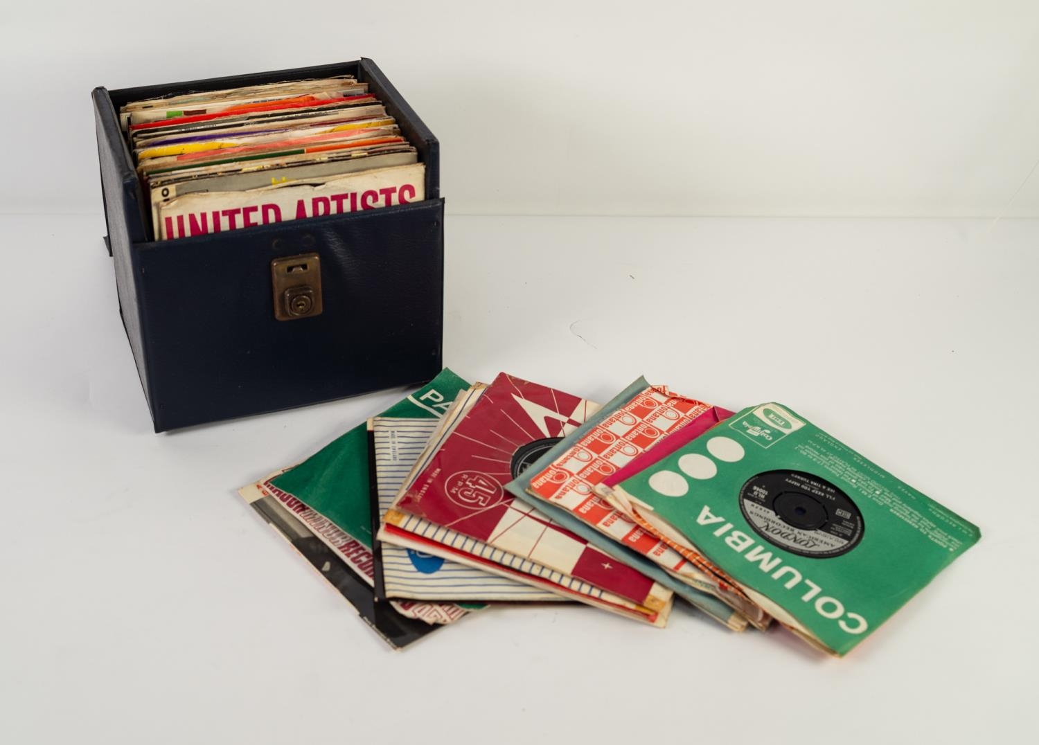 A quantity of 45rpm singles, dating from the 1960s onwards, an eclectic mix of genre and artists, PROCOL HARUM, THE BEATLES, ADAM FAITH IKE & TINA TURNER, MARIANNE FAITHFUL, NORMAN VAUGHAN, MILLIE, SEVERINE, JAON BAEZ, ELVIS PRESLEY, FERRANTE AND TEICHER, MAMA CASS, THE WALKER BROTHERS, P J PROBY, ROY ORBISON, RICHARD ANTHONY ETC, housed in a vintage, singles carry case, with some loose. Condition-Various. (74)