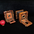 Two Victorian antique Mahogany and brass 'J. Lancaster & Son Birmingham' folding plate instantograph field cameras. One labelled 'Merveilleux Patent' with lens intact. The other without lens.