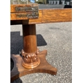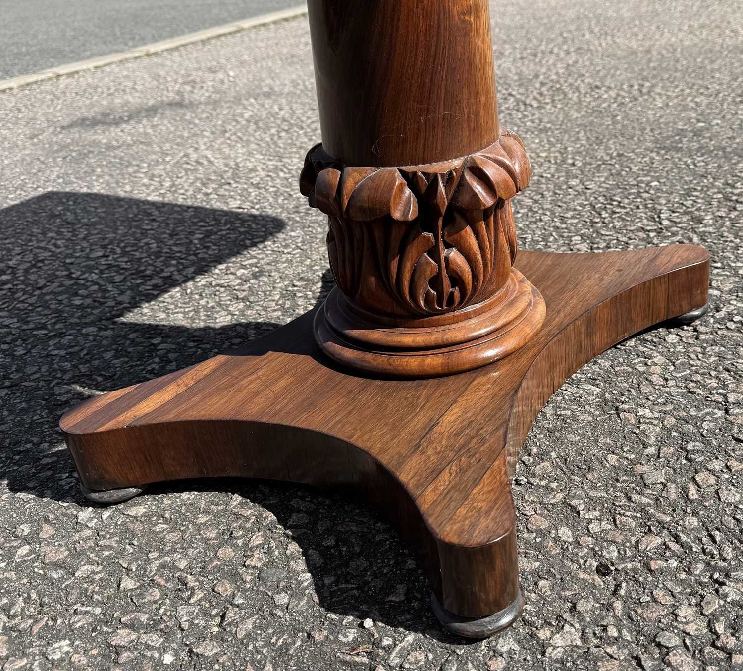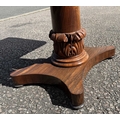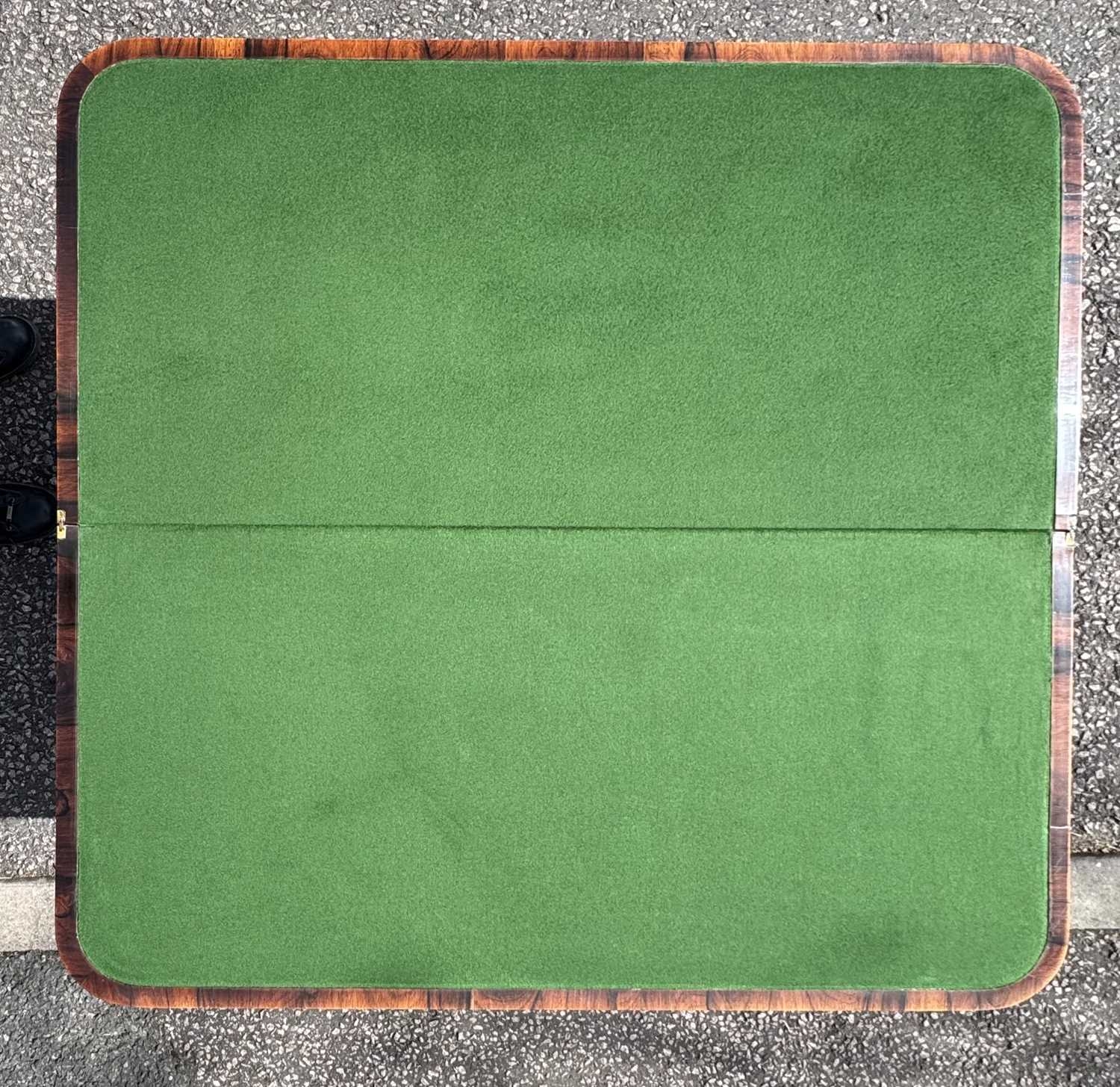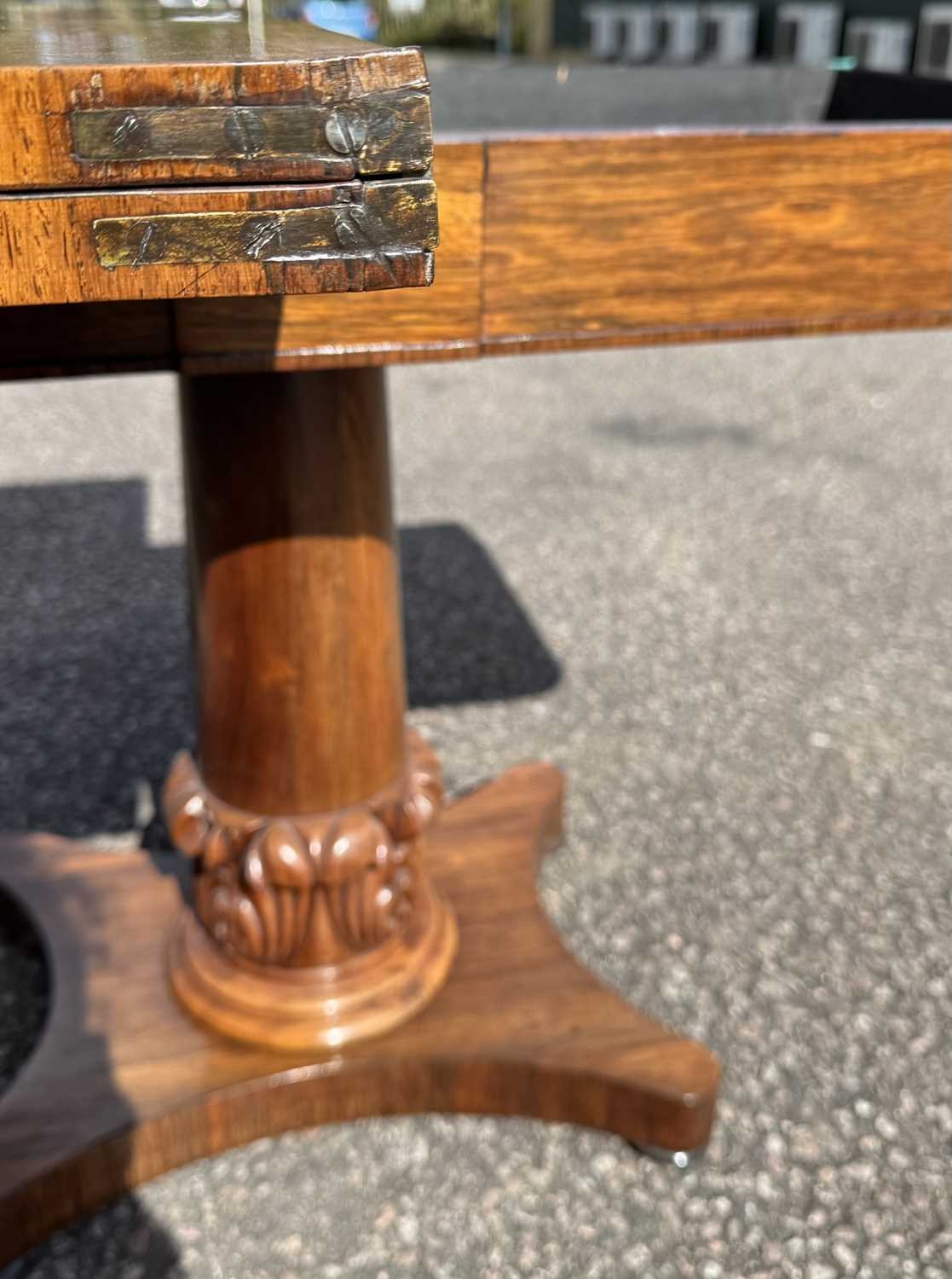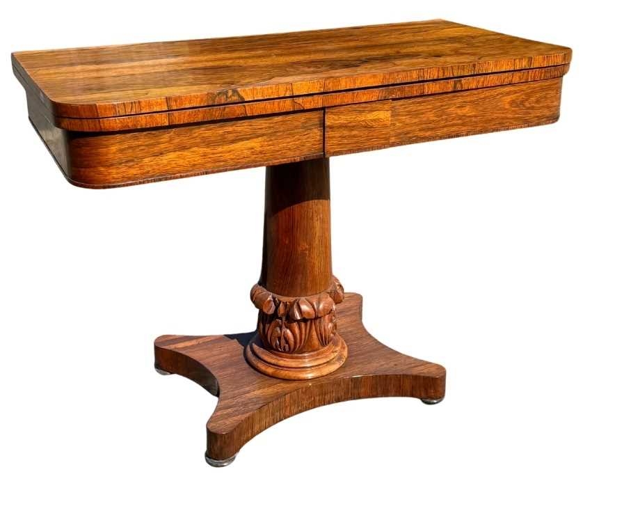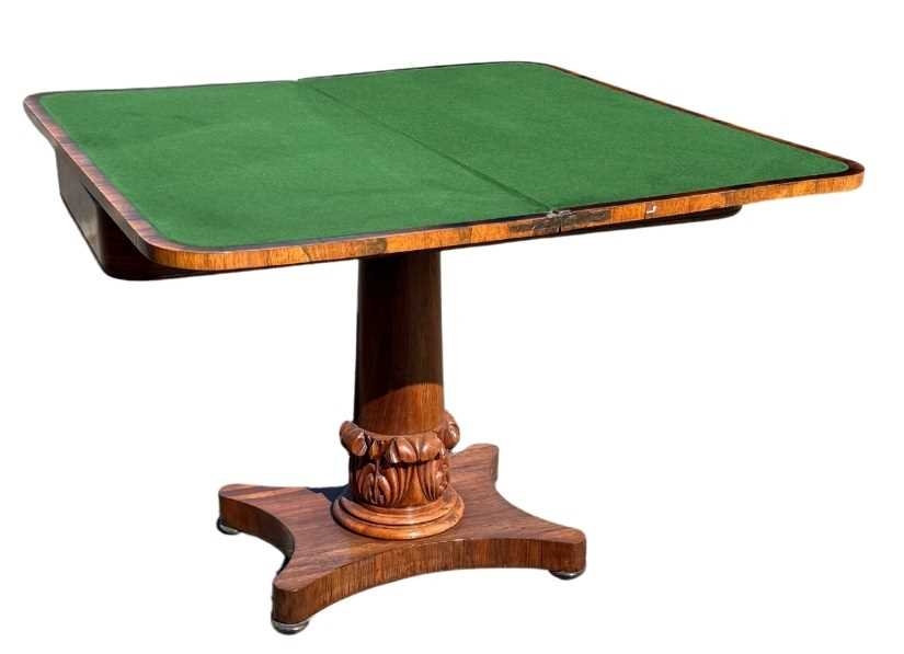 A mid 19th century rosewood foldover games table, central column sitting on acanthus carved support, down to plinth and four bun feet, opening to green baize, height 68.5cm, width 92cm, depth when closed 45.5cm (1)