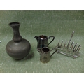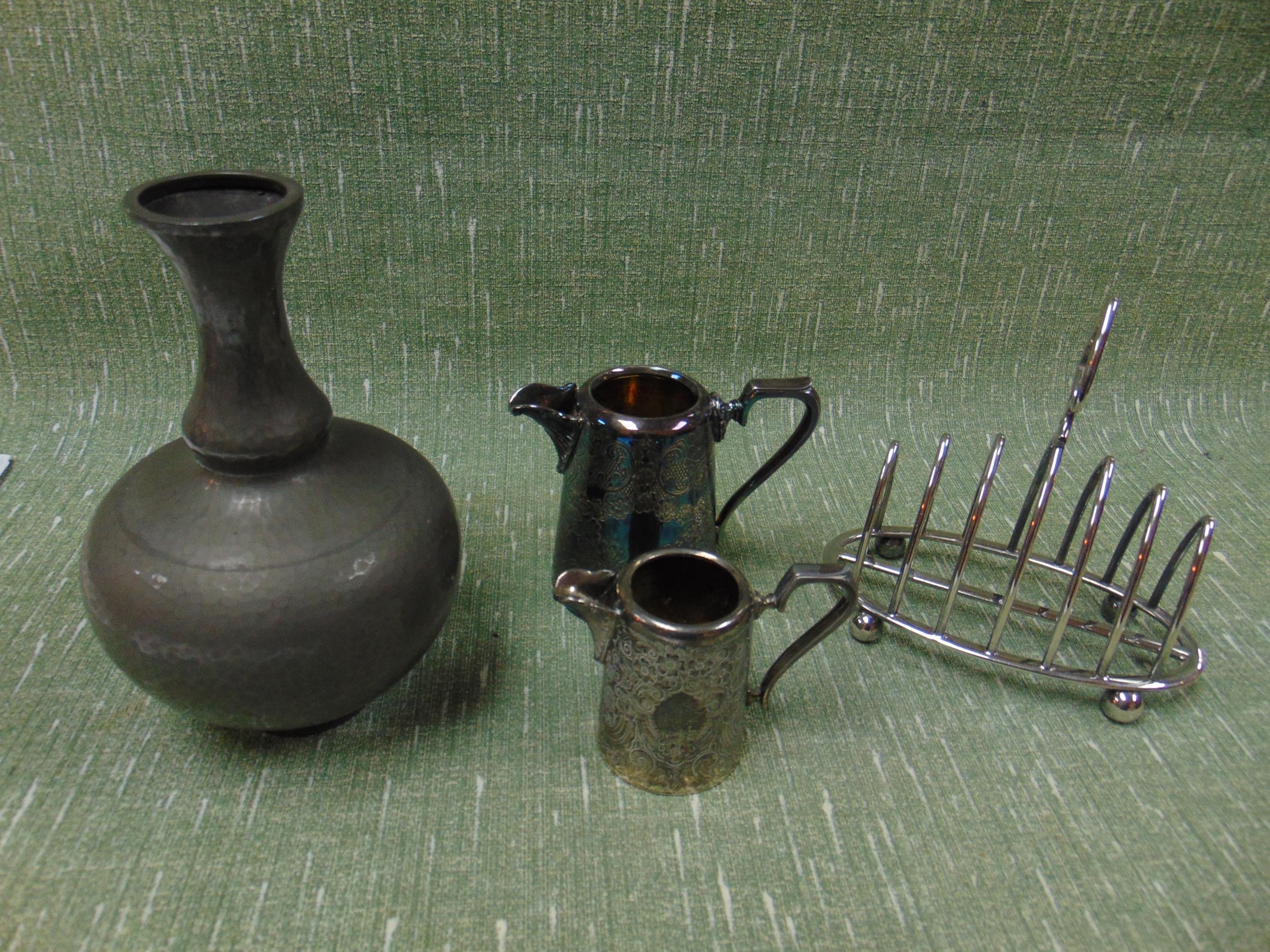 English Pewter vase, The Lowesby, plated toast rack and two plated jugs.