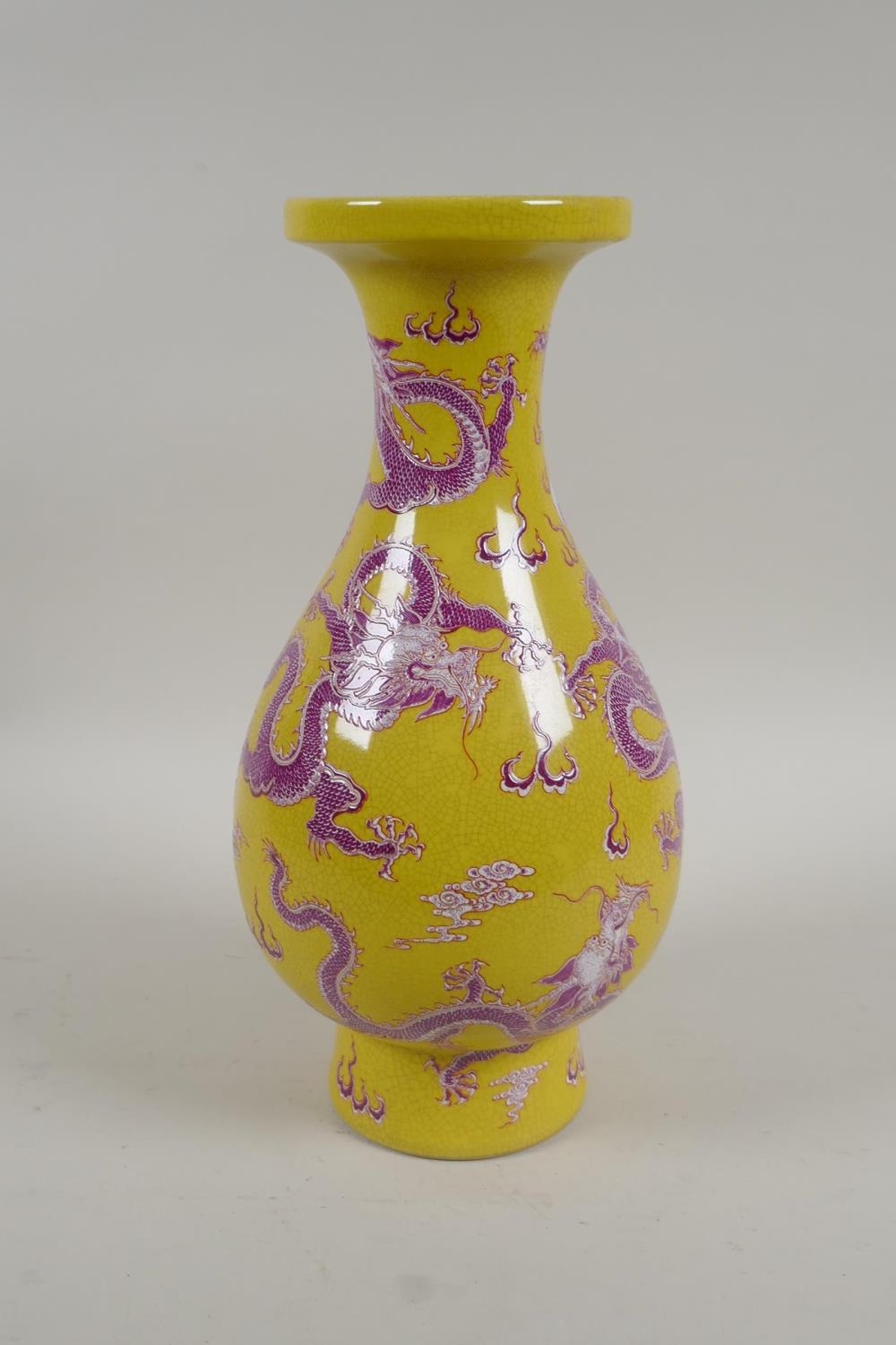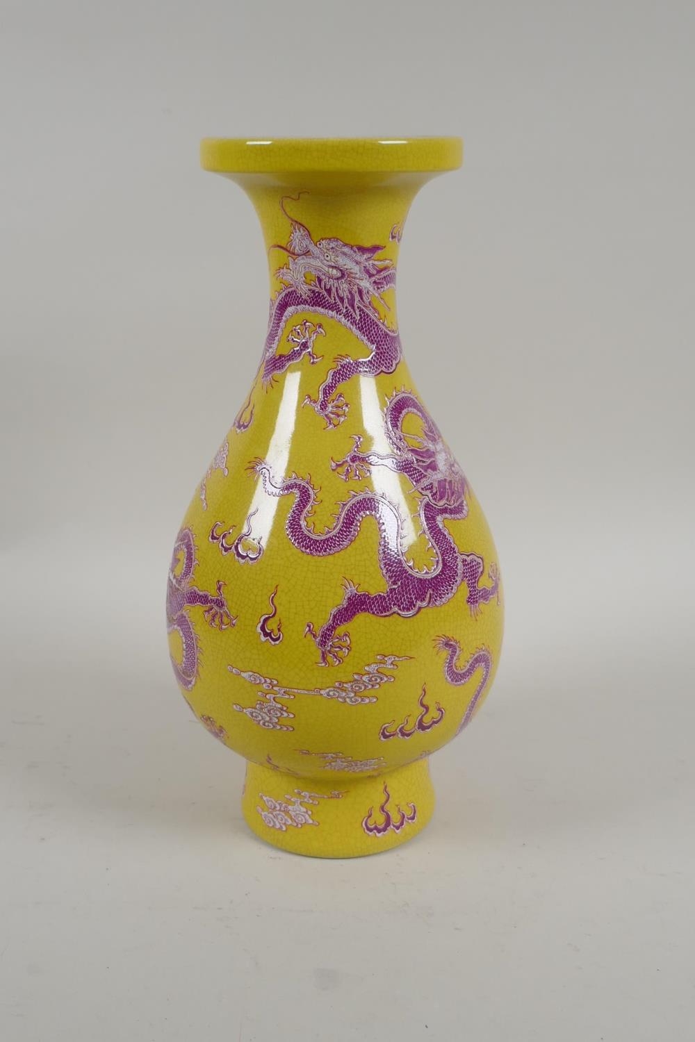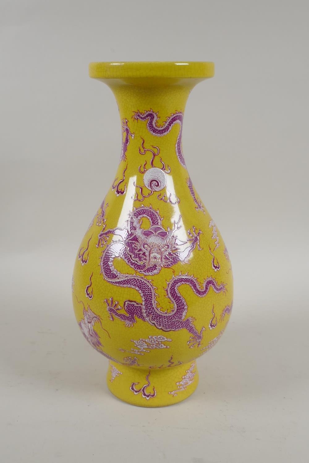 A Chinese yellow crackleglazed porcelain pear shaped vase, with enamel decoration of dragons and flaming pearl, KangXi 6 character mark to base, 27cm high