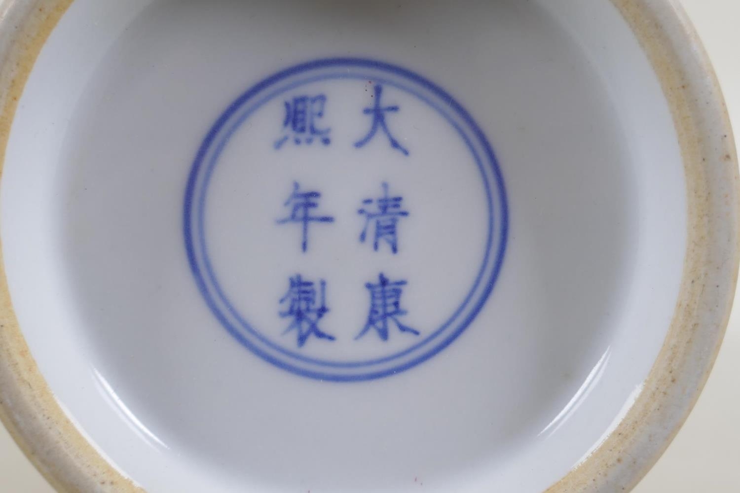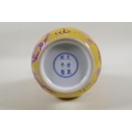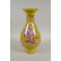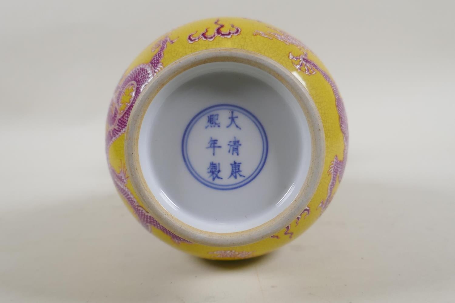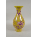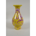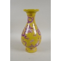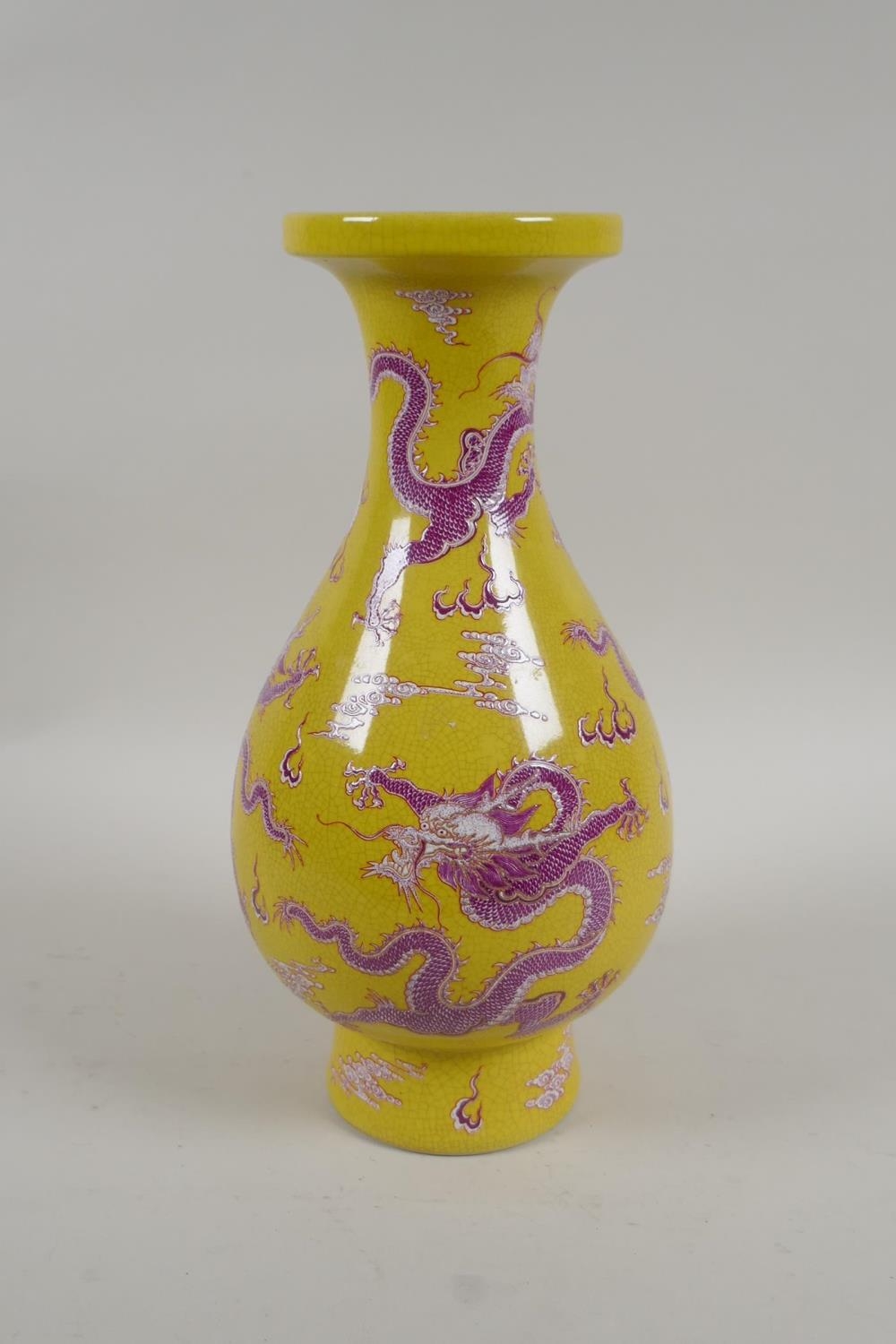 A Chinese yellow crackleglazed porcelain pear shaped vase, with enamel decoration of dragons and flaming pearl, KangXi 6 character mark to base, 27cm high