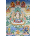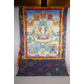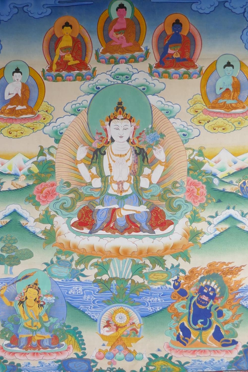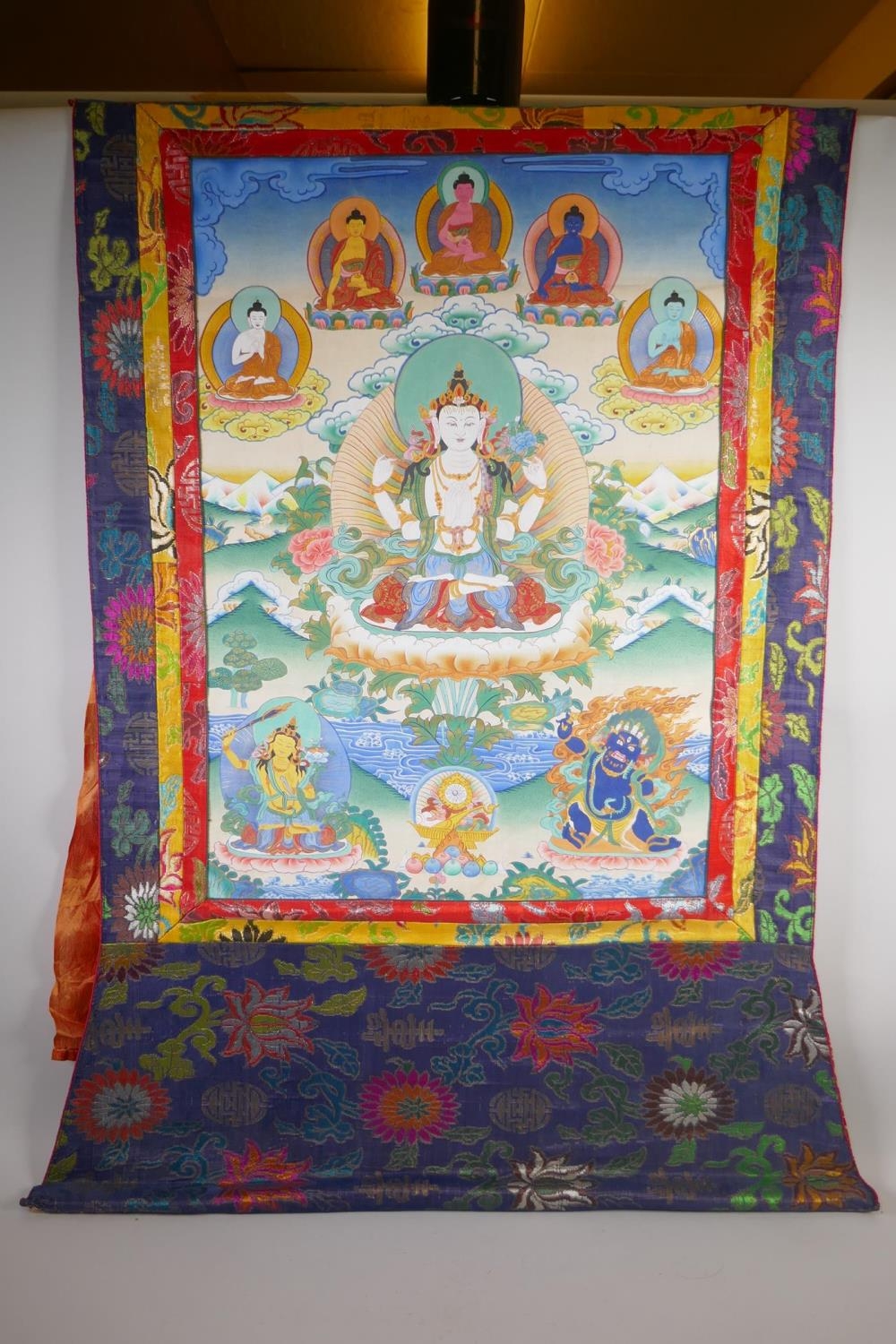 A Tibetan painted thangka depicting Avalokiteshvara, mounted in a silk surround, image 48 x 66cm
