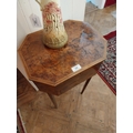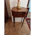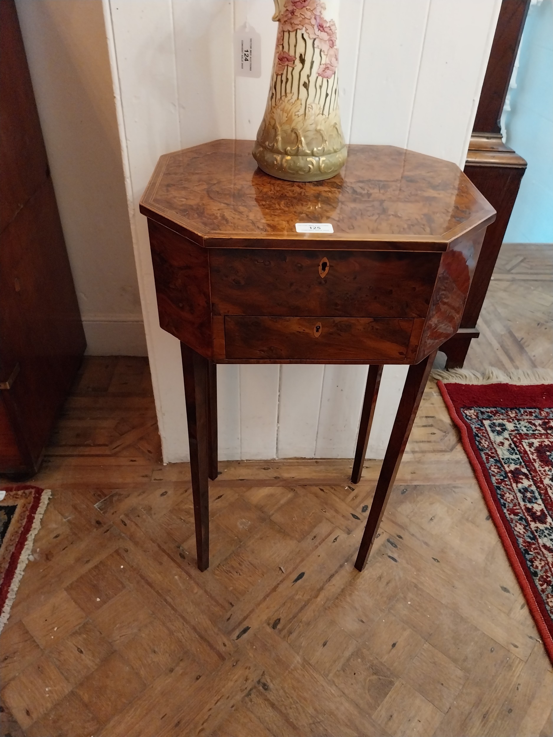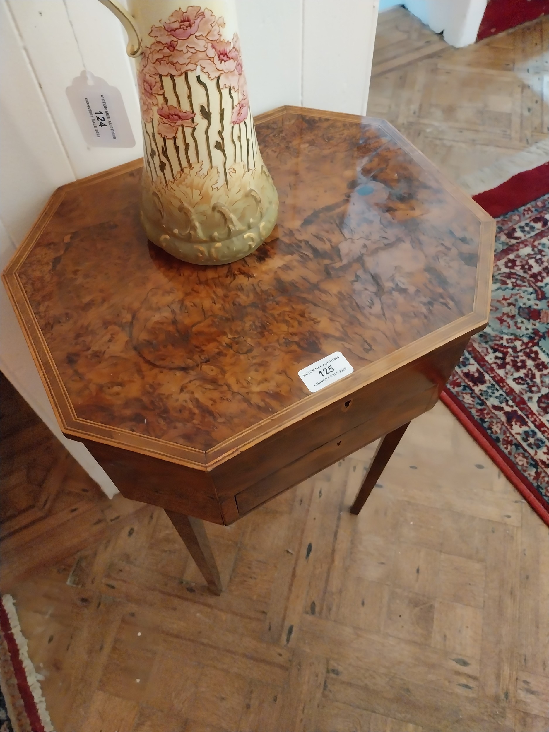 19th. C. burr walnut with satinwood inlay sewing table, raised on square tapered legs. { 68cm H X 40cm W X 32cm D }.