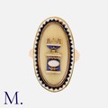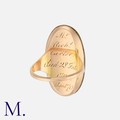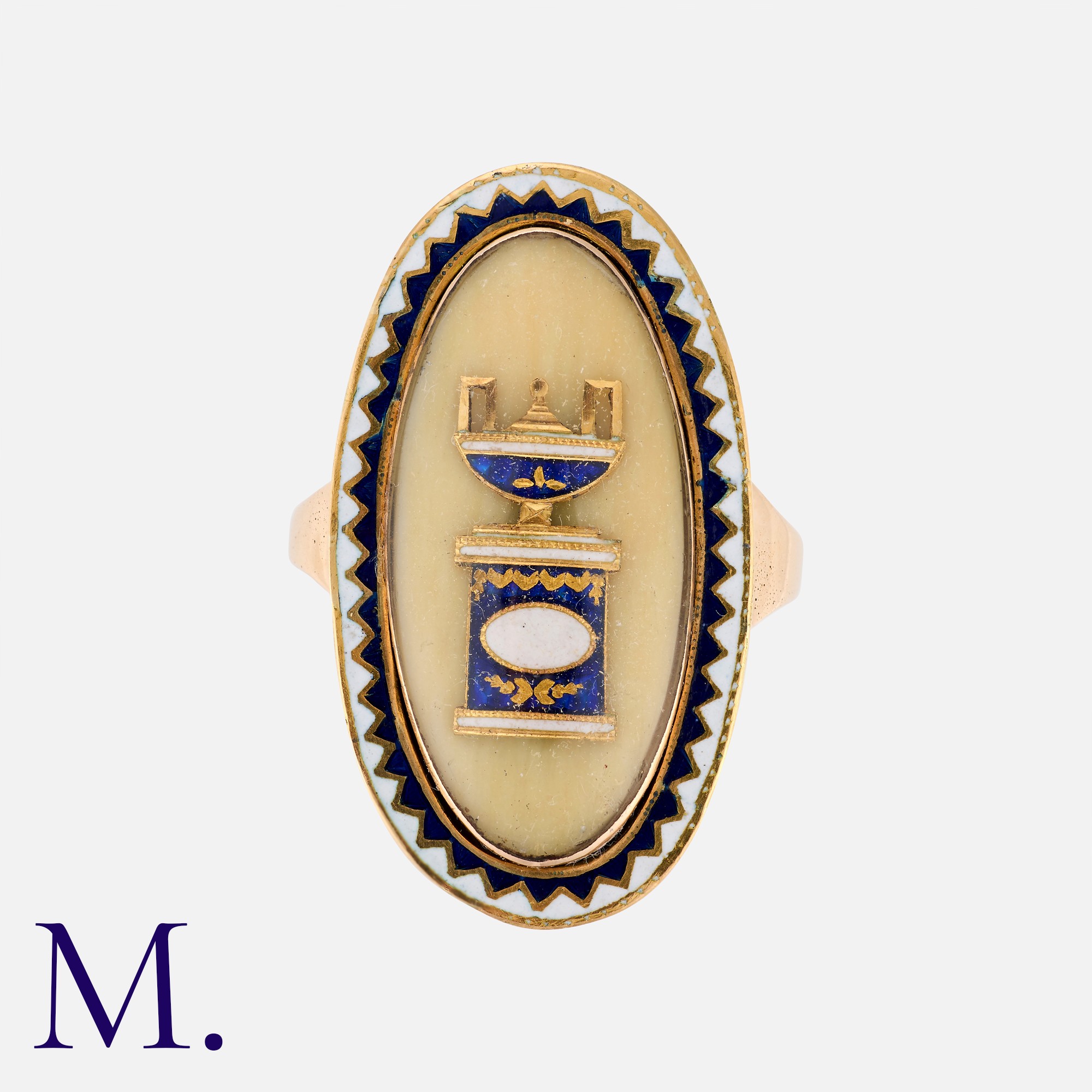 An Antique Enamel Mourning Ring in yellow gold, the oval shaped face with a blue and white enamelled urn motif, the reverse engraved ' Mr. Rich Carter, died 28 Feb 1792 aged 70' Unmarked but tests indicate gold.