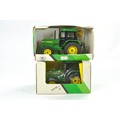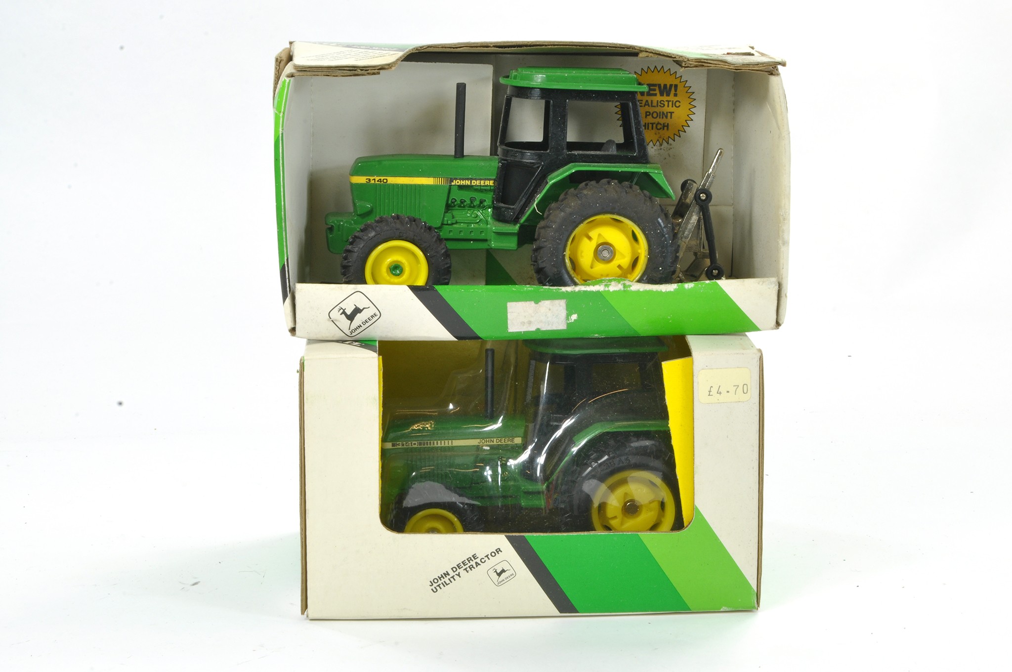Ertl 1/32 Tractor duo comprising John Deere 3140 plus another with hitch. Good, some wear to one, the other excellent in boxes with storage wear.