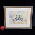 A charming original 'S.M.B Clancy' watercolour and pencil on paper painting titled 'Still Life'. Features a still life study with fruits on a plate. Rendered in soft subtle colours of lilacs, greens and oranges. Portrays fluid brushstrokes creating translucent washes. Signed and dated '2003' lower right. Titled to lower left. Housed in a wooden frame behind glass. Slight damage to glass.