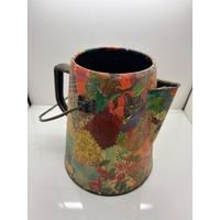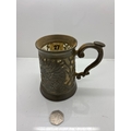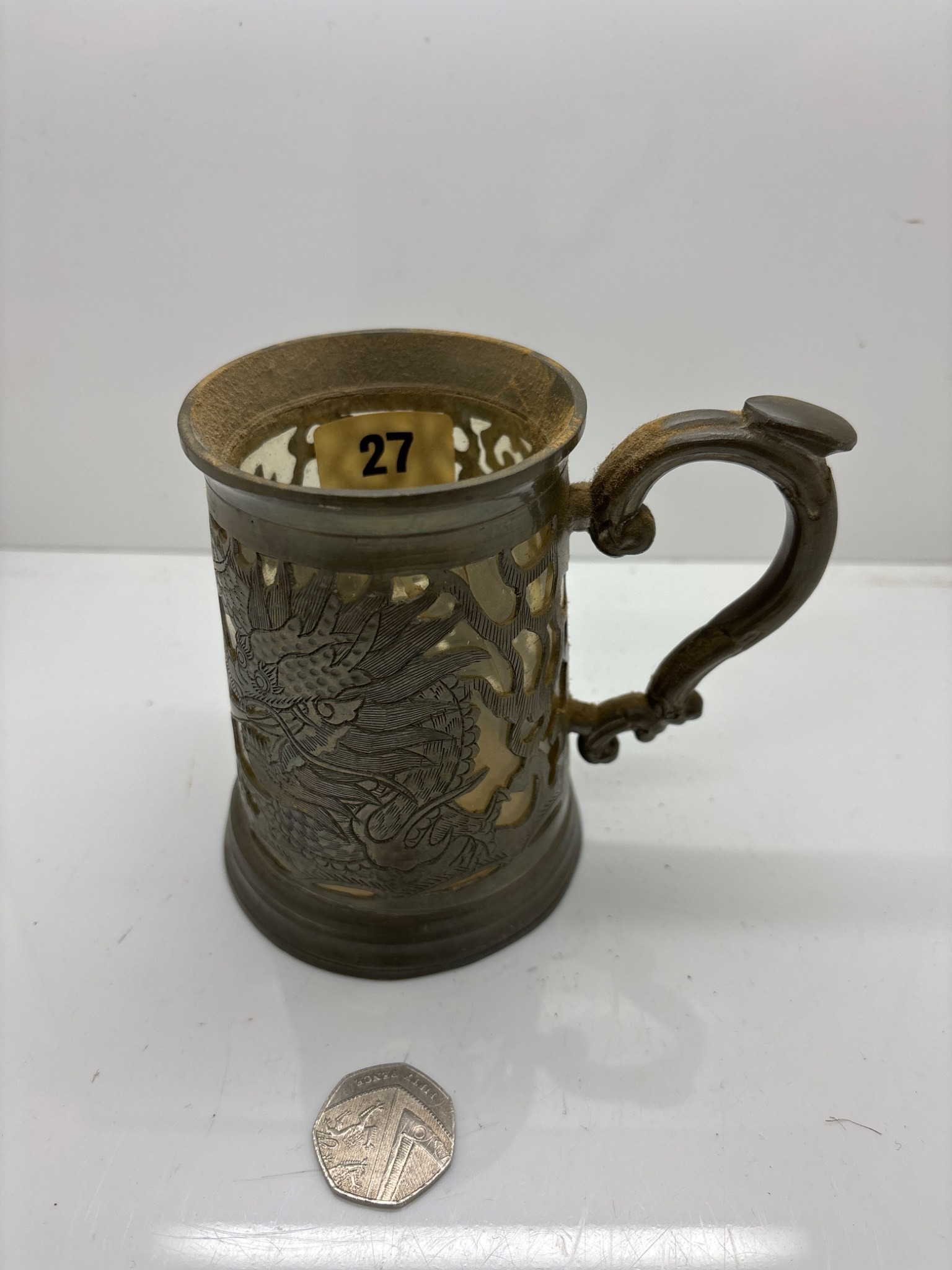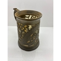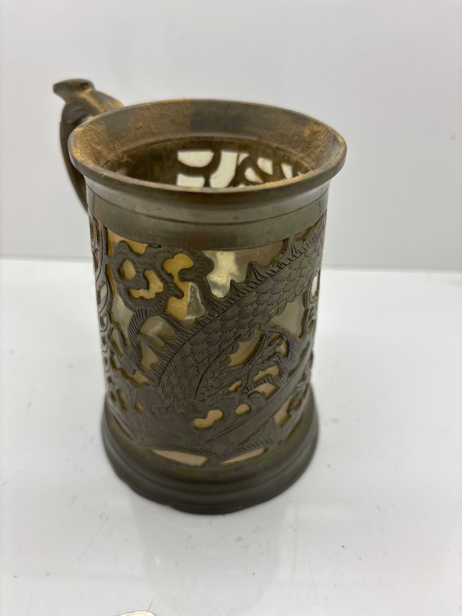 Decorative metal filigree mug with handle and ornate cut-out design. Approximate size shown for scale using a coin.
