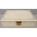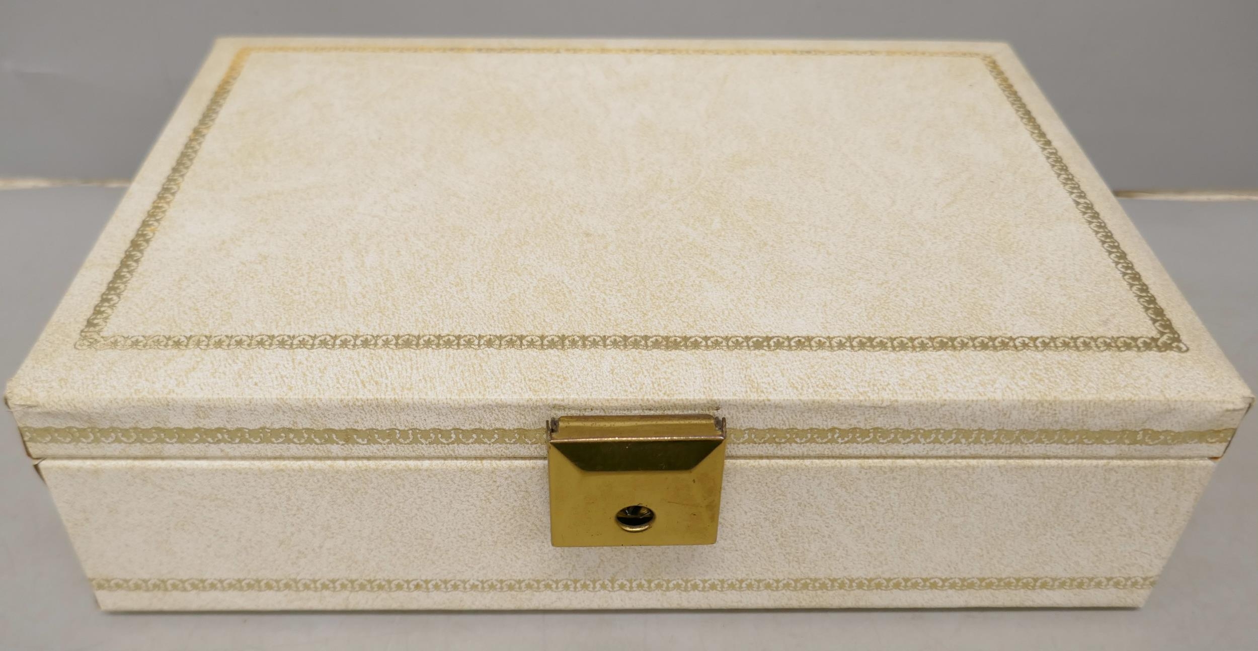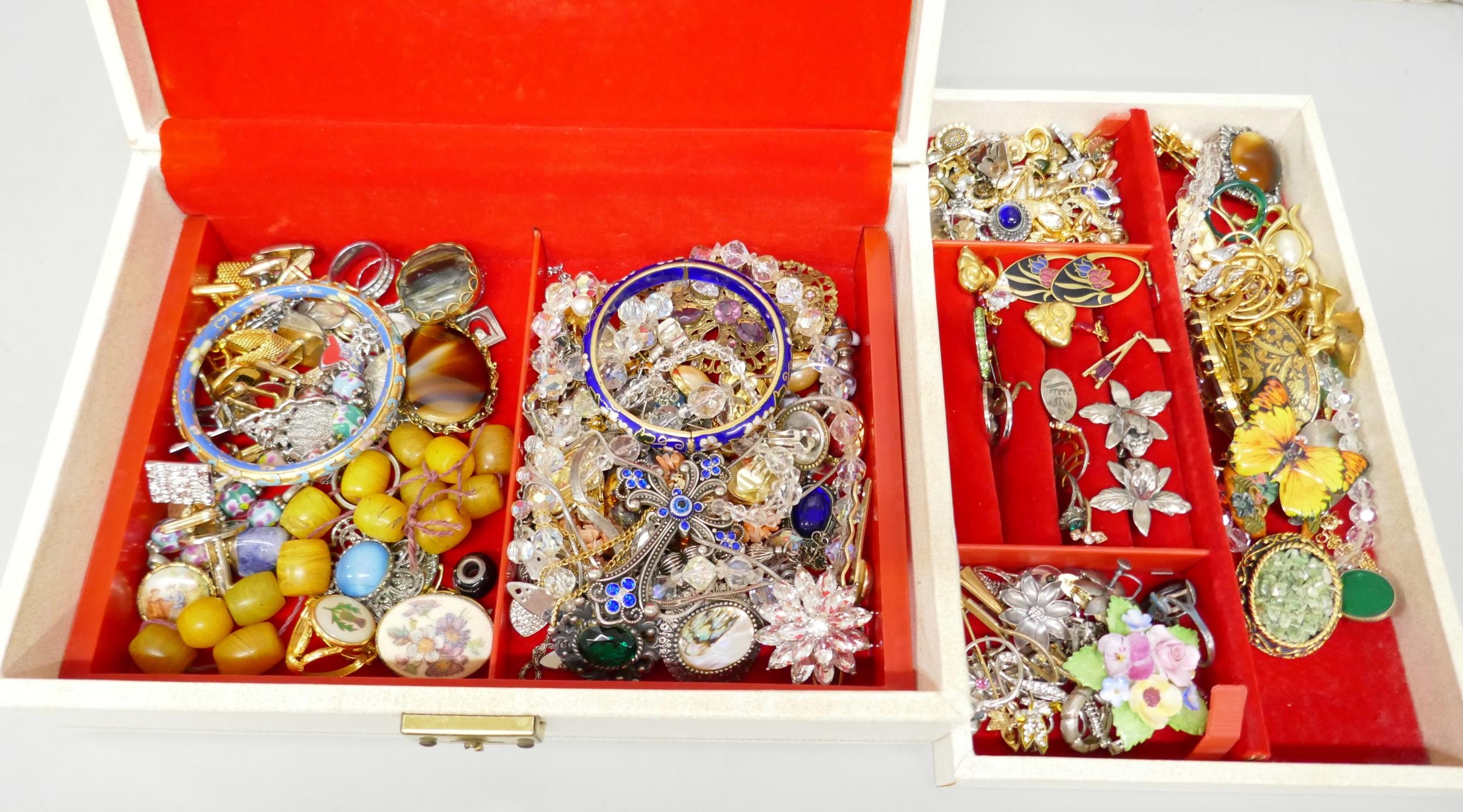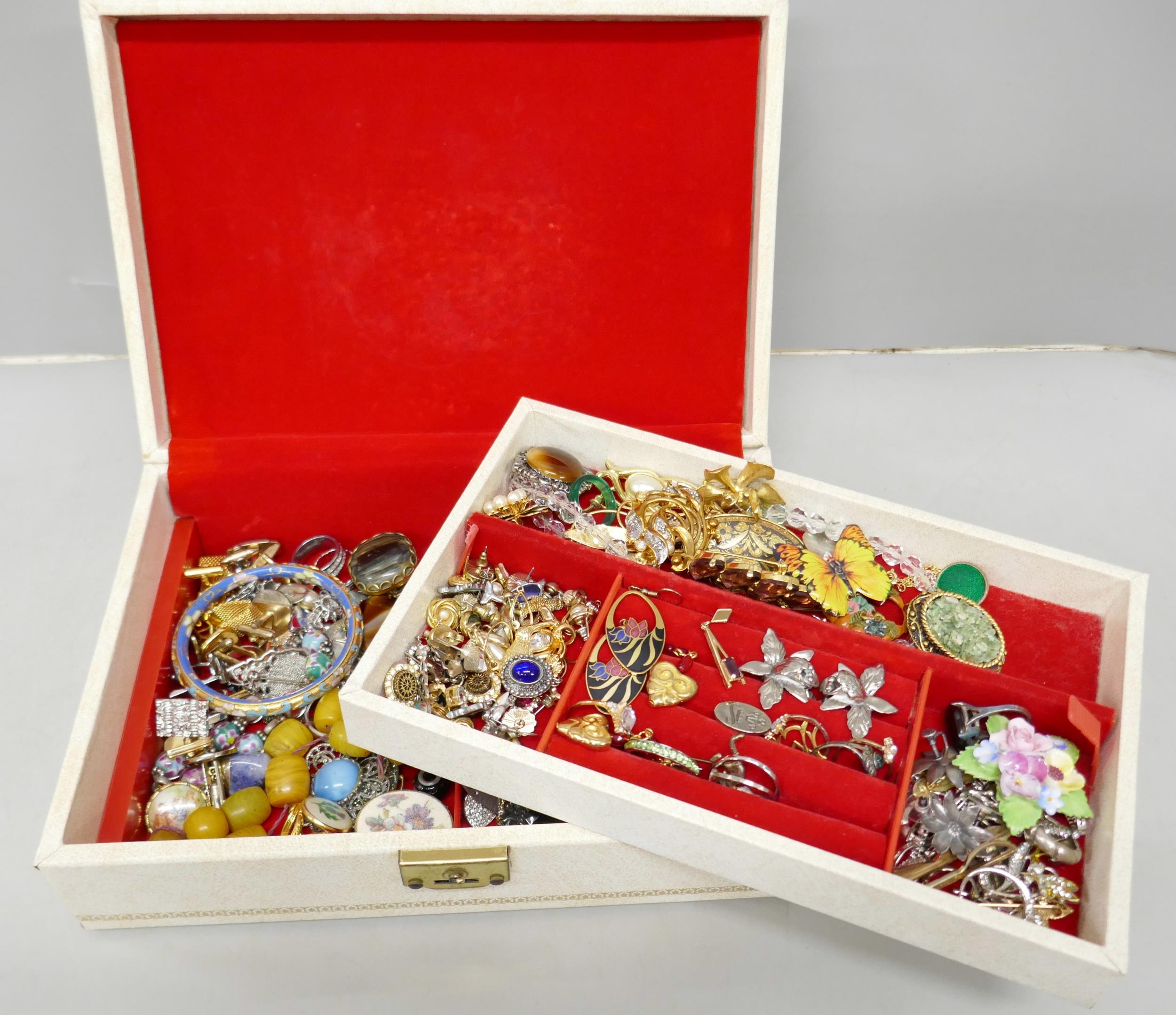 A cream jewellery box, with vintage and later costume jewellery, including rings, earrings, brooches, etc