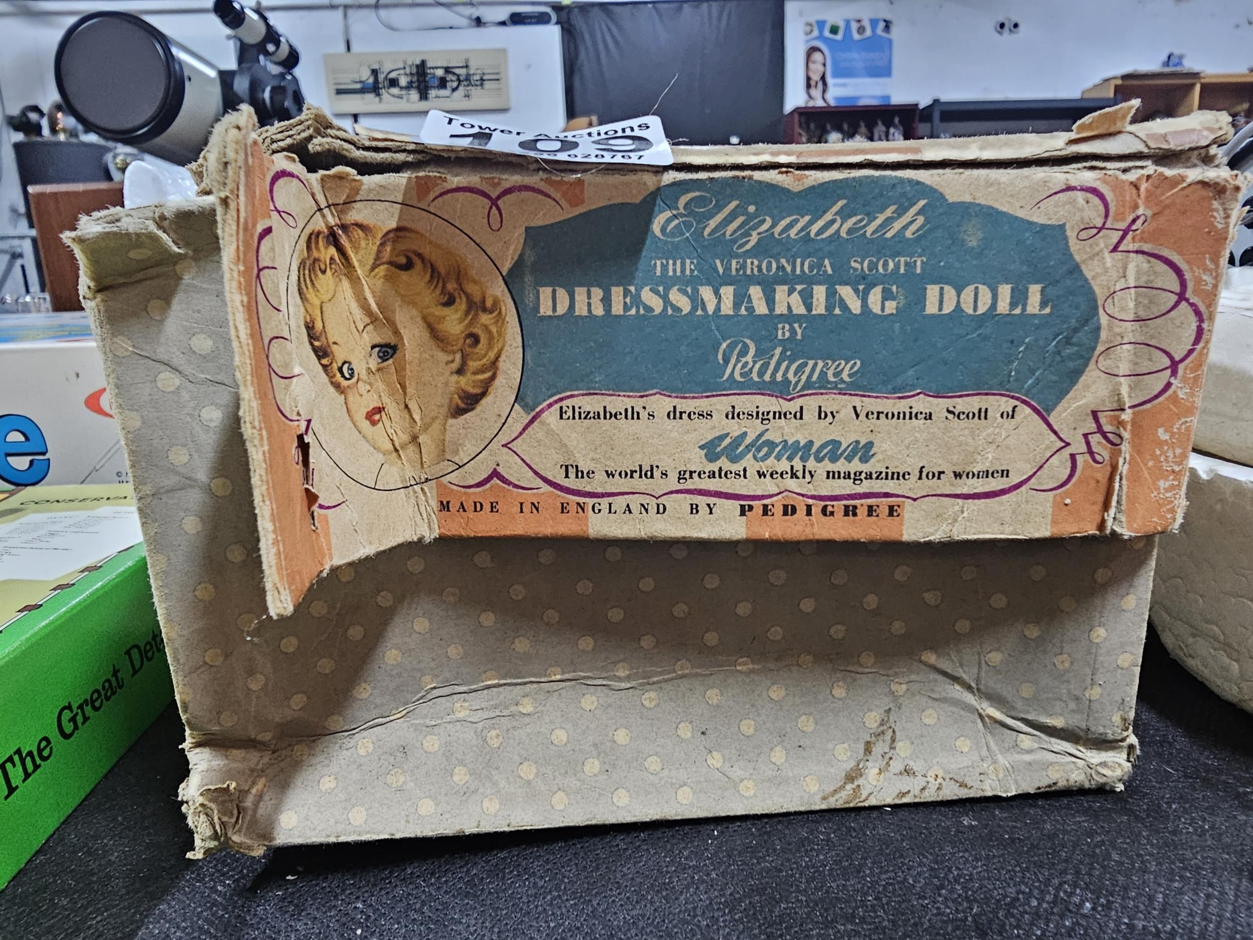 A good quality boxed Elizabeth Dress Making Doll, by Pedigree, tilted the Veronica Scott, Doll is in overall good condition, head and arm needs attaching complete with original vintage box