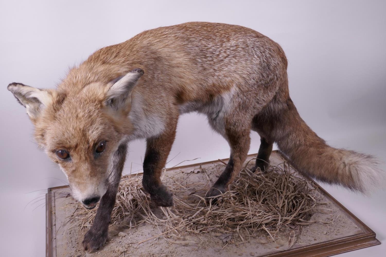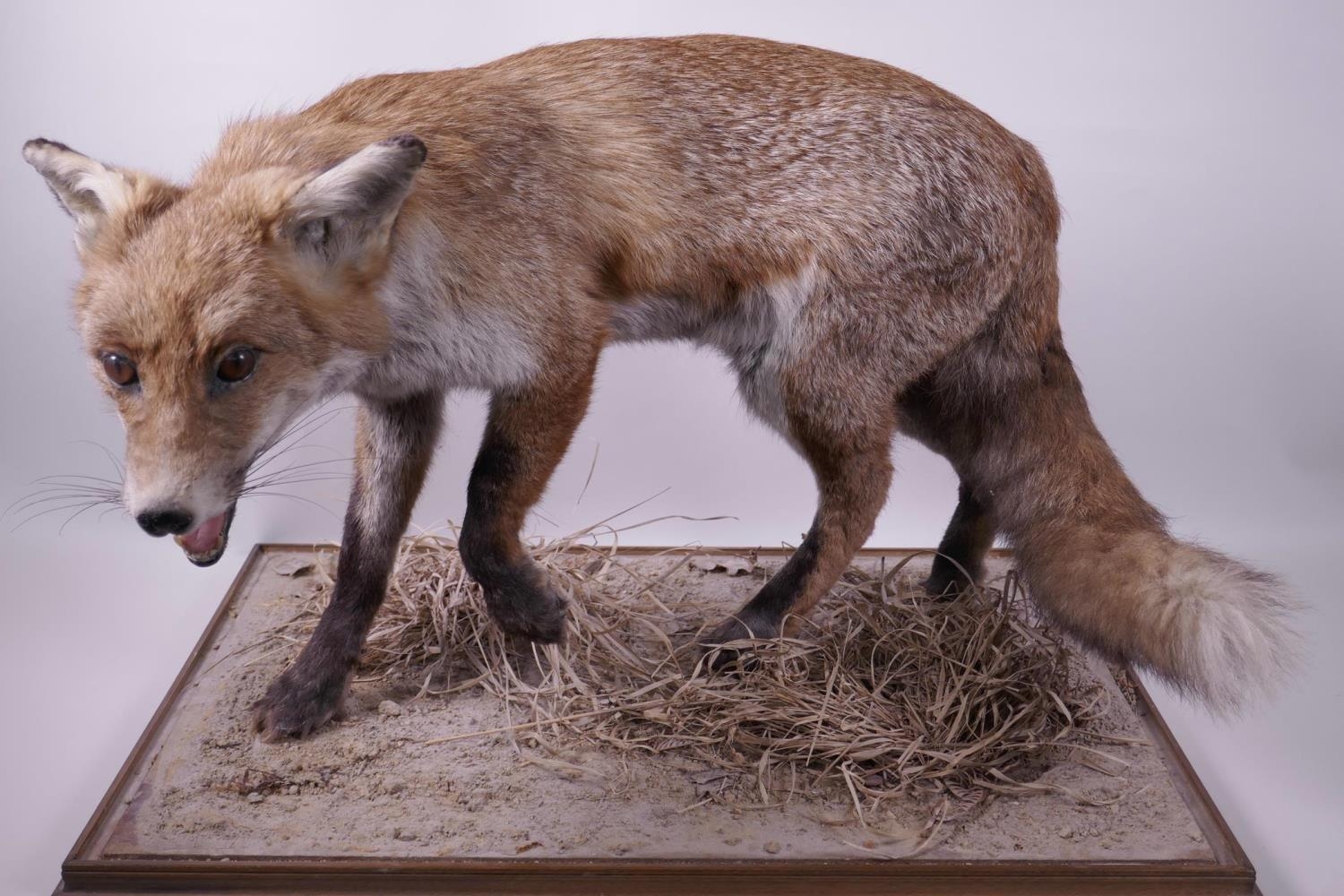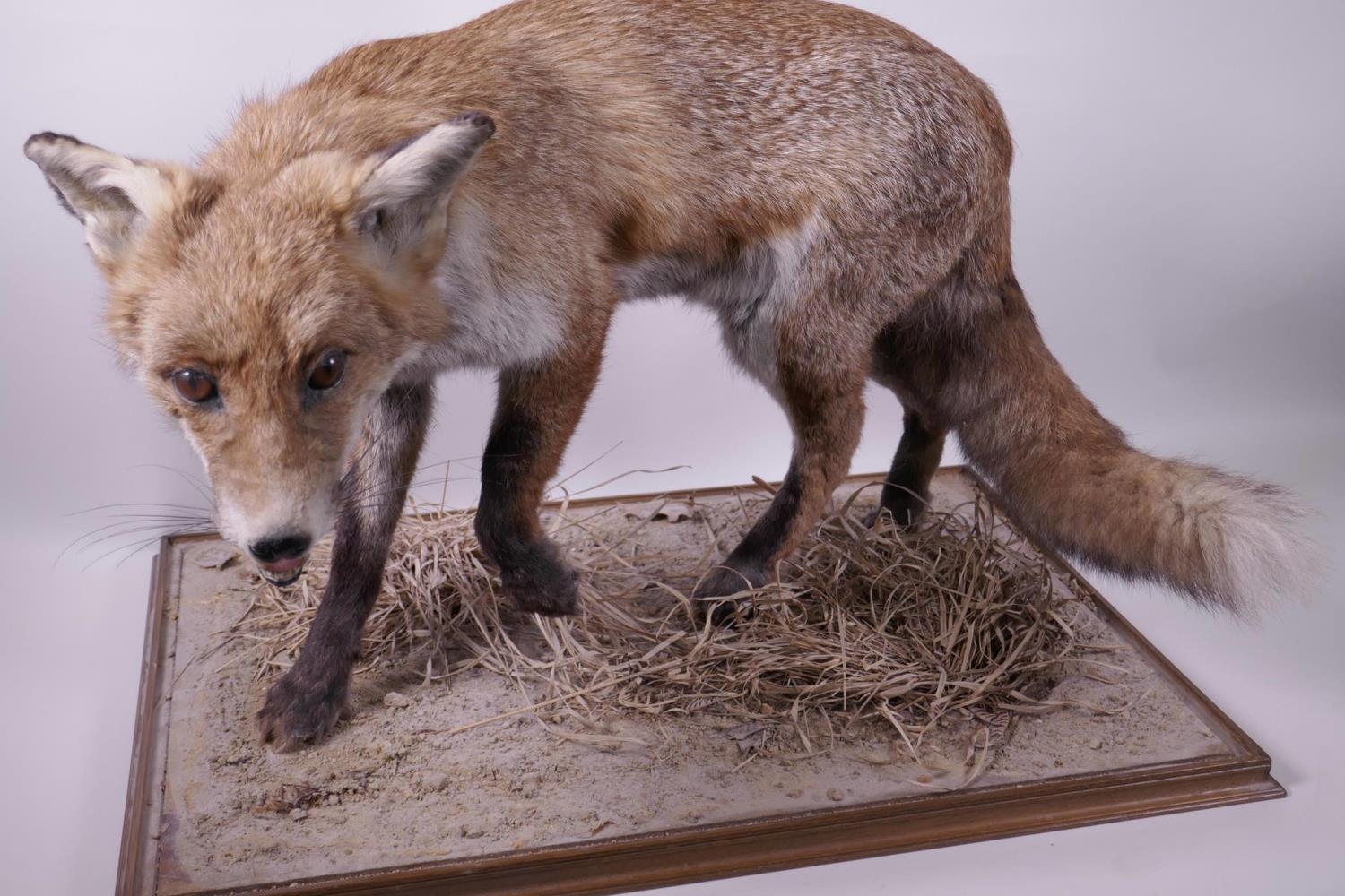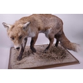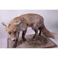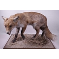 A mounted taxidermy specimen of a red fox, 15" high