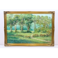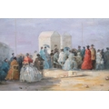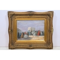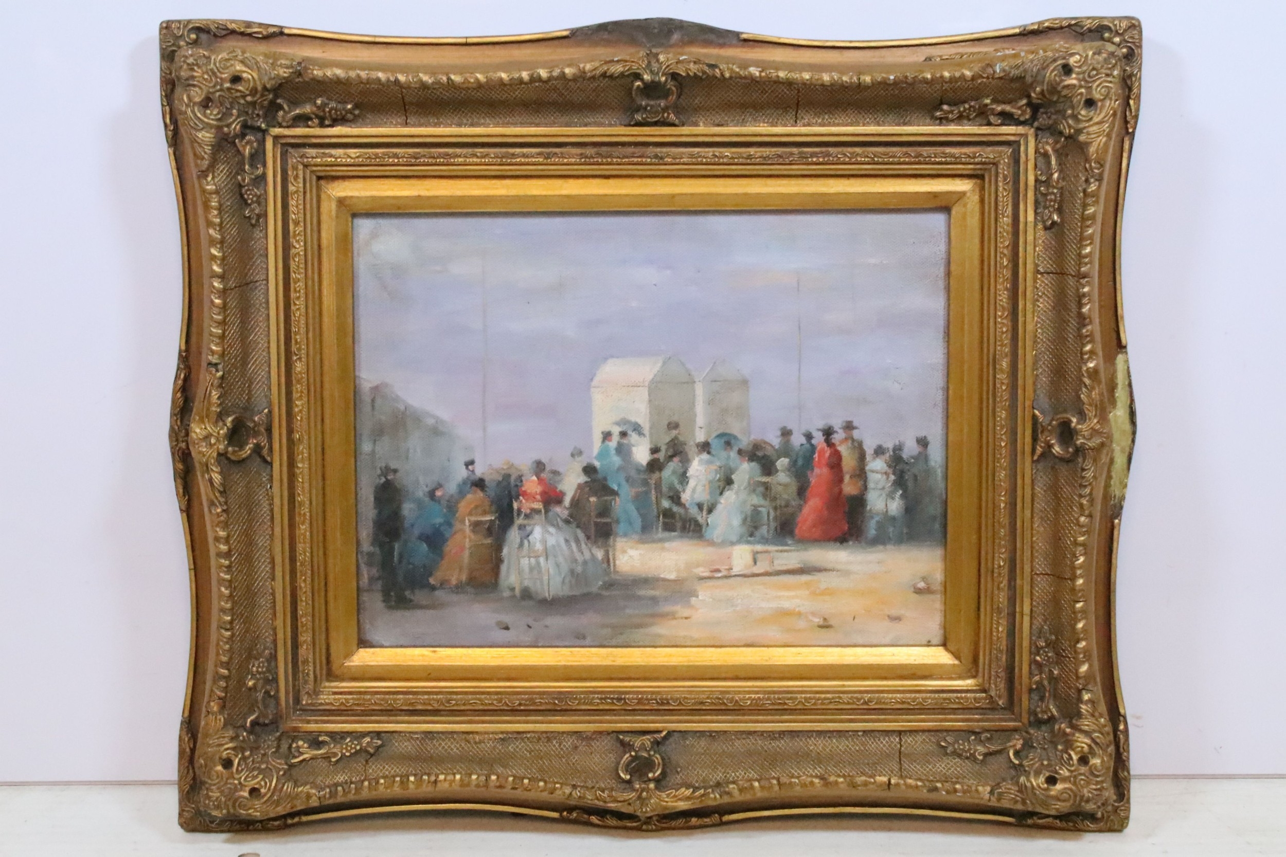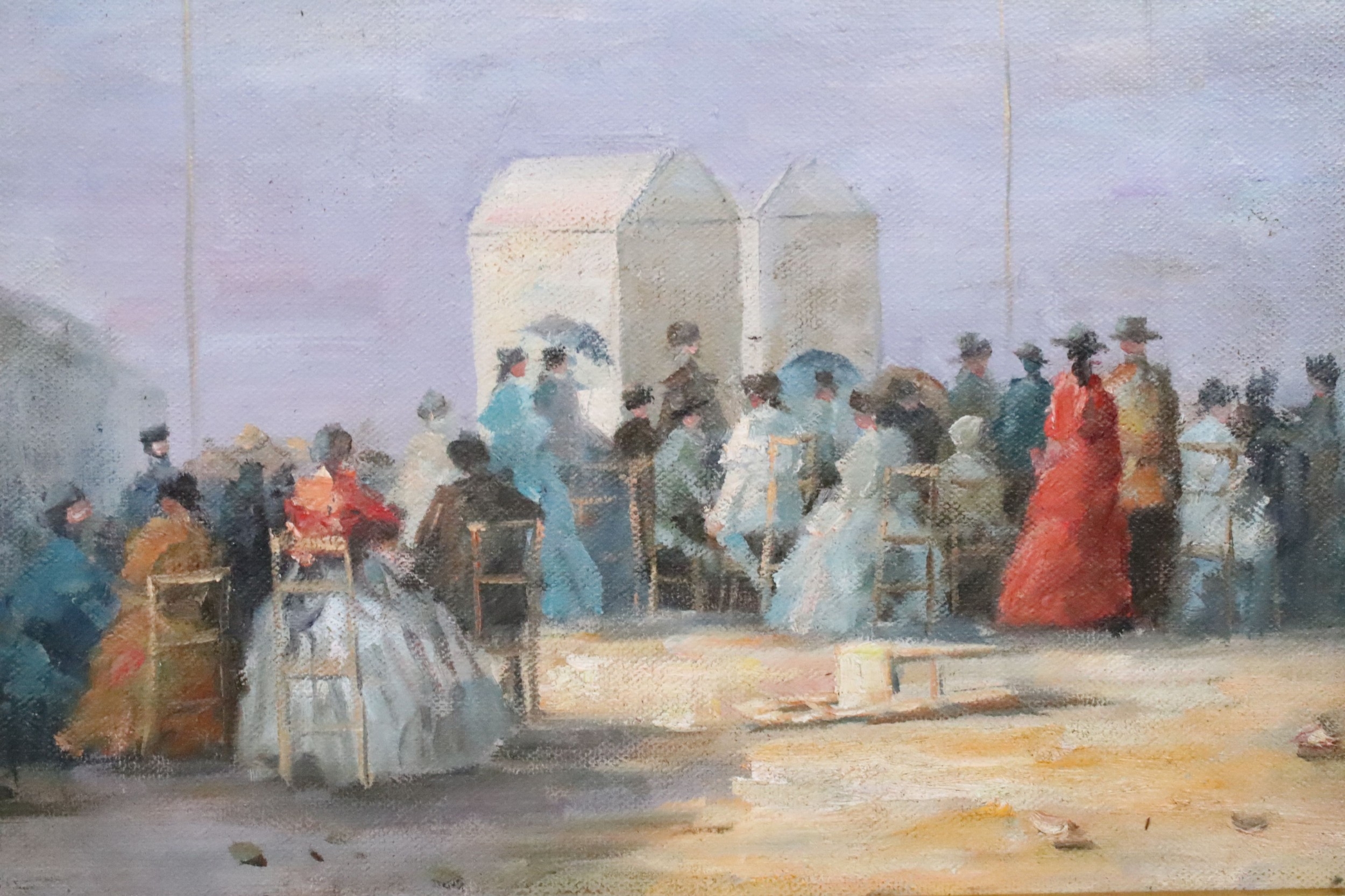Impressionist school, a busy beach view with figures and beach huts, 28.5 x 39.5cm, pierced gilt frame