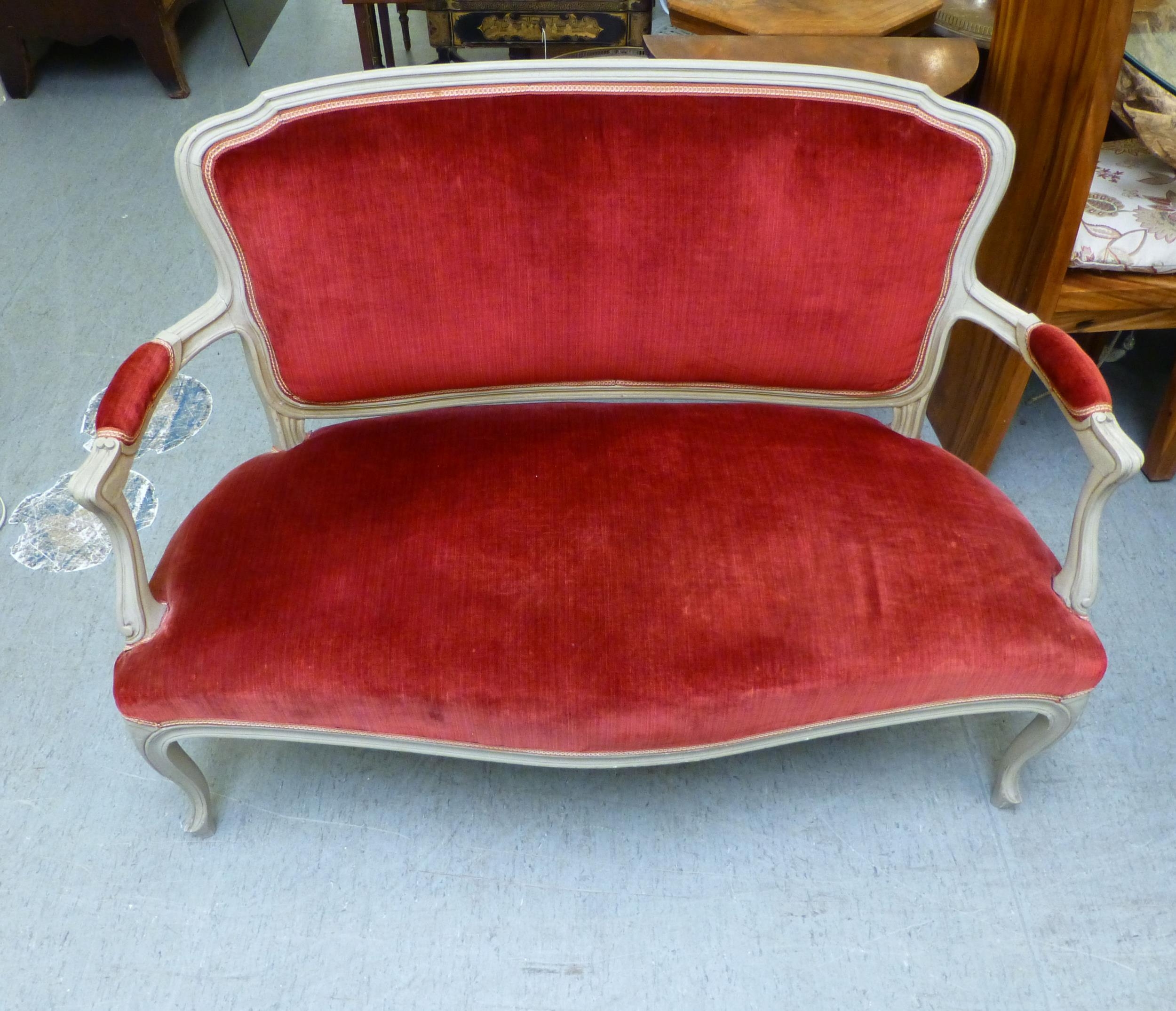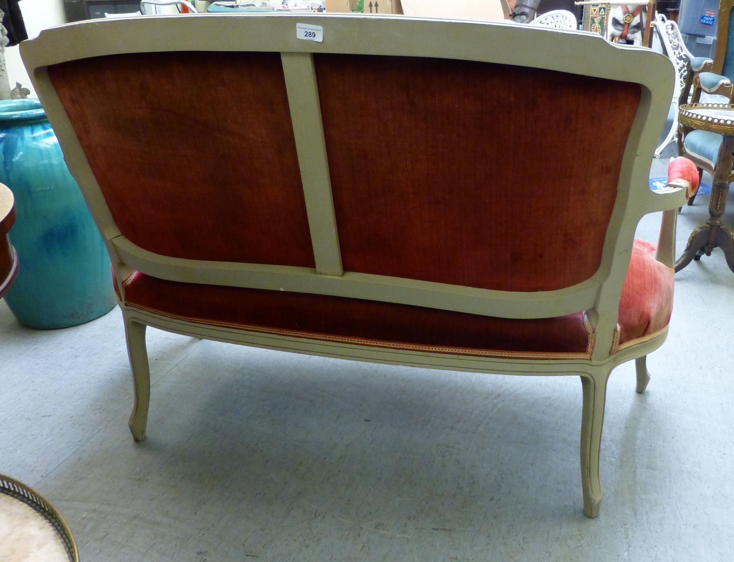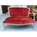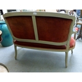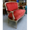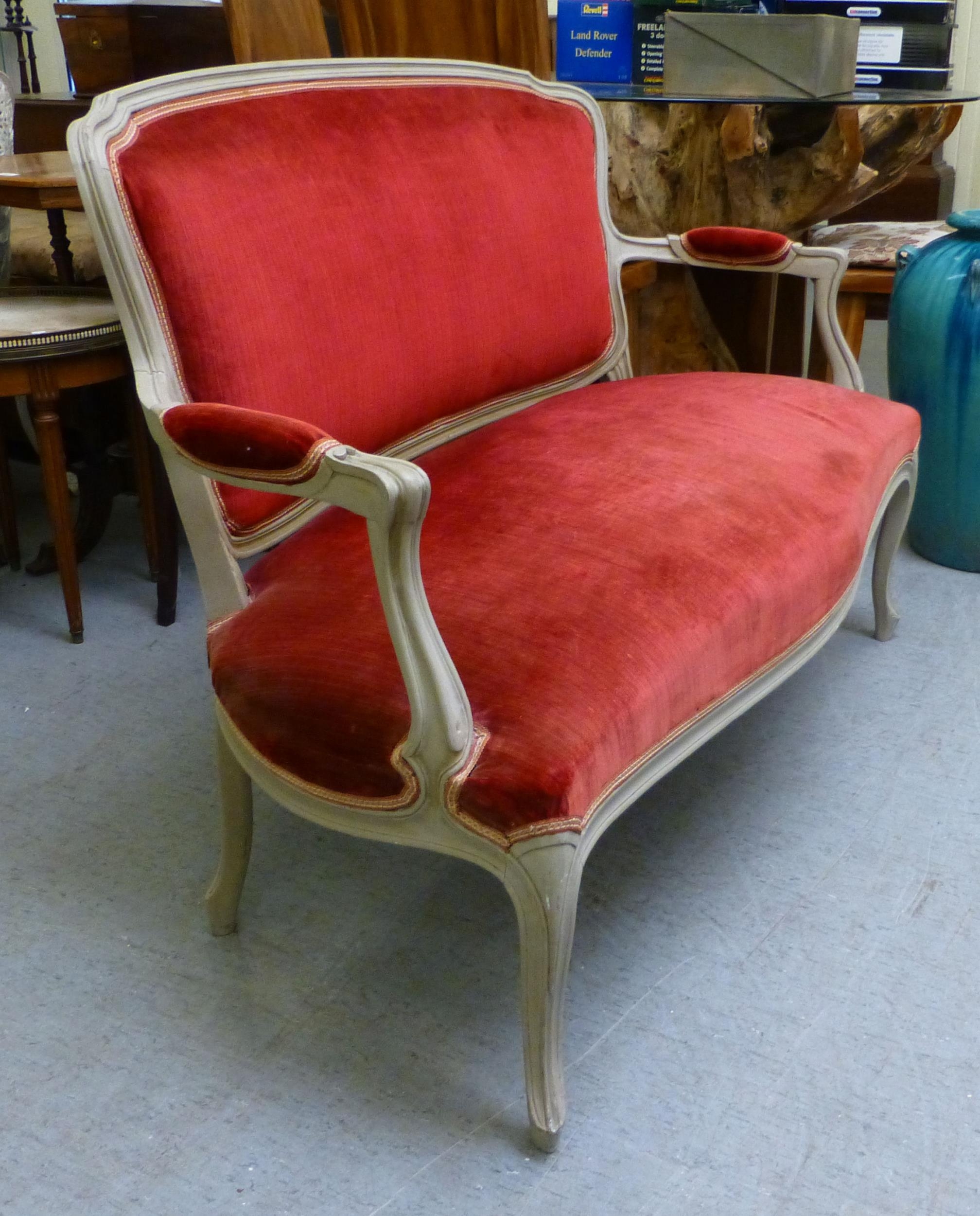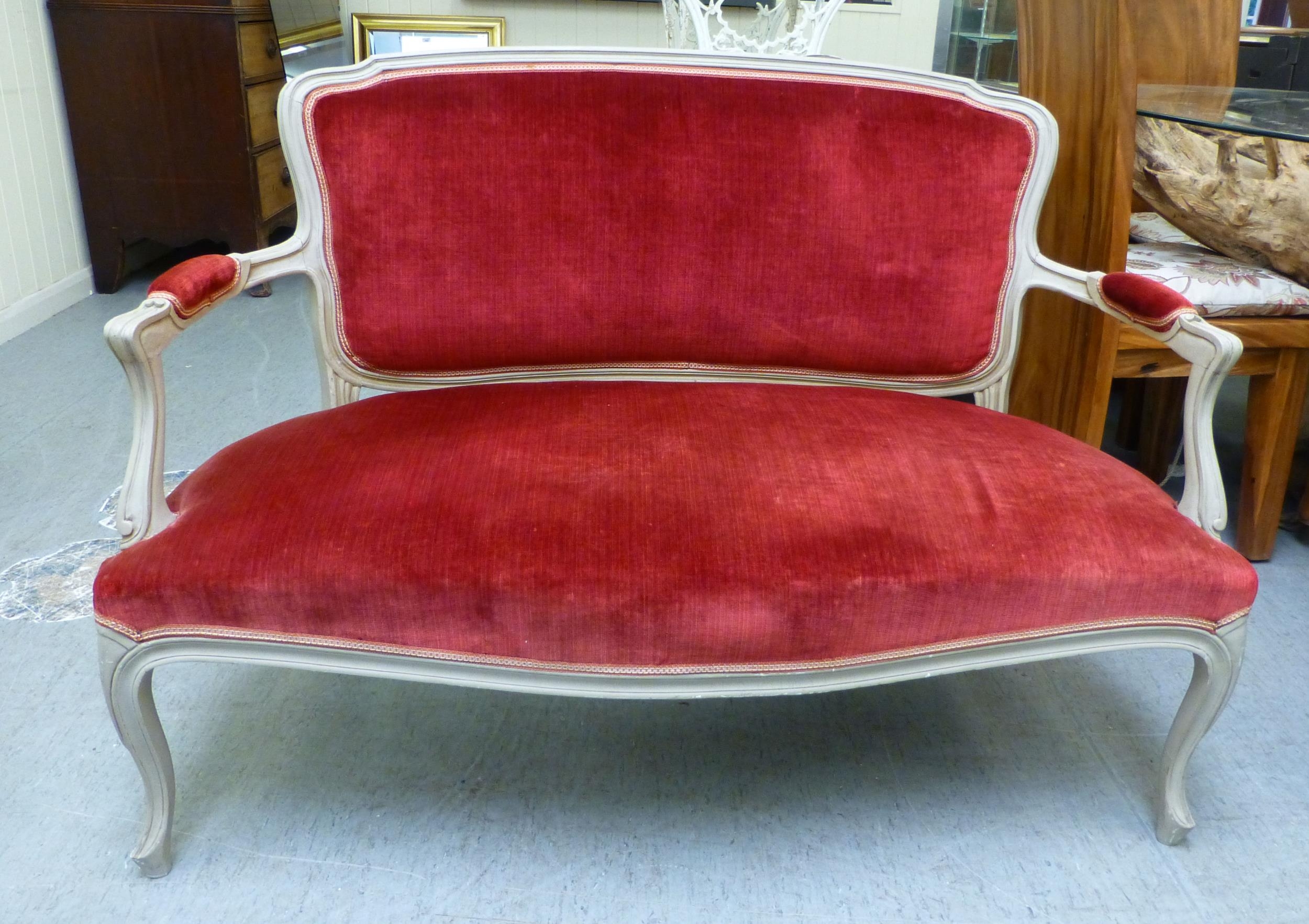 A modern Louis XVI design, grey painted salon settee with an upholstered back and seat, raised on cabriole legs